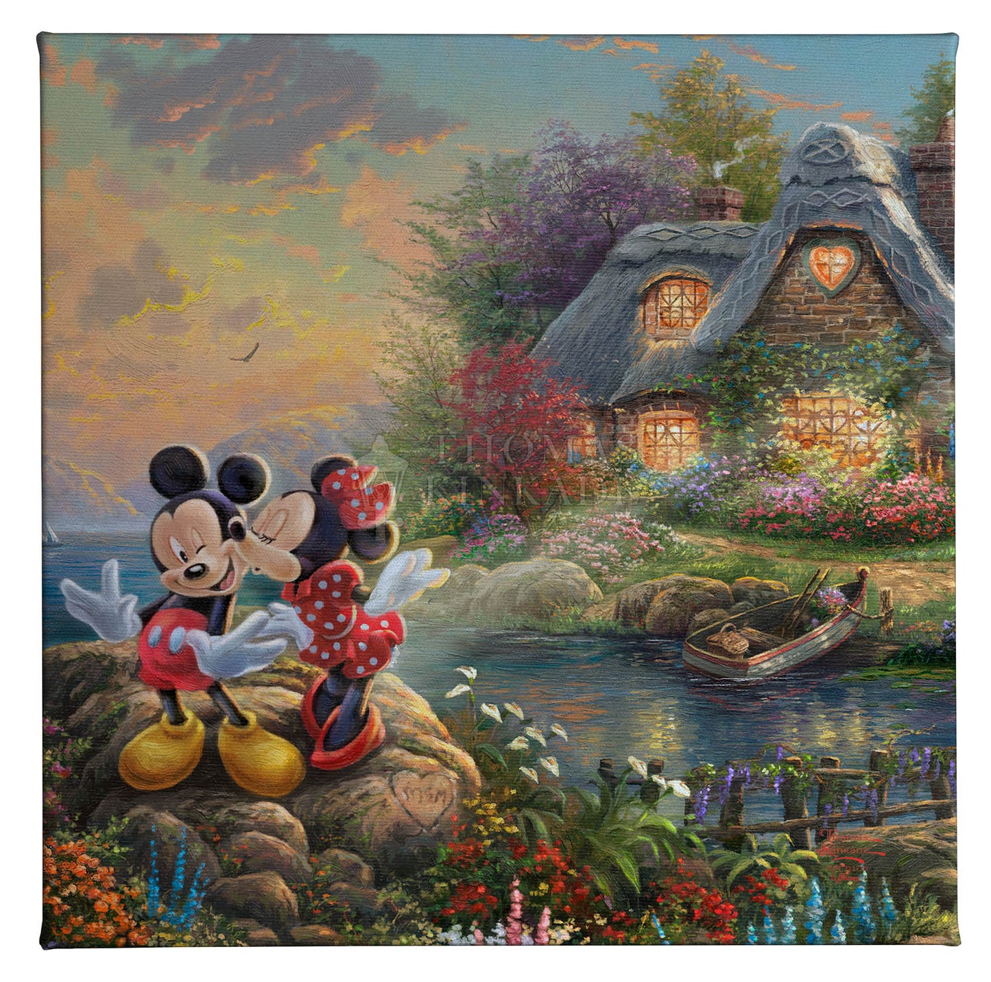 Thomas Kinkade was a life-long admirer of Walt Disney and the wonderful characters he created. While Thom re-created many of his favorite Disney stories on canvas, he also envisioned classic Disney characters set within traditional Kinkade images. In these paintings from Thomas Kinkade Studios, his dream is proudly brought to life. Mickey Mouse and Minnie Mouse stand on the edge of Sweetheart Cove. An afternoon boating outing has led them to this gentle inlet where a nearby cottage filled with family and friends await their arrival. But before going inside to join the revelry, they slip away to enjoy a quiet little moment between just the two of them. We hope that Mickey and Minnie - Sweetheart Cove will remind you to take a little time with someone special in your life today. © Disney © The Thomas Kinkade Estate – All Rights ReservedProduct Specifications