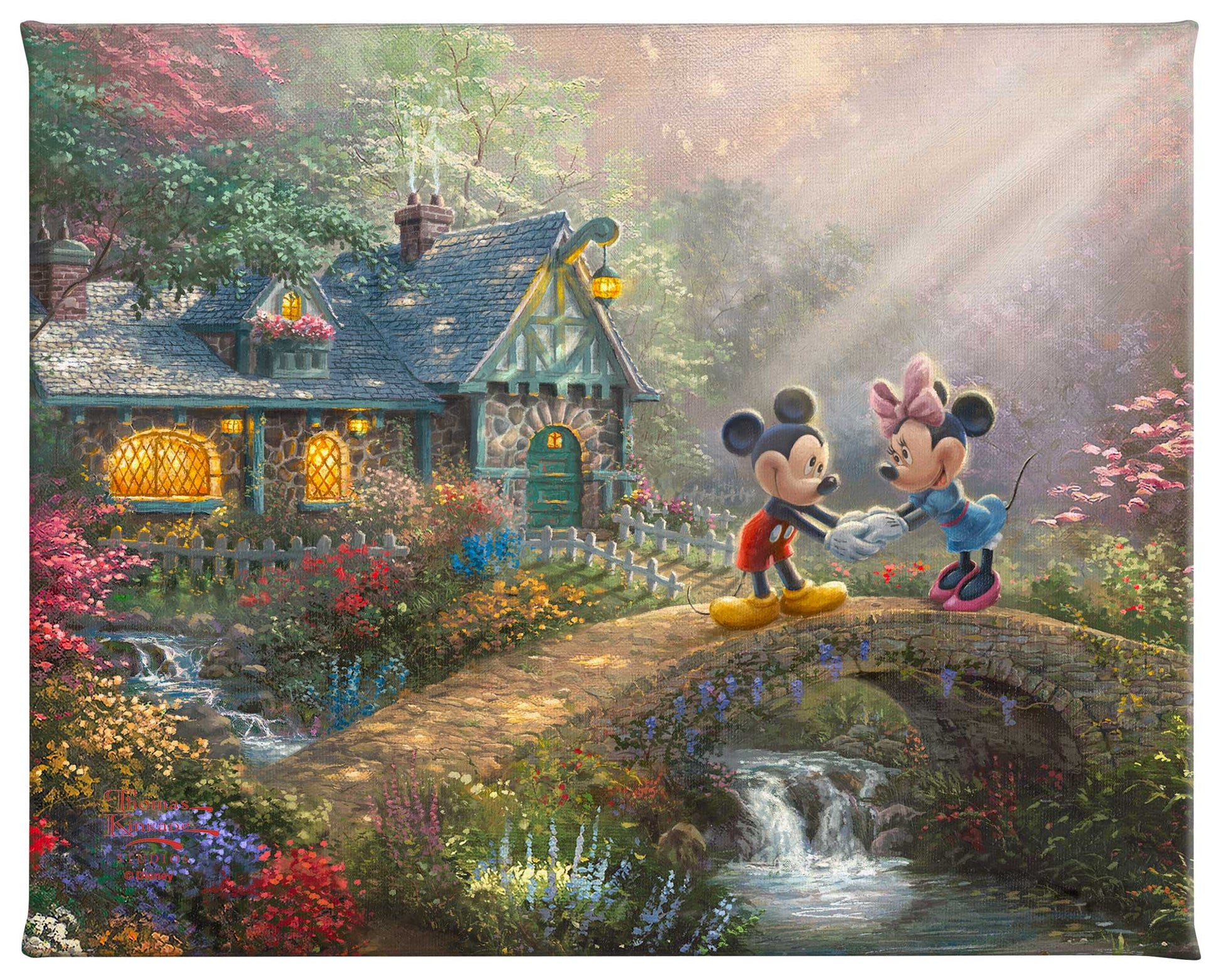 Thomas Kinkade was a life-long admirer of Walt Disney and the wonderful characters he created. While Thom re-created many of his favorite Disney stories on canvas, he also envisioned classic Disney characters set within traditional Kinkade images. In these paintings from Thomas Kinkade Studios, his dream is proudly brought to life.Mickey Mouse and Minnie Mouse join hands on Sweetheart Bridge. Has Mickey come courting to Minnie's home? Surrounded by a flower-filled countryside, love appears to be in the air.