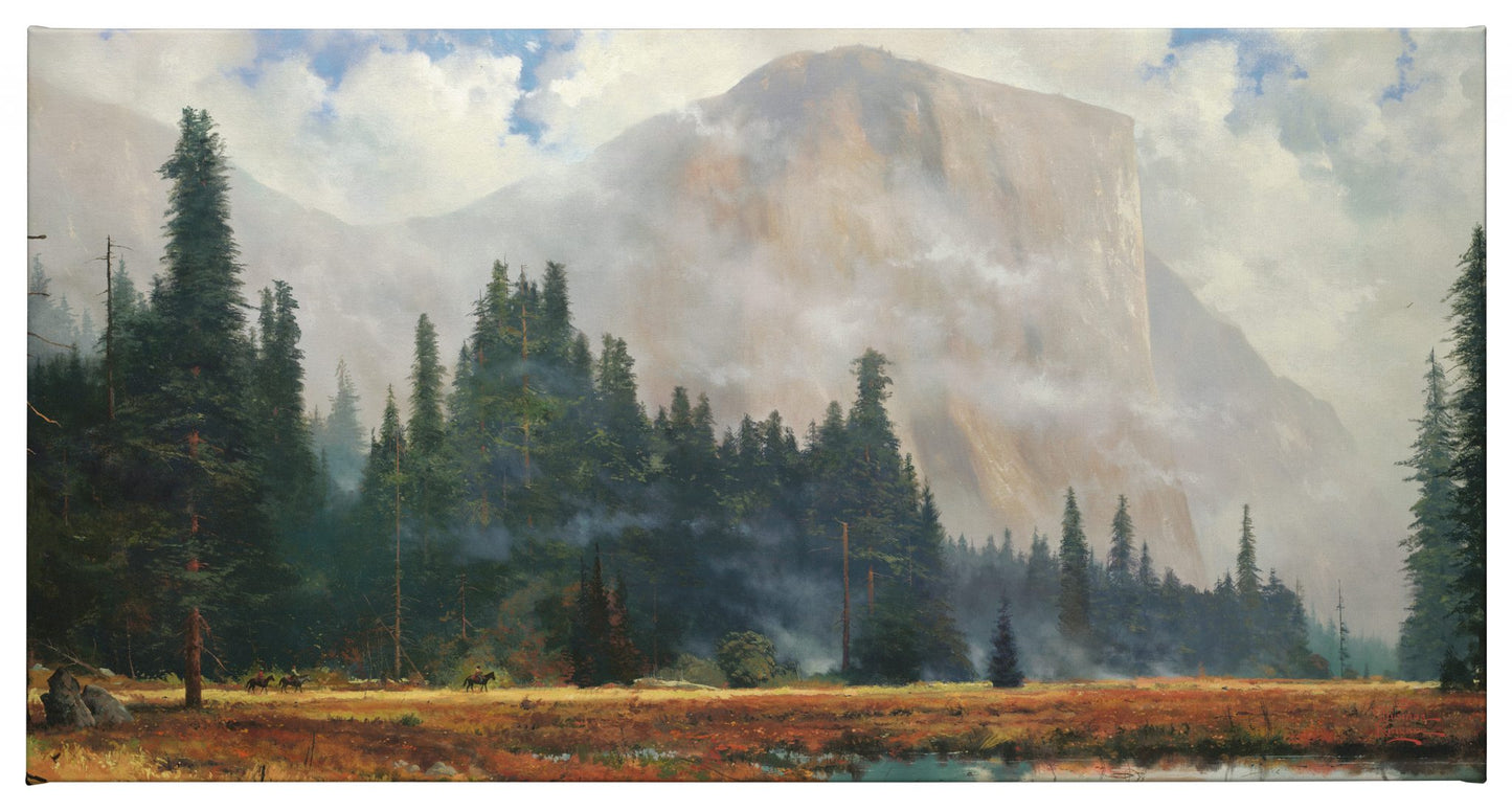 There are few places on Earth that are more awe-inspiring than Yosemite Valley nestled in the Sierra Nevada Mountains. Home of the undisputed King of the valley is "El Capitan", an exposed rock face of unmatched size that serves as silent sentinel presiding over the majesty of Yosemite's other natural wonders. As I painted I would often muse, "You see the face of God in nature"in the mountain vista. You hear Him in the rustle of the wind in the trees"taste, smell and feel Him in the fragrance of flowers and in the sweet air and water found in the cathedral of the wild." Indeed, there is no more profound visual exposition of this soul-searched sentiment than in the painting, Yosemite Meadow. In this oil, riders are dwarfed against the glory of the background as perspective to man's place in creation and in relation to their Creator. As I completed Yosemite Meadow, I counted each day as a blessing and took in the full glory of God's creation. © The Thomas Kinkade Estate – All Rights ReservedProduct Specifications