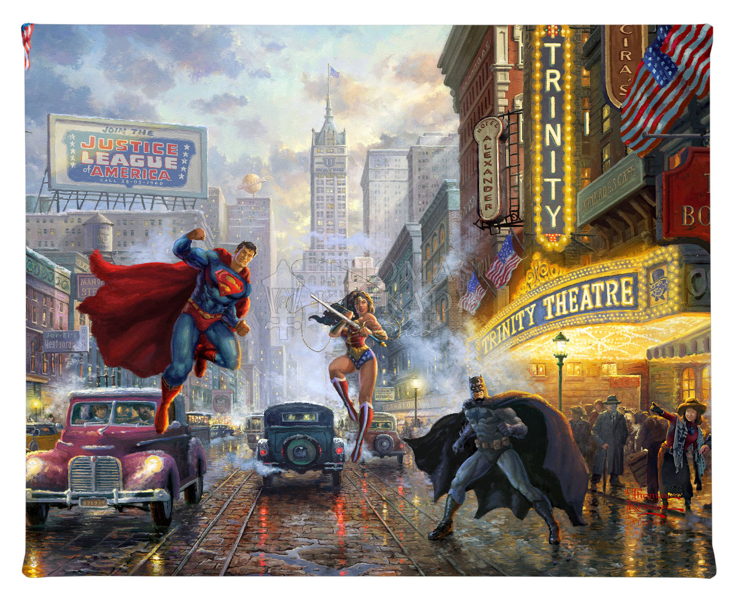 Together, Batman, Superman and Wonder Woman™ form an epic alliance of DC Super Heroes, often referred to as "The World’s Finest Trinity". Individually, they are some of the most powerful characters in the comic book universe, and united, they are virtually unstoppable. Fans around the globe have long celebrated their bond and their legendary stories. The Thomas Kinkade Studios is proud to present Batman, Superman, and Wonder Woman: The Trinity I, our first Limited Edition Art release paying homage to classic DC characters. In this scene, the trio is preparing to fight an enemy in a place that evokes iconic memories from each hero’s personal history. From arch enemies and beloved friends to important dates, we invite you to explore the hidden salutes we have included in this painting. JUSTICE LEAGUE and all related characters and elements © & ™ DC Comics. (s19) © The Thomas Kinkade Estate – All Rights Reserved
