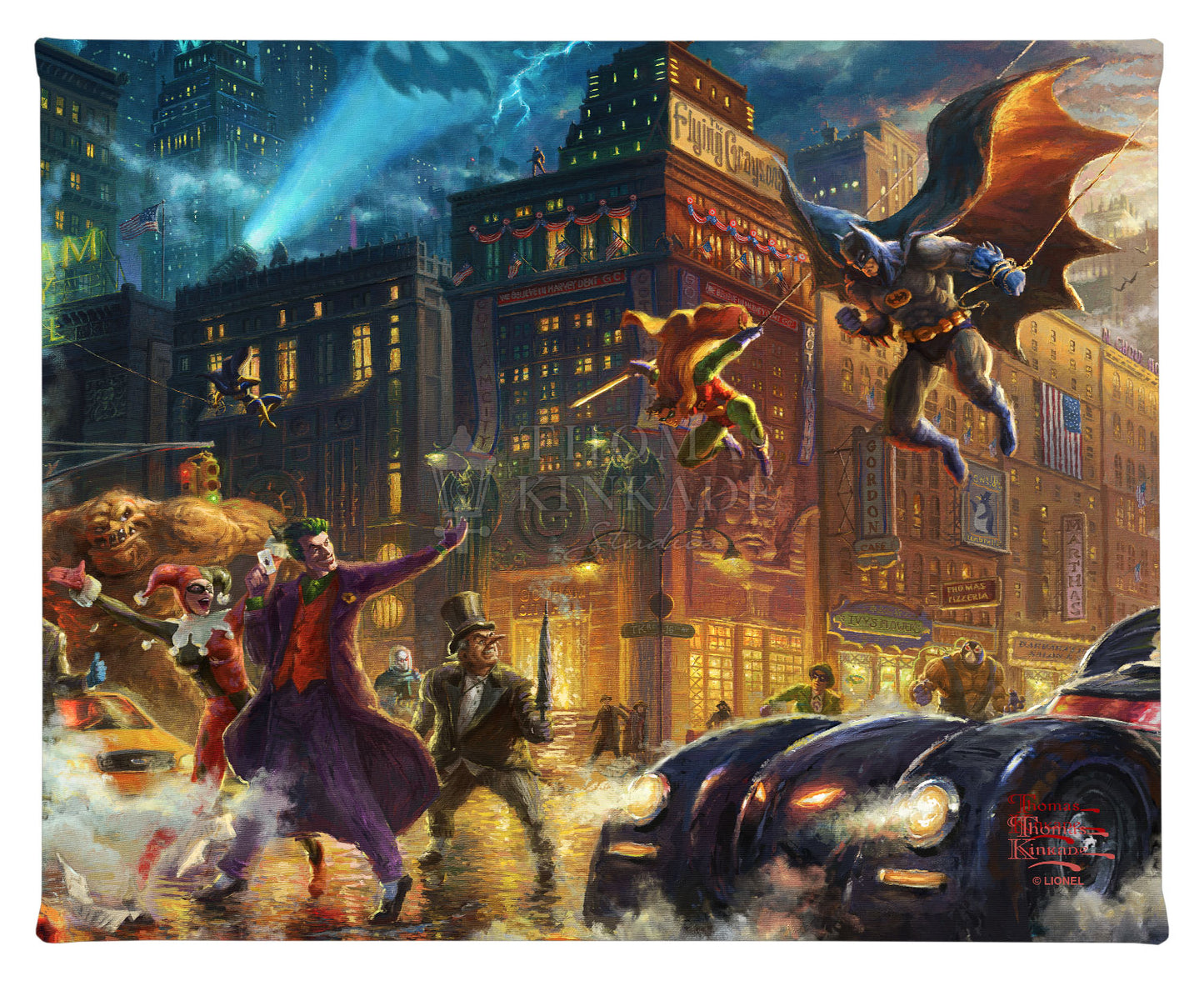 Led by The Joker, the worst villains from Gotham City have escaped Arkham Asylum, bringing mayhem, violence, and destruction to the streets. Only one person can stop these criminal monsters – the Dark Knight. In The Dark Knight Saves Gotham City, the true strength of Batman’s power is made manifest. Summoned to Gotham City by the Bat-Signal, the Caped Crusader and his sidekick Robin face a formidable challenge as their most evil nemeses have joined forces. The Joker, Harley Quinn, The Penguin, Mr. Freeze, Two-Face, Poison Ivy, Scarecrow, and their band of evil masterminds are stopped dead in their tracks as the heroes arrive. As lightning races across the city skies, the Dark Knight and his companion prepare to fight an epic battle to save the citizens of Gotham City – a battle that the world’s most power crime fighters will undoubtedly win. BATMAN and all related characters and elements © & ™ DC Comics. (s19) © The Thomas Kinkade Estate – All Rights ReservedProduct Specifications