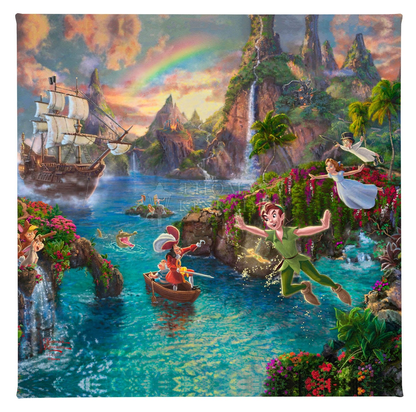 Peter Pan's Never Land by Thomas Kinkade Studios captures the adventure of the magical place that Peter Pan and his friends call home. In this scene, we see Peter battling his nemesis Captain Hook, with the help of Wendy, Michael, John, The Lost Boys, and his beloved pal Tinker Bell. The friends fly together with faith and a dash of pixie dust, while the Mermaids look on and a beautiful rainbow sits brightly in the sky. This painting reminds us that although we may grow up, we should view the world with the wonderment of a child, no matter our age. It also reinforces the fact that the bonds of a true friendship can lift us up throughout our lives. © Disney © The Thomas Kinkade Estate – All Rights Reserved