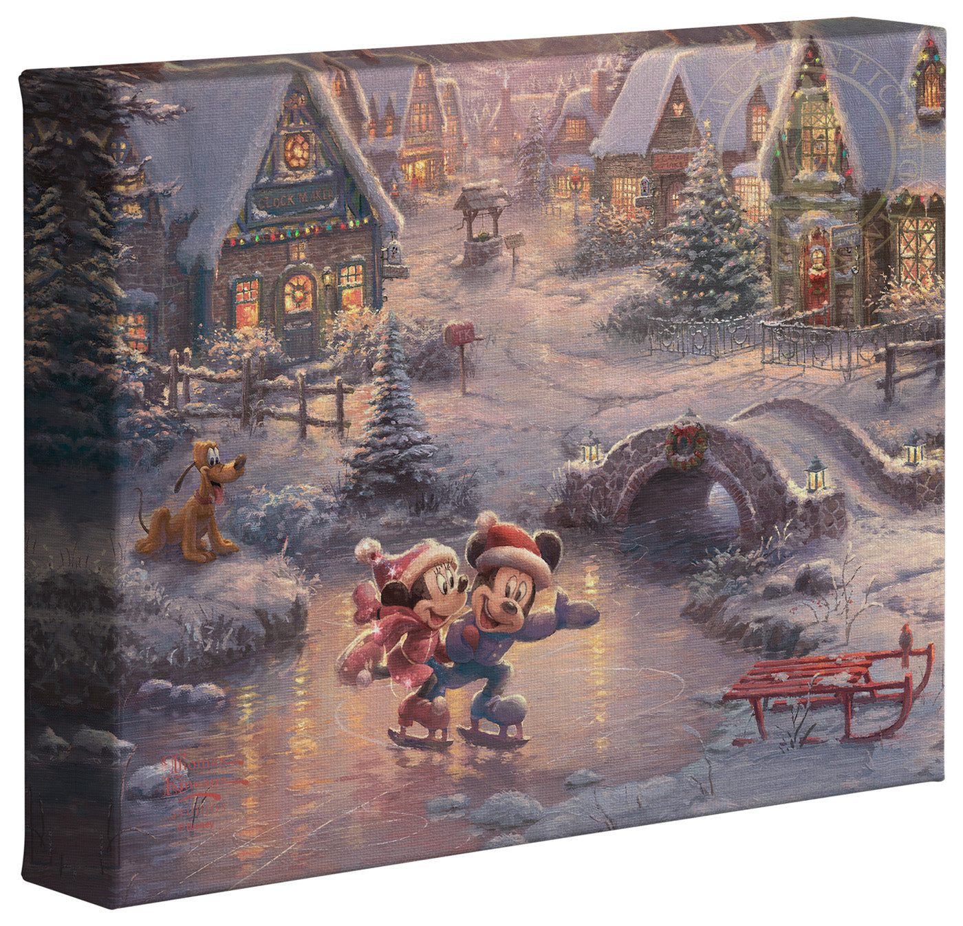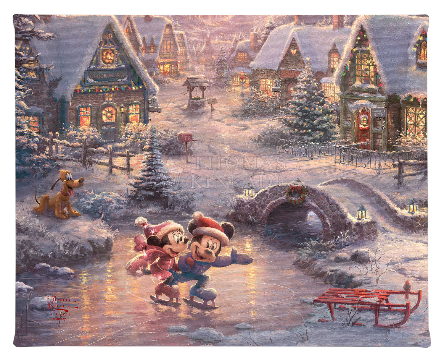 Thomas Kinkade was a life-long admirer of Walt Disney and the wonderful characters he created. While Thom re-created many of his favorite stories on canvas, he also envisioned classic Disney characters set within traditional Kinkade images. In these paintings from Thomas Kinkade Studios, his dream is proudly brought to life. In this beautiful winter scene, Mickey Mouse and Minnie Mouse joyfully skate across a frozen pond, celebrating the magic of the Holidays together. Along with their friends, they have festively decorated “Mickey’s Square” with lights, wreaths, bows, a snowman, and all that makes the Holidays bright! Although it is cold outside, the skaters are warmed by friendship and love as they enjoy the wonders of the season together. We wish you a Happy Holiday, and we hope that Mickey and Minnie – Sweetheart Holiday inspires you to create special memories with the important people in your life. © Disney © The Thomas Kinkade Estate – All Rights Reserved