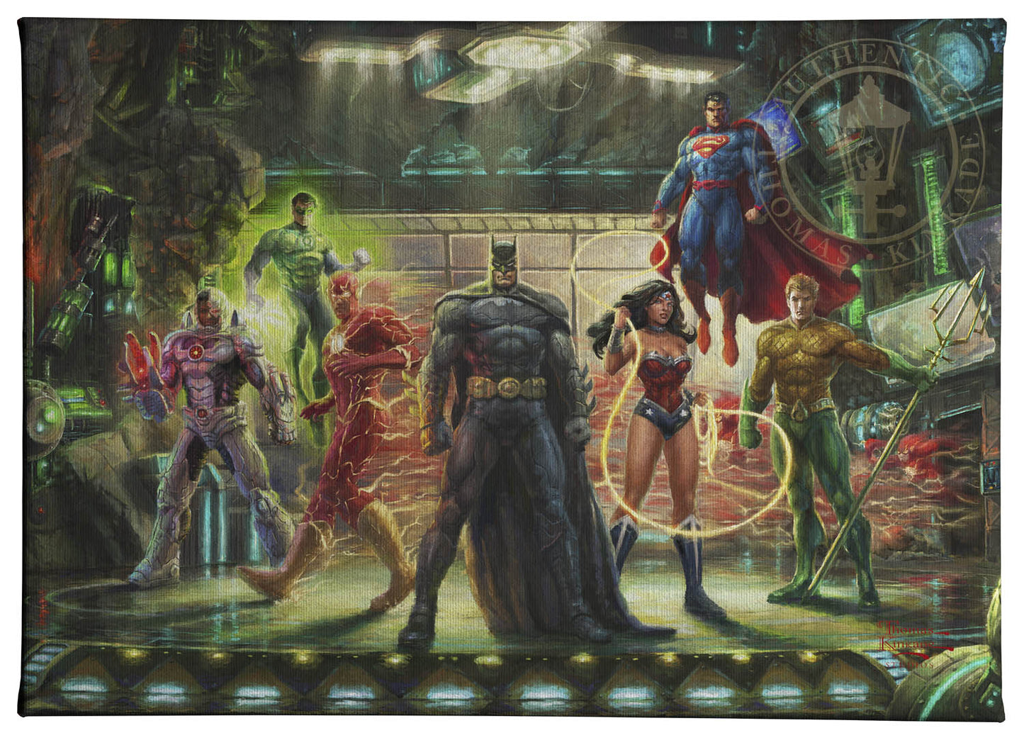For decades, DC fans have been kept on the edge of their seats with the heroic tales of this high-flying action-packed ensemble. Now the entire team, in all their glory, is depicted in an electrifying painting by Thomas Kinkade Studios - The Justice League. This scene is set inside their legendary Secret Sanctuary. Here they prepare, standing poised and ready to protect the world from anything and anyone that threatens its safety. JUSTICE LEAGUE and all related characters and elements © & ™ DC Comics. (s19) © The Thomas Kinkade Estate – All Rights ReservedProduct Specifications