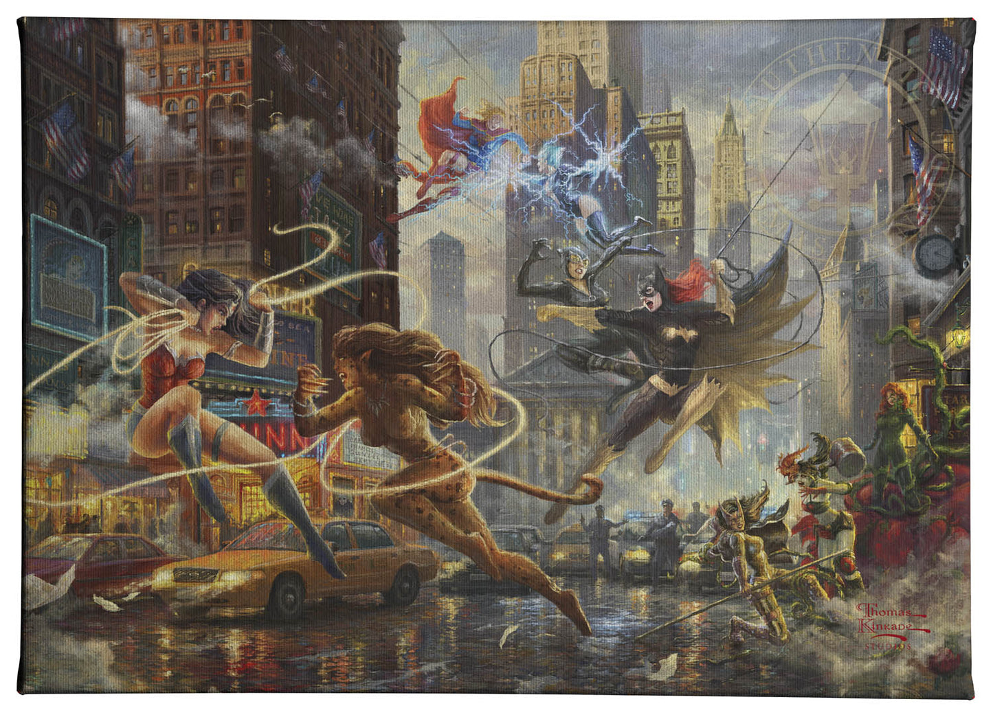Brace yourself for a high-energy collision! Thomas Kinkade Studios chronicles the action-packed encounter between some of the world’s most beloved female Super Heroes and their adversaries, all in one dramatic scene - The Women of DC. As the city’s local police force stands helplessly watching, conflict ensues. The Women of DC blends the Kinkade-style of warmly lit storefronts and glossy streets, with DC’s electric line up, to produce a dynamic collector’s piece. THE WOMEN OF DC - All DC characters and elements © & ™ DC Comics. (s19) © The Thomas Kinkade Estate – All Rights Reserved