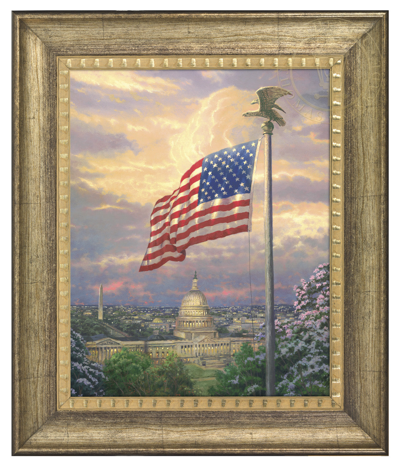 America's Pride, the first piece in my new 'Flags Over America' collection, features the same dramatic sky and waving flag seen in my previous painting, while below I pay tribute to the most patriotic of all American cities - our nation's capitol.© The Thomas Kinkade Estate – All Rights Reserved