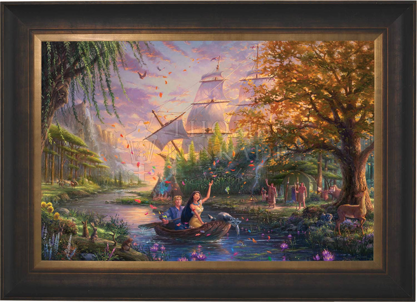 As the evening sun retreats beyond the ship, Susan Constant, and the horizon, a new love is forming between two distant worlds. The artists at Thomas Kinkade Studios have brilliantly captured one of Disney's most successful box office hits in one scene entitled, "Pocahontas - Colors of Love."