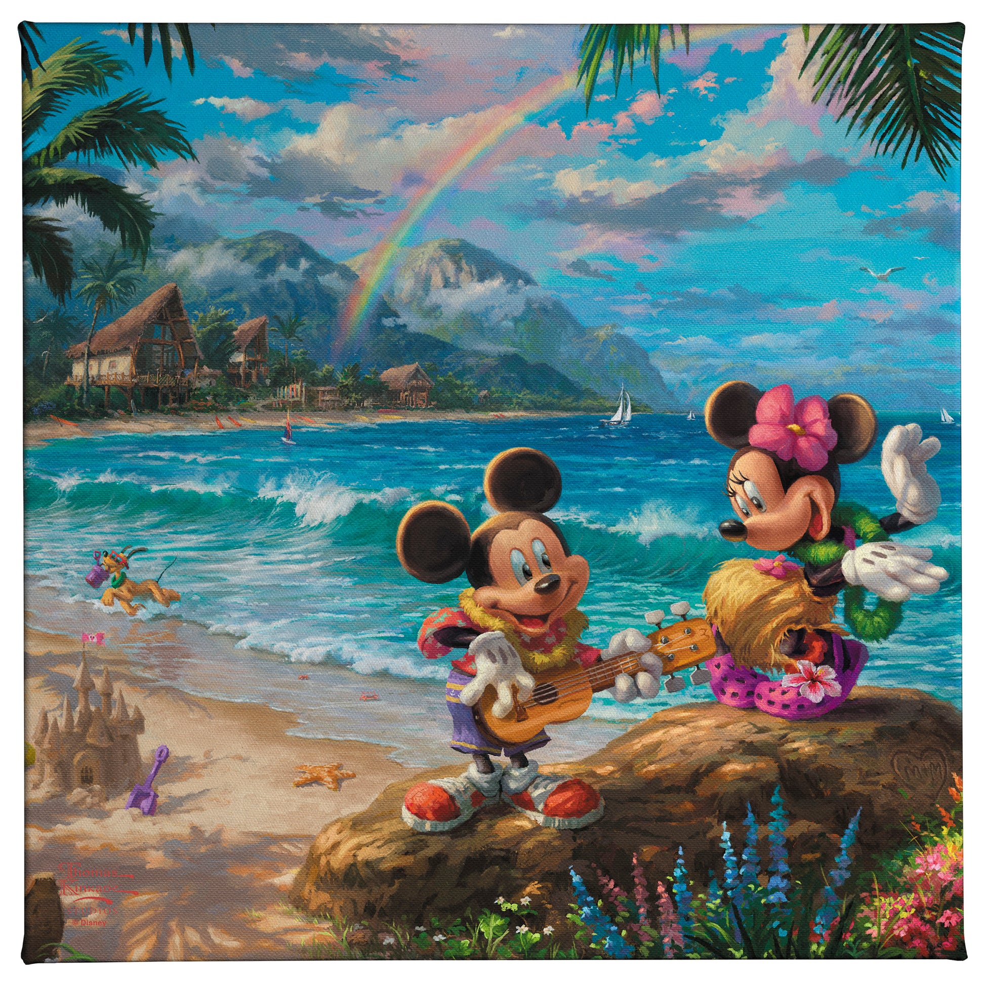 Walt Disney Productions released an animated short film in 1937 entitled, Hawaiian Holiday. The cartoon’s cast included Mickey Mouse, Minnie Mouse, Donald Duck, Goofy, and Pluto as they set out on a Hawaiian Island getaway, complete with every laughable mishap that caused millions of people to fall in love with them, including Thomas Kinkade. As a life-long admirer of Walt Disney’s work, Thom often enjoyed re-creating many of the scenes and characters in typical Kinkade style. In celebration of the 80-year anniversary of this film, Thomas Kinkade Studio’s, inspired by the 1937 film, is proud to present their newest painting -Mickey and Minnie in Hawaii; the first painting in the Passport to Adventure Collection. Beneath the rainbow covered mountains, one of Hawaii’s most beautiful beaches has become the party place for Disney’s most well-known cast of characters. As Minnie dances along to Mickey’s ukulele serenade, even the sea creatures draw near to listen. But as Donald and Daisy stroll along the beach and Pluto splashes in the waves, it is Goofy who steals the scene with his perfectly clumsy antics. © Disney © The Thomas Kinkade Estate – All Rights Reserved