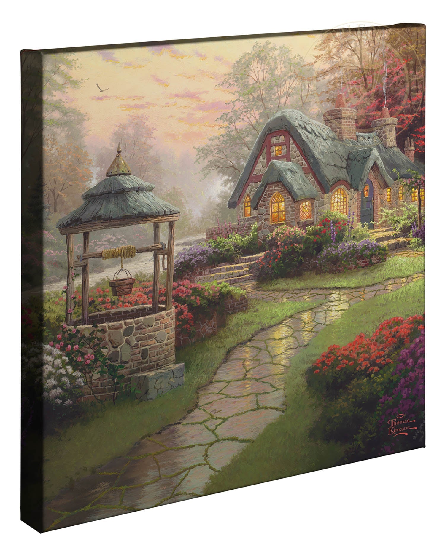 As the father of four daughters, I know that nothing is more precious than the dreams of young girls. My girls - like yours - wish for many things: from a new doll or dress to a soccer goal. But most of all they dream of love and of the soul mate in whose eyes love will be reflected. How sweet it is to imagine the wishes that children, and especially little girls, have whispered into the mossy depths of this old wishing well. For all the children who dare to dream, I've created Make a Wish Cottage, a sanctuary where dreams can come true. I believe in the power of dreams. After all, I met the girl of my dreams as a young boy barely into his teens, and my Nanette has taught me to believe in happy endings. Like Make a Wish Cottage, the home we have created together is lit by the light of love. The gardens here are lavish with flowers; bowers of red climbing roses encircle the thatched roof like a crown. The stream that flows beside the cottage and feeds the well symbolizes God's abundant blessings. I'm especially fond of the network of mossy cracks in the flagstone walkway; they recall the pattern of the walk leading to my own studio. God's glorious sunset reflects subtly in the damp surface of the stony path. © The Thomas Kinkade Estate – All Rights ReservedProduct Specifications