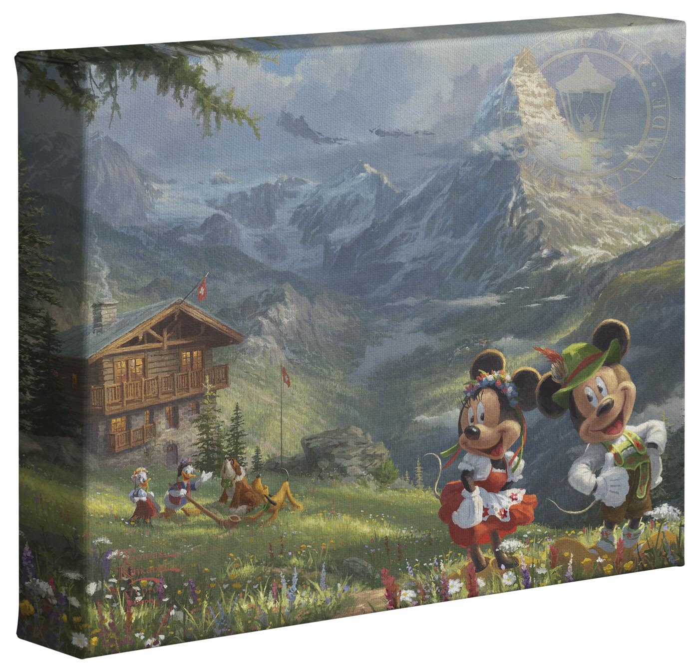 In the Passport to Adventure series by Thomas Kinkade Studios, Mickey, and Minnie, along with some of their closest friends, explore famous travel destinations around the world. There is no adventure too great or too small for this troop, and that includes hiking into the Swiss Alps. As you can clearly see, Mickey, Minnie, and Daisey are all wearing traditional Swiss attire, but Donald has also found an alphorn, causing Pluto and his new friend, a mountain rescue dog, to start singing along. Their alpine bungalow offers a front row seat to one of the most inspiring mountains in the world, the Matterhorn. Mickey and Minnie in the Swiss Alps incorporates, not only your favorite Disney characters but also the awe-inspiring realism of notable landmarks, resulting in a beautiful piece of art. © Disney © The Thomas Kinkade Estate – All Rights ReservedProduct Specifications