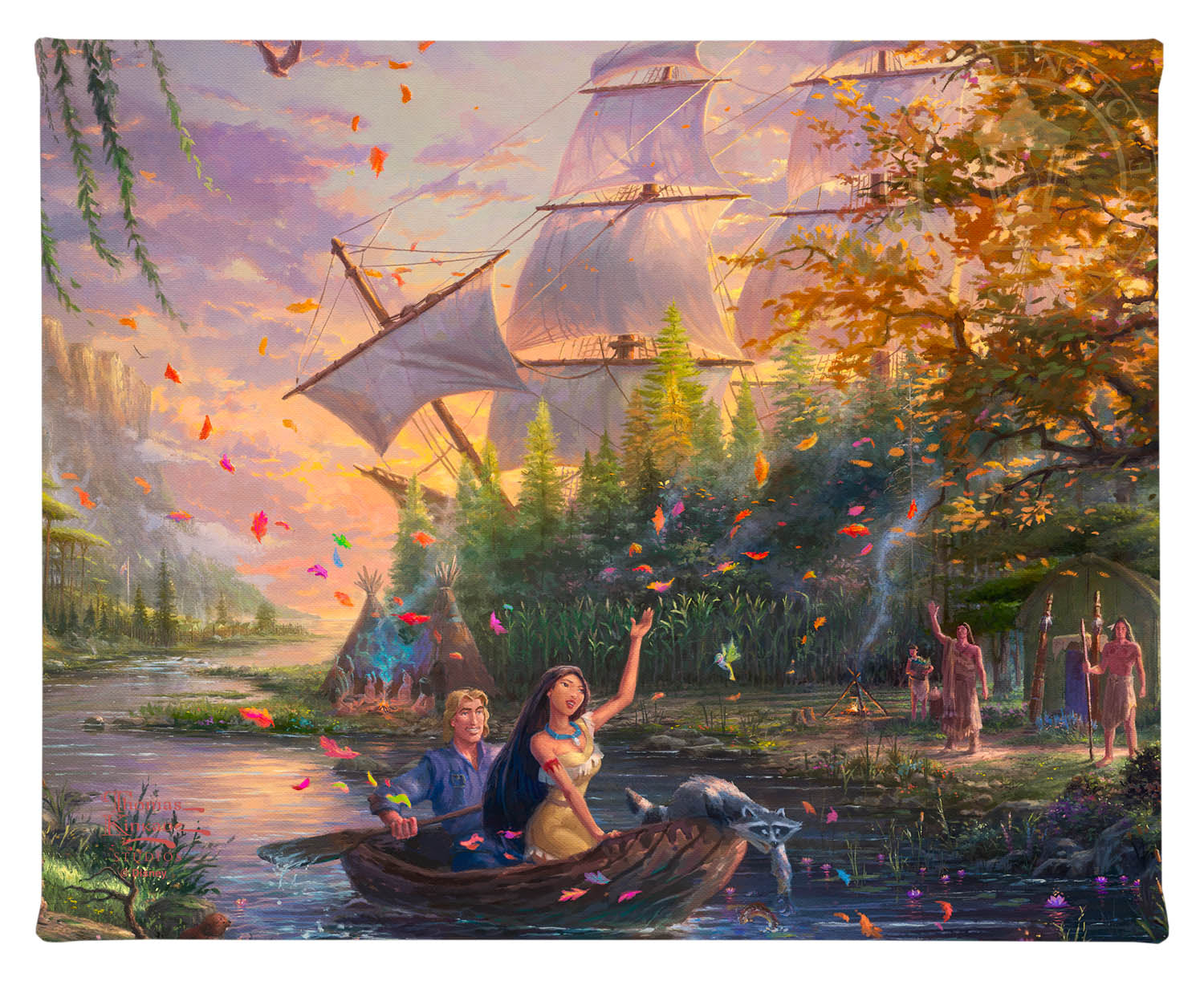 As the evening sun retreats beyond the ship, Susan Constant, and the horizon, a new love is forming between two distant worlds. The artists at Thomas Kinkade Studios have brilliantly captured one of Disney’s most successful box office hits in one scene entitled, “Pocahontas - Colors of Love.”
