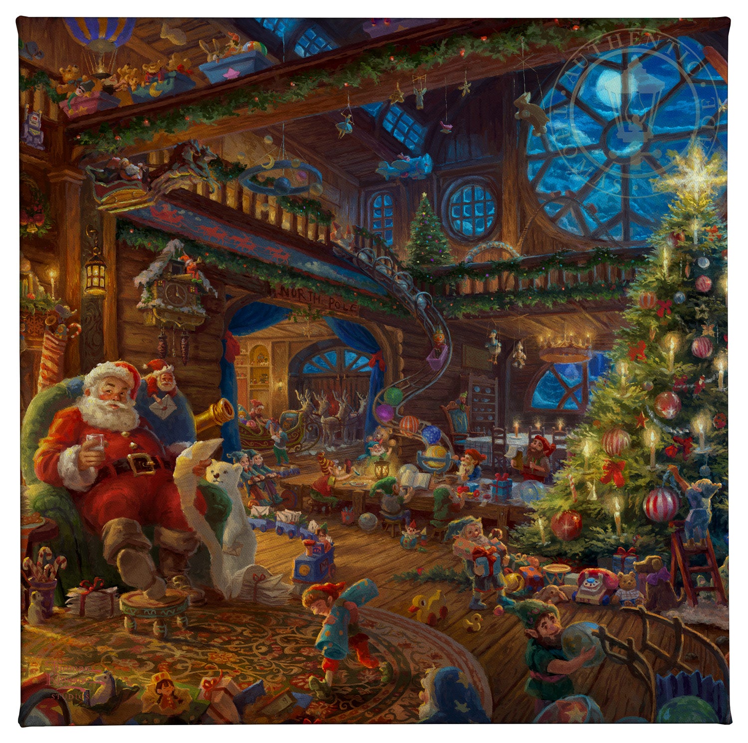 Enjoy Santa’s Workshop, a painting by Thomas Kinkade Studios that captures the magic of Christmas Eve. Santa’s Workshop is full of special toys on this very busy afternoon. Excitement is in the air, as Santa’s elves put the finishing touches on the gifts and pack up Santa’s magical toy bag. Mrs. Claus has baked Santa some gingerbread cookies to enjoy while he checks his list, and the clock shows it’s nearly time for Santa to deliver the presents to all of the boys and girls eagerly awaiting his arrival. © The Thomas Kinkade Estate – All Rights ReservedProduct Specifications