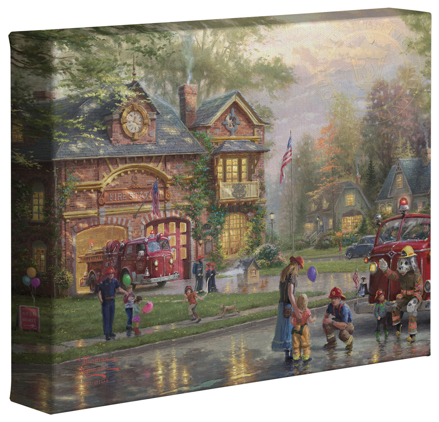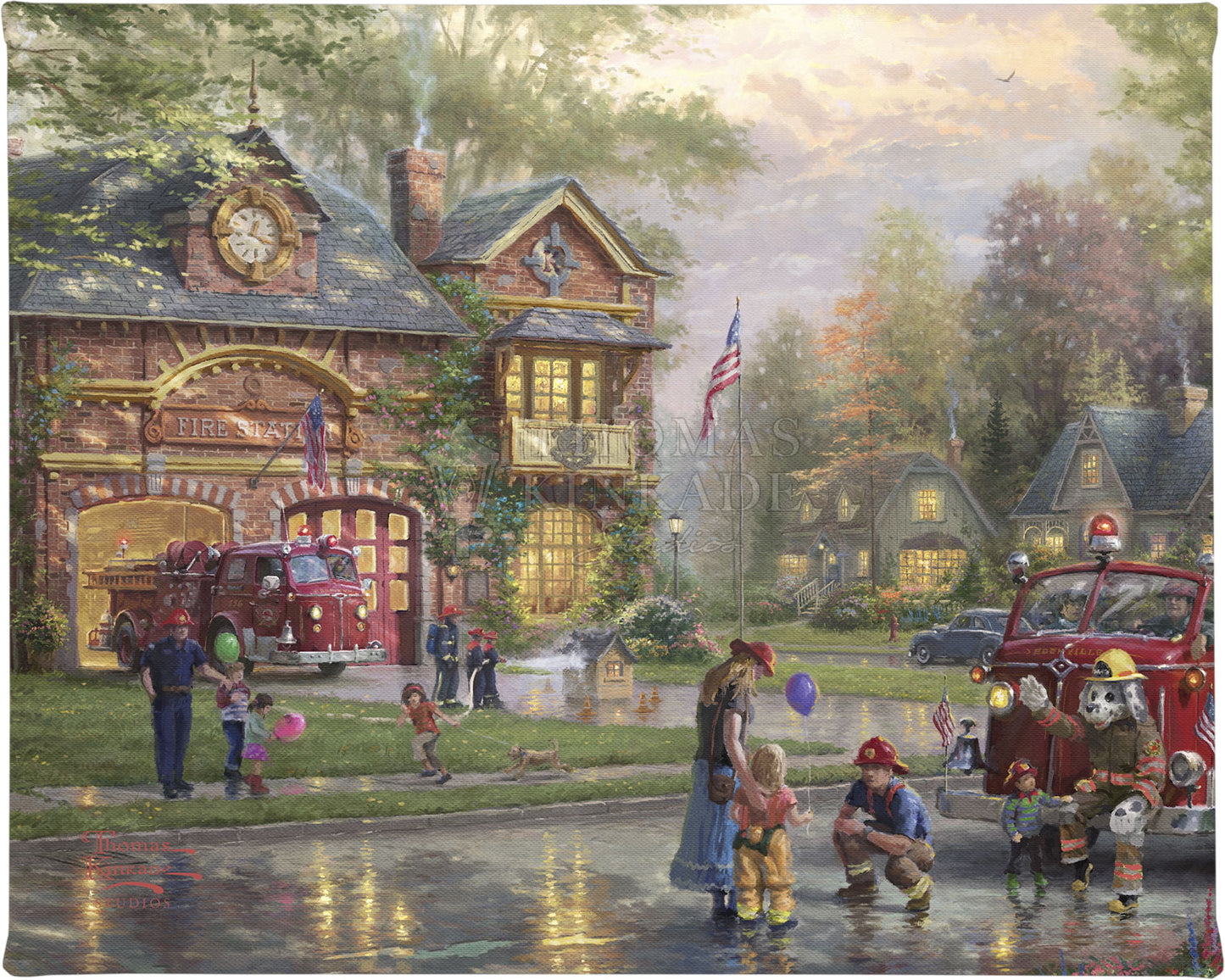 “There is no greater love than to lay down one’s life for one’s friends,” let alone a stranger, a divine truism symbolic of the foundational bonds that link our nation. Nowhere has that love been more vibrantly expressed than in the selfless sacrifice of our nations firefighters. These brave men and women live and serve in all our hometowns and communities. Thomas Kinkade Studios is honored to recognize the heroic firefighters portrayed in the newest painting - Hometown Firehouse. As parents and children from the neighborhood gather on the lawn of the firehouse, there is a sense of family and support that boosts the firefighter’s morale; their sacrifice has been noticed and appreciated. Their long shifts, time away from their family, and the dangers of the job can be stressful, but today is the annual open house at the fire station, a chance for little boys and girls to meet these real-life superheroes up close so that maybe one day they can be just like them.