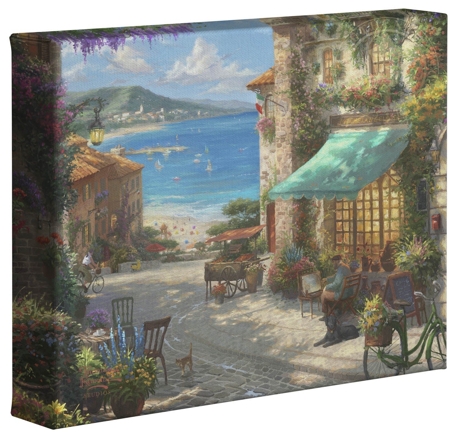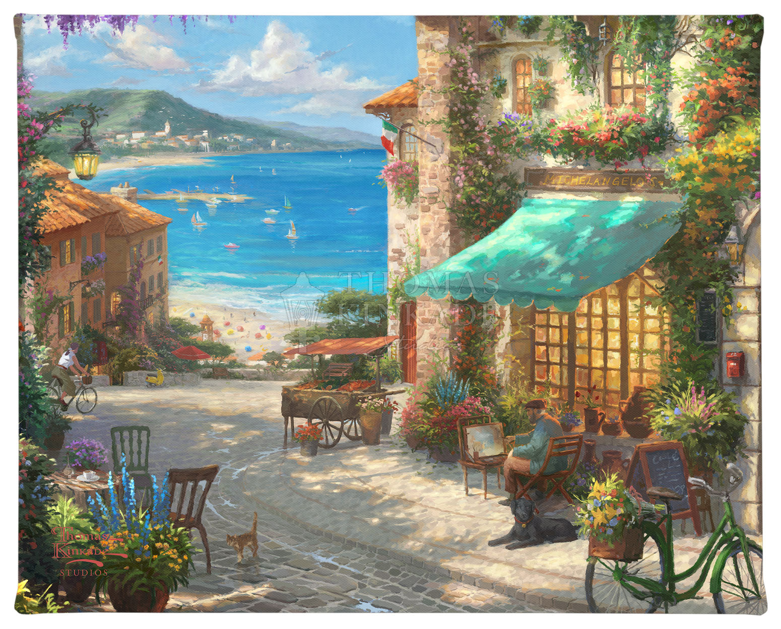 If ever a place could whisk away the troubles of the day, it would be here. Once a fisherman’s harbor, now this quaint southern Sicilian village draws weekenders, beach-dwellers, and romantics. At every turn, the streets and piazzas are lined with stalls of fresh and local food; aubergines, fish, zucchini, tomatoes, and almonds. Like they have for centuries, the shop keepers have watered down the streets and entryways to limit the dust and sand that had blown in overnight. As the day begin, a young lady fetches a loaf of bread and an elderly painter sets up his pallet and make-shift easel looking to capture the sea and the sails. Although Michelangelo’s coffee and pastries are known throughout the island, the cafe offers more than just sustenance for the body, it also offers a timeless encounter with Italy’s flora and fauna, a complete reprieve for the soul. Allow Thomas Kinkade Studios to draw you into the fertile hills of Italy’s finest vineyards to the salty shores of the Mediterranean Sea and everywhere in between with the release their newest painting, Italian Cafe, a work that encapsulates every delicate aspect of southern Sicily.