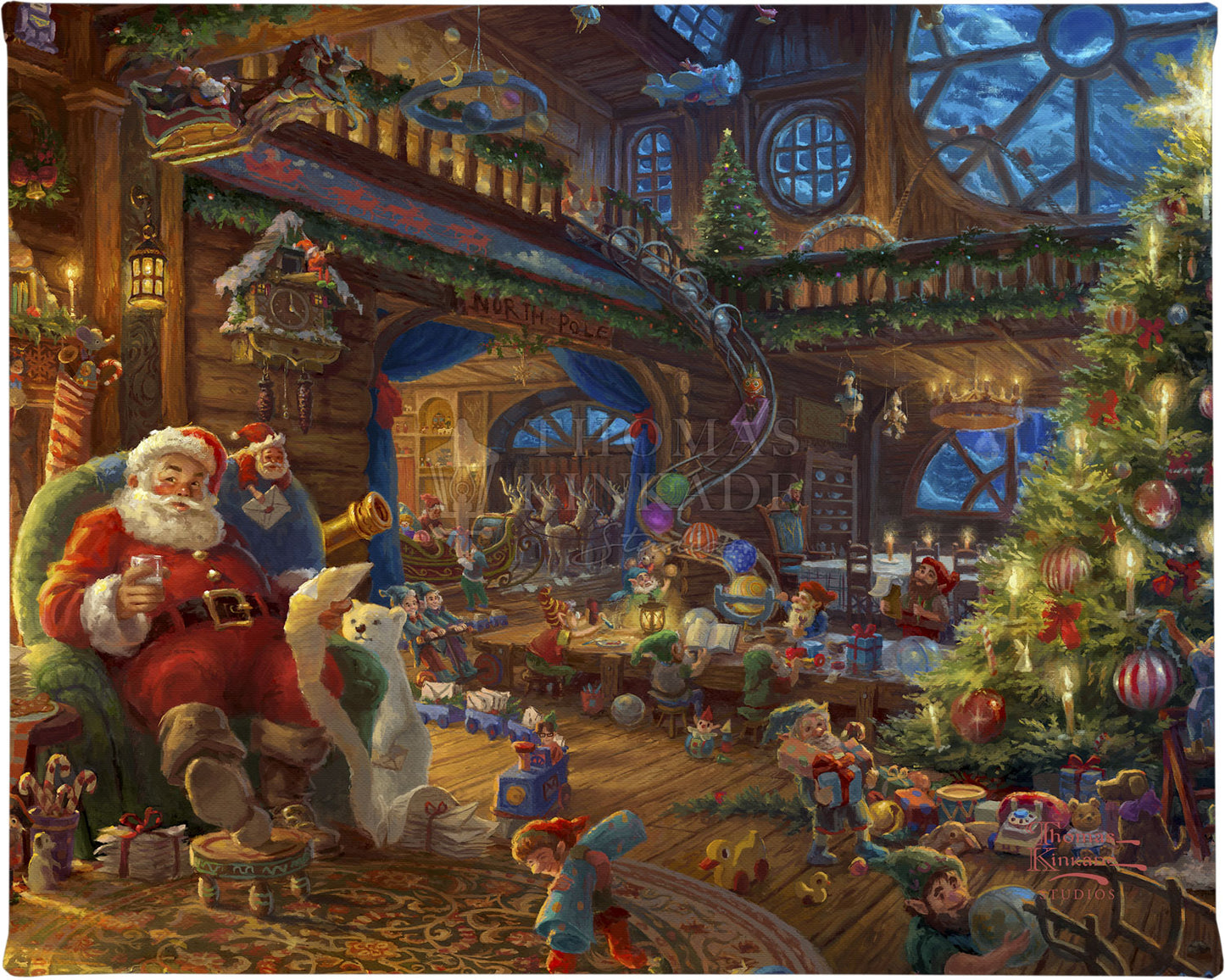 Enjoy Santa’s Workshop, a painting by Thomas Kinkade Studios that captures the magic of Christmas Eve. Santa’s Workshop is full of special toys on this very busy afternoon. Excitement is in the air, as Santa’s elves put the finishing touches on the gifts and pack up Santa’s magical toy bag. Mrs. Claus has baked Santa some gingerbread cookies to enjoy while he checks his list, and the clock shows it’s nearly time for Santa to deliver the presents to all of the boys and girls eagerly awaiting his arrival. © The Thomas Kinkade Estate – All Rights ReservedProduct Specifications