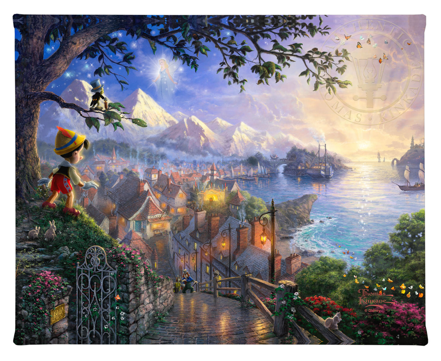 My Disney Dreams Collection celebrates great moments from Walt Disney Films. I call these paintings "narrative panoramas" because each painting tells the entire story of the film in one image. For my painting Pinocchio Wishes Upon A Star we see Pinocchio upon a hillside overlooking the setting of his adventures. We see Honest John and Geppetto's workshop where Pinocchio was formed. On the right we see Pleasure Island and Monstro the whale preparing to engulf Geppetto's sailing vessel. Butterflies and sparkles lend magical accents as the Blue Fairy and Jiminy Cricket look on. My prayer is that my Disney Dreams Collection will make dreams come true for all who see these enchanted paintings. © Disney © The Thomas Kinkade Estate – All Rights ReservedProduct Specifications