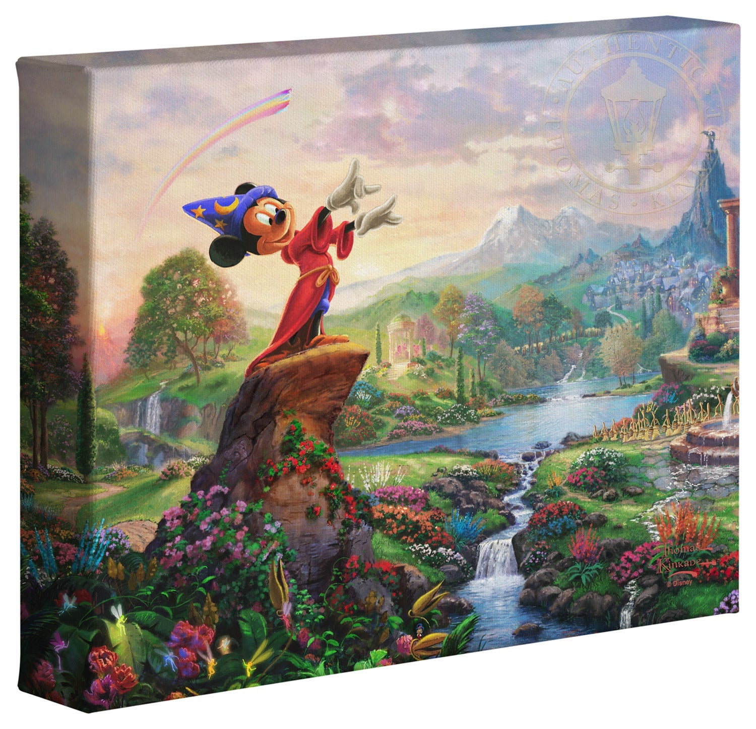 Walt Disney so famously reflected on his career and legacy "it was all started by a mouse", which indeed it did. From those simple beginnings in the classic cartoon Steamboat Willie, the "mouse" has grown to an iconic stature on the worldwide stage and clearly reached a very celebrated peak in the animated masterpiece Fantasia as the sorcerer's apprentice. Never before and truly never since has there been a more ambitious and successful fusion of high art, classical music and popular culture in film. Fantasia was a revolutionary film leaving an emotional, intellectual and spiritual impact on its viewer. It is from this lofty platform of visionary brilliance and excellence in artistic execution that the Thomas Kinkade Studios began its rendering of Fantasia. Joining the flowers and fairies are many delightful characters from various segments of this Disney classic. Mickey stands in the center of it all orchestrating the sublime dance going on about him. One can almost hear the strings, brass and timber of Leopold Stokowski's Philadelphia Orchestra spring to life while viewing this masterwork of color, light and animated composition. Indeed, it may have all started with a mouse but in Fantasia it has never been more clear that this simple fellow of humble beginnings has become so much more. Fantasia as a film is transcendent, fully taking the mouse to the level of high culture. We at Thomas Kinkade Studios hope you will all agree that our interpretation of Fantasia is yet another extension of the film's tradition of exploring beauty through the purity of joyous artistic expression. © Disney © The Thomas Kinkade Estate – All Rights ReservedProduct Specifications