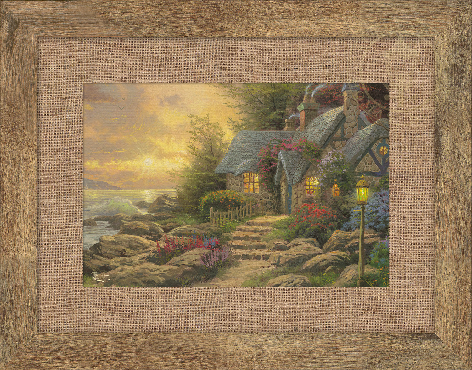 Seaside Hideaway evokes the mood of rapture we feel at such times. This is a glorious sunset; spray from the breaking waves drenches the air with mist, and a radiant light bathes clouds and swells with its golden glow, until the eye can scarcely tell where sky ends and sea begins. The towering, wispy clouds resemble angels in the searchlight of God's grace; gulls fly up toward the heavenly light.Product Specifications