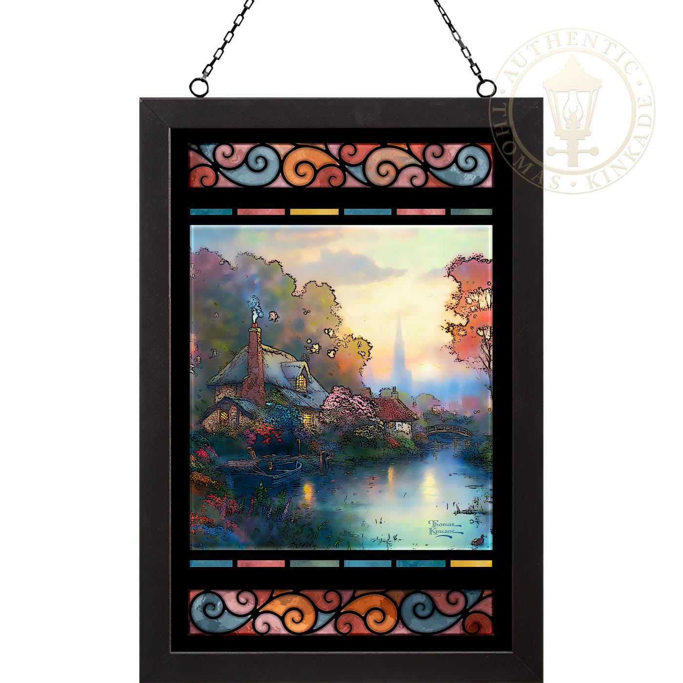 Let the light shine! Stained glass art hangings show their true colors when back-lit with natural sunlight. Popular designs by Thomas Kinkade are printed with fade resistant inks directly on glass, framed and ready to hang with provided chain.
