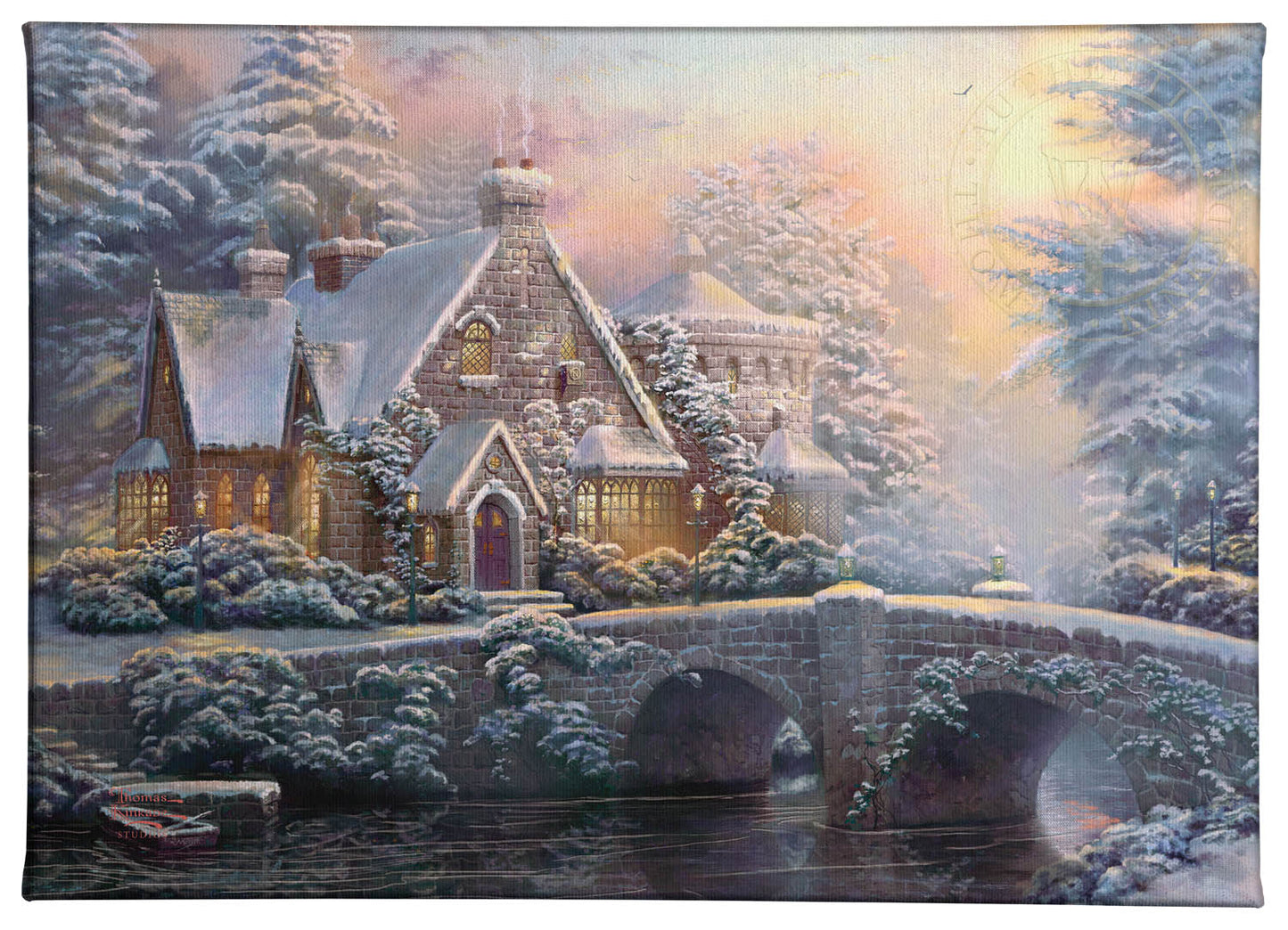 This artwork is an adaptation of a Thomas Kinkade classic. In celebration of Christmas, Thomas Kinkade Studios enhanced Thom’s original piece with special holiday and winter elements. Can you find them all? This collaborative piece is available in a beautiful gallery wrapped canvas décor format that is the perfect accent for any home or office.