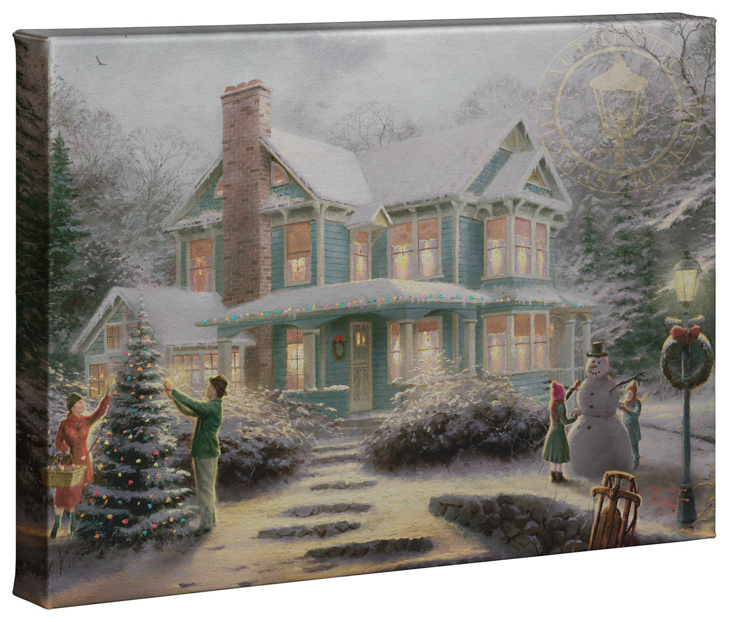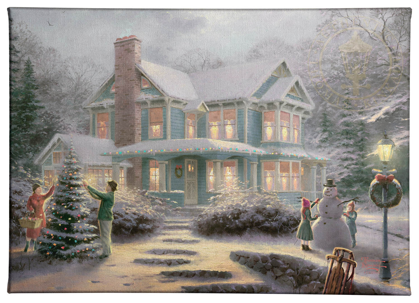 This artwork is an adaptation of a Thomas Kinkade classic. In celebration of Christmas, Thomas Kinkade Studios enhanced Thom’s original piece with special holiday and winter elements. Can you find them all? This collaborative piece is available in a beautiful gallery wrapped canvas décor format that is the perfect accent for any home or office.