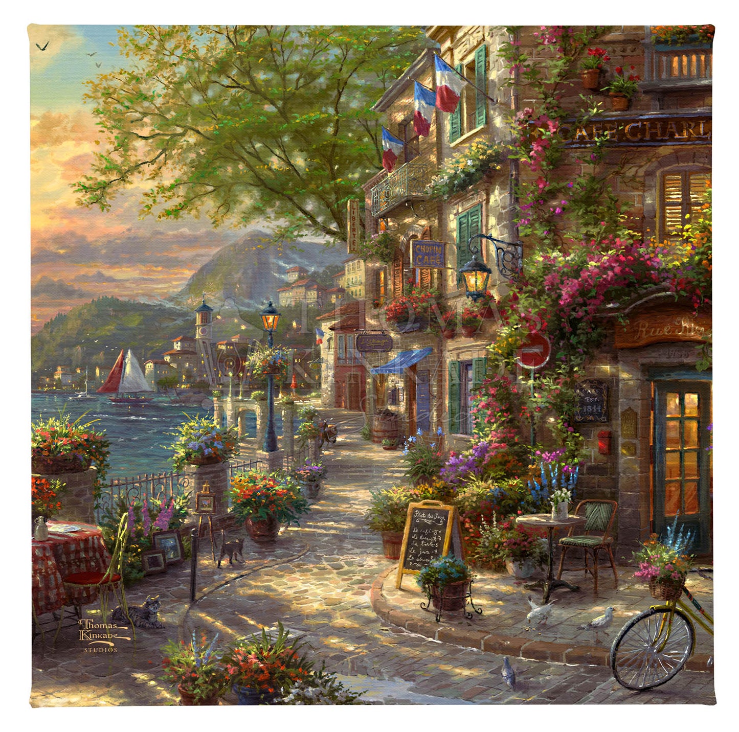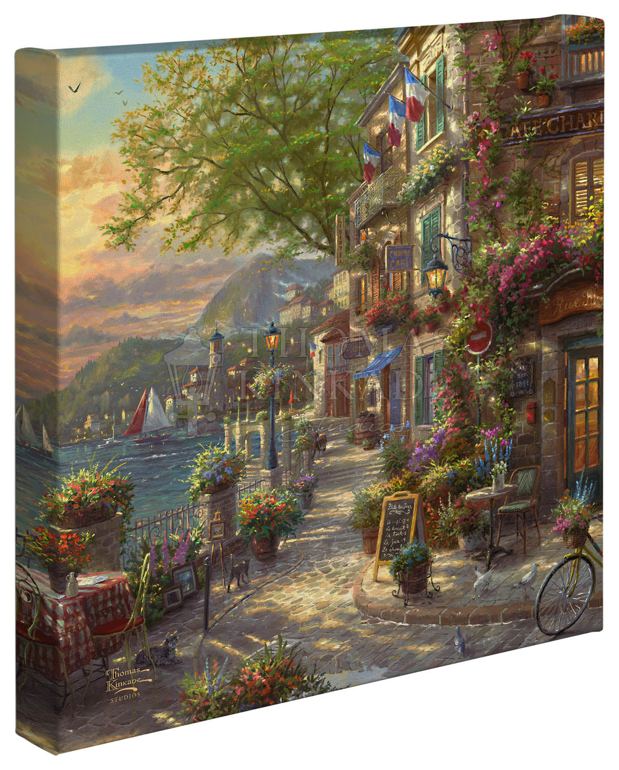 If there was a place that could melt your troubles away it would be here. The French Riviera is known the world over for its glamour, beauty, and pristine coastline but this tranquil spot takes it to a whole new level. Picture yourself navigating around the narrow streets of this Mediterranean city as you stumble upon an open table at a coastal café. The sun has just begun to set into a seascape teaming with sailboats as you sit down to enjoy the view. Allow Thomas Kinkade Studios to draw you into the glamourous hills and streets of France’s salty shores of the Mediterranean Sea with the release of their newest painting, French Riviera Café, a work that encapsulates every alluring aspect of southern France.Product Specifications