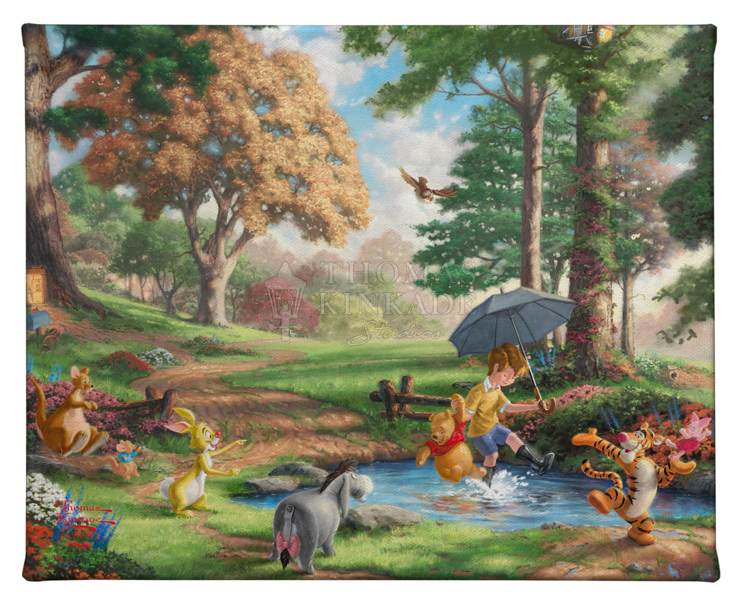 There are few if any works of literature or animation that better capture the innocence and wisdom of the child and the child's perspective on life than the A. A. Milne classic "Winnie the Pooh". There were few if any books or films that influenced Thom as a young boy more than these stories detailing the adventures of Christopher Robin and his delightful menagerie of friends as they all adventured in the Hundred Acre Wood. In 1966 when Disney Studios began releasing their featurettes chronicling these wondrous tales, Thom could not have been more excited. His childhood fancies were coming to life. It is in honor of that time in his life we at the Thomas Kinkade Studios proudly introduce scenes from this magical story of love, faith, friendship and adventure. It is in these paintings we hope our collectors reflect on and always remember these undeniable truths from Pooh himself, such as "nobody can be uncheered with a balloon" or "when you see someone putting on his Big Boots, you can be pretty sure that an adventure is going to happen."