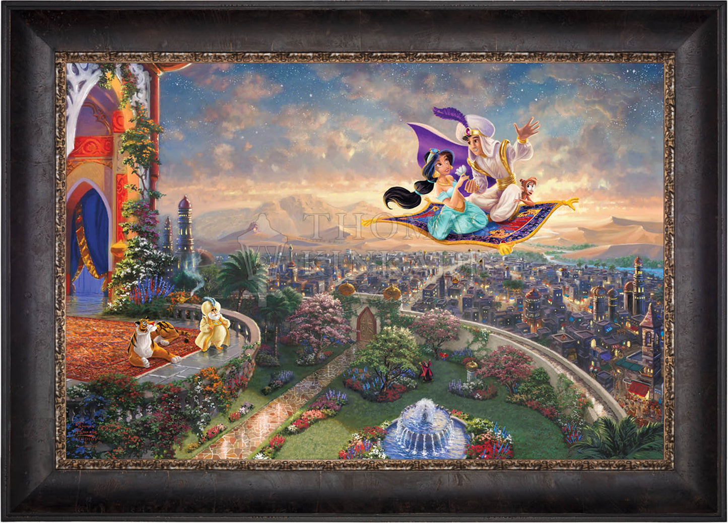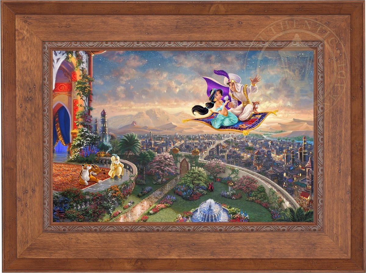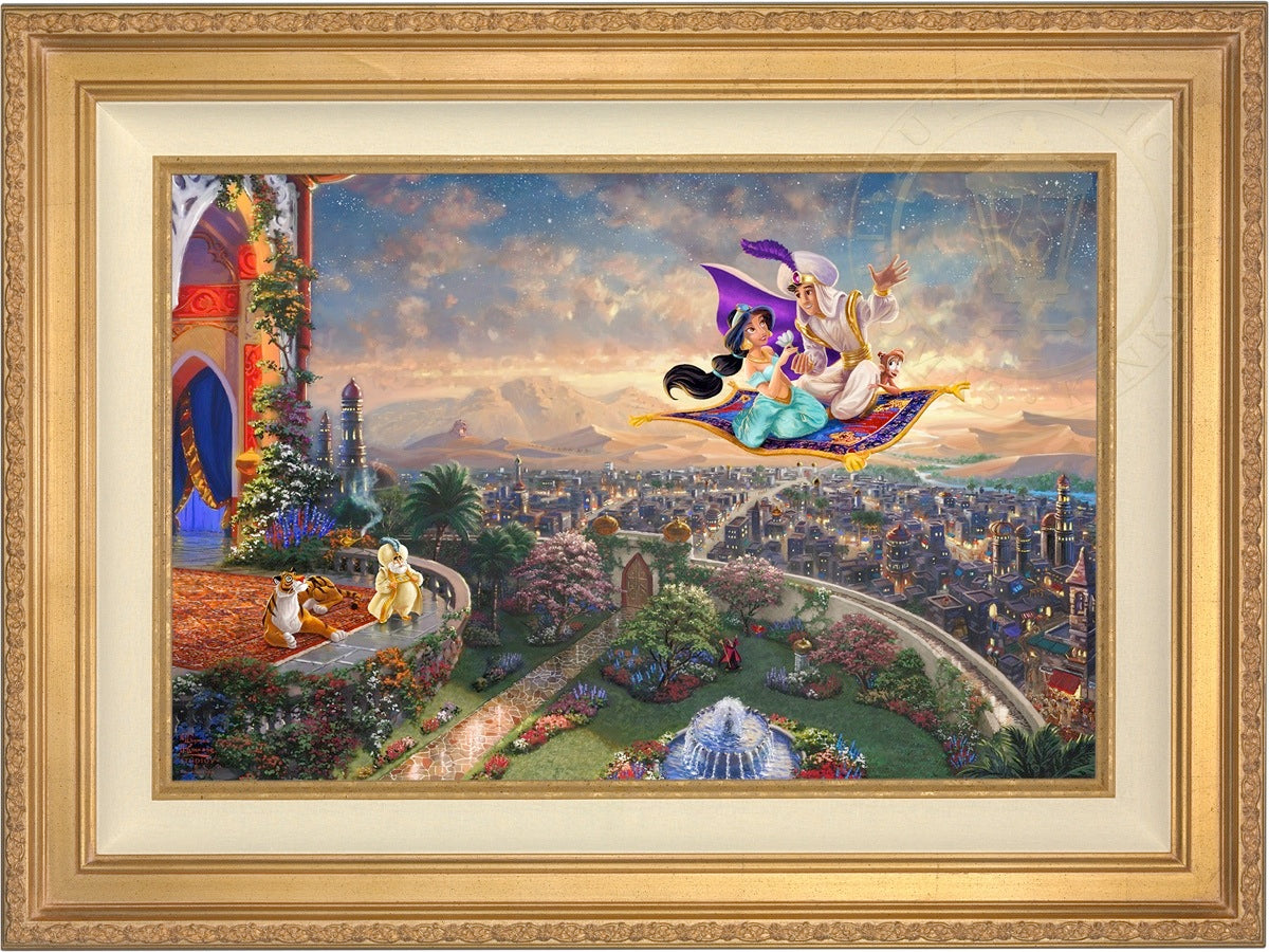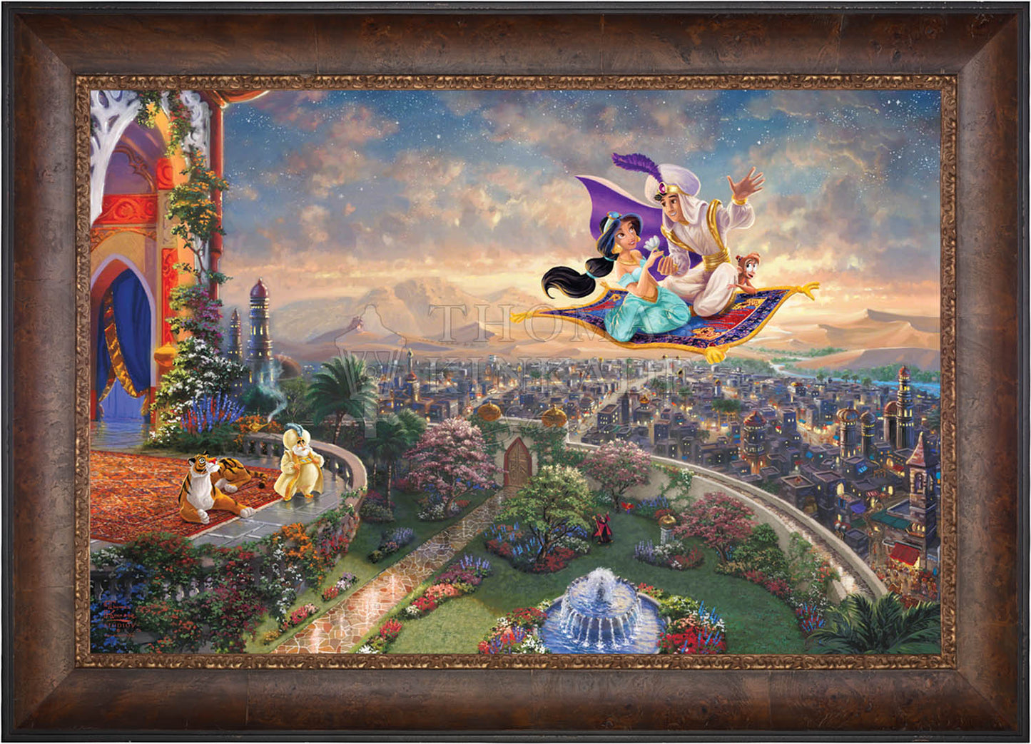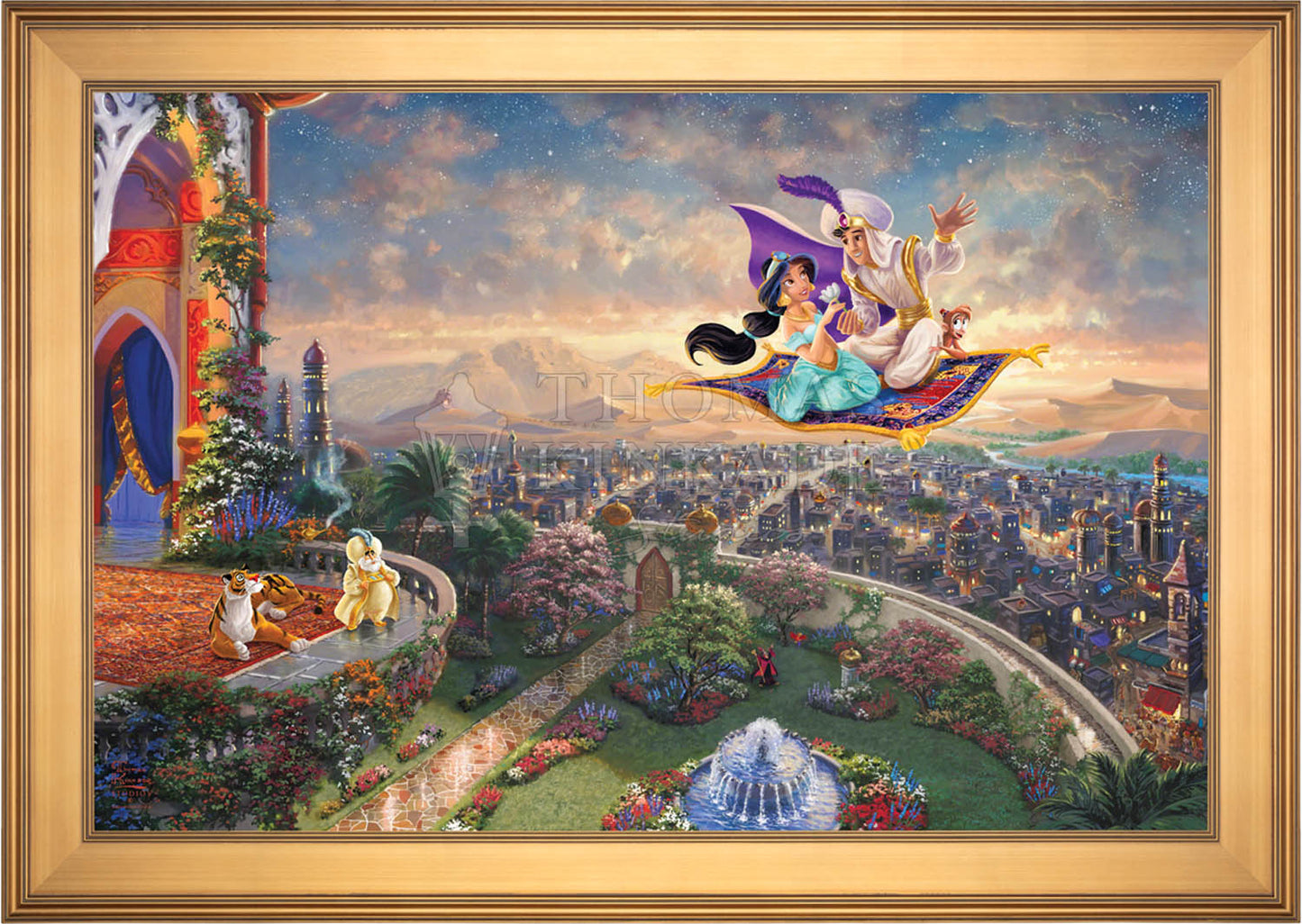 Who am I? And with whom will I share a lifetime of love? These are two of the great themes of each of our lives; questions we seek to answer in our own life's journey. In Disney's magical animated classic, Aladdin , based on the folktale "Aladdin, or the Wonderful Lamp" from the collection "One Thousand and One Nights", both Aladdin and Jasmine seek answers to these two great questions. The peasant boy Aladdin pretends to be a prince to win the hand of his beloved Jasmine, and Princess Jasmine pretends to be a peasant to break the confines of her palace home. As they soar above Agrabah and the surrounding kingdom on a magic carpet ride, they discover a "whole new world" of adventure and love, and the realization that we only need "to be ourselves", not someone else, to find "true love" and that wondrous place for you and me. Thomas Kinkade Studios is proud to present Disney Aladdin with the hope that you too will discover that wondrous place and love for your life.