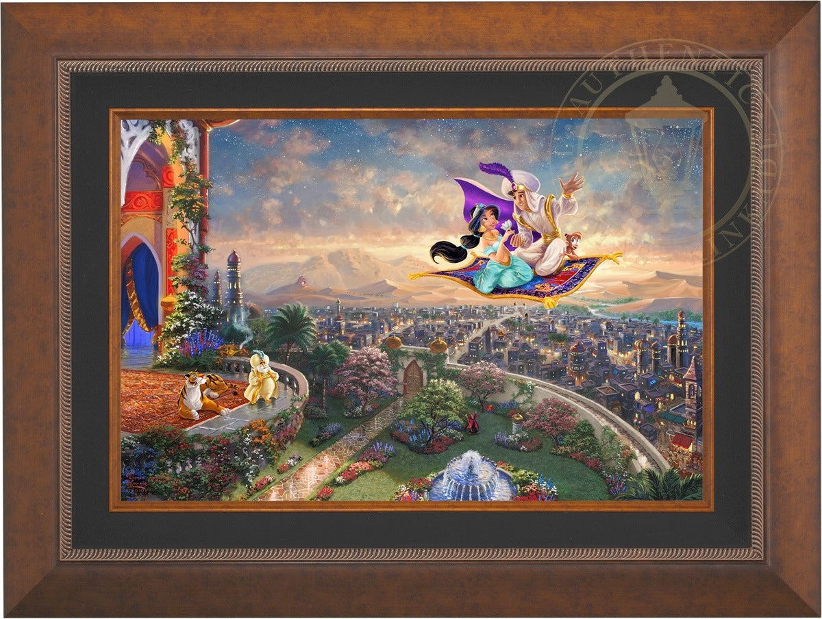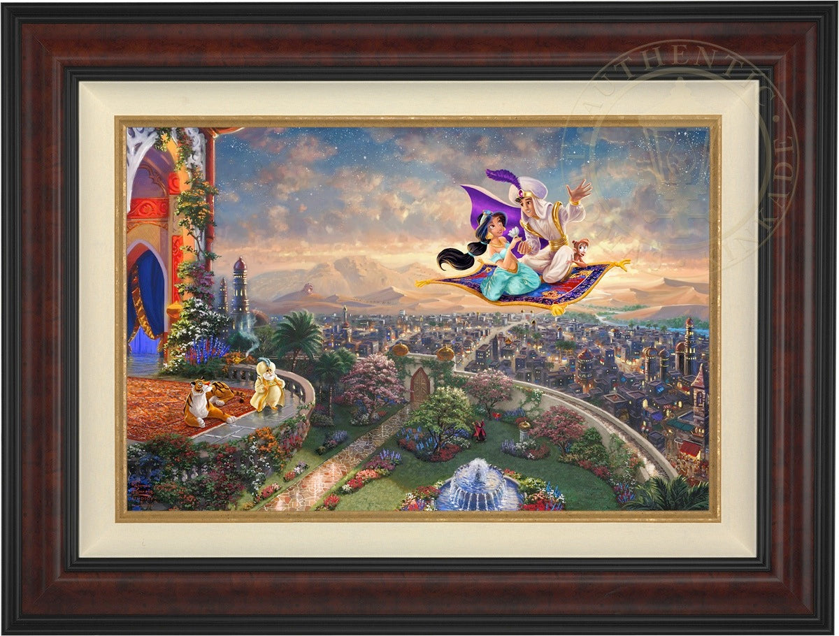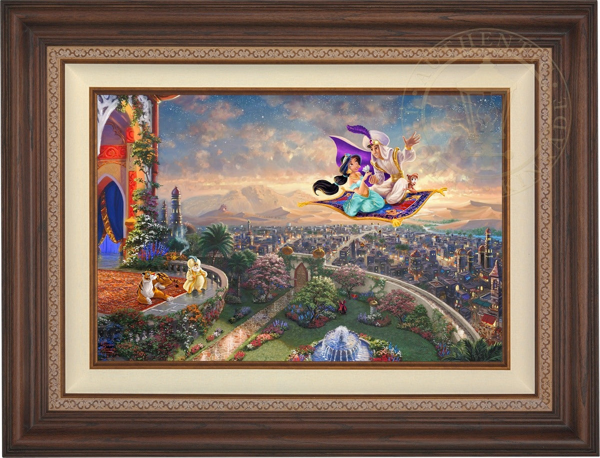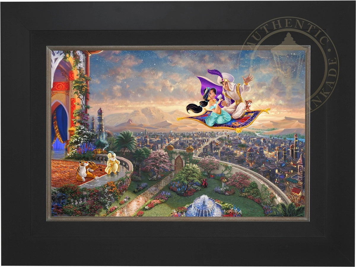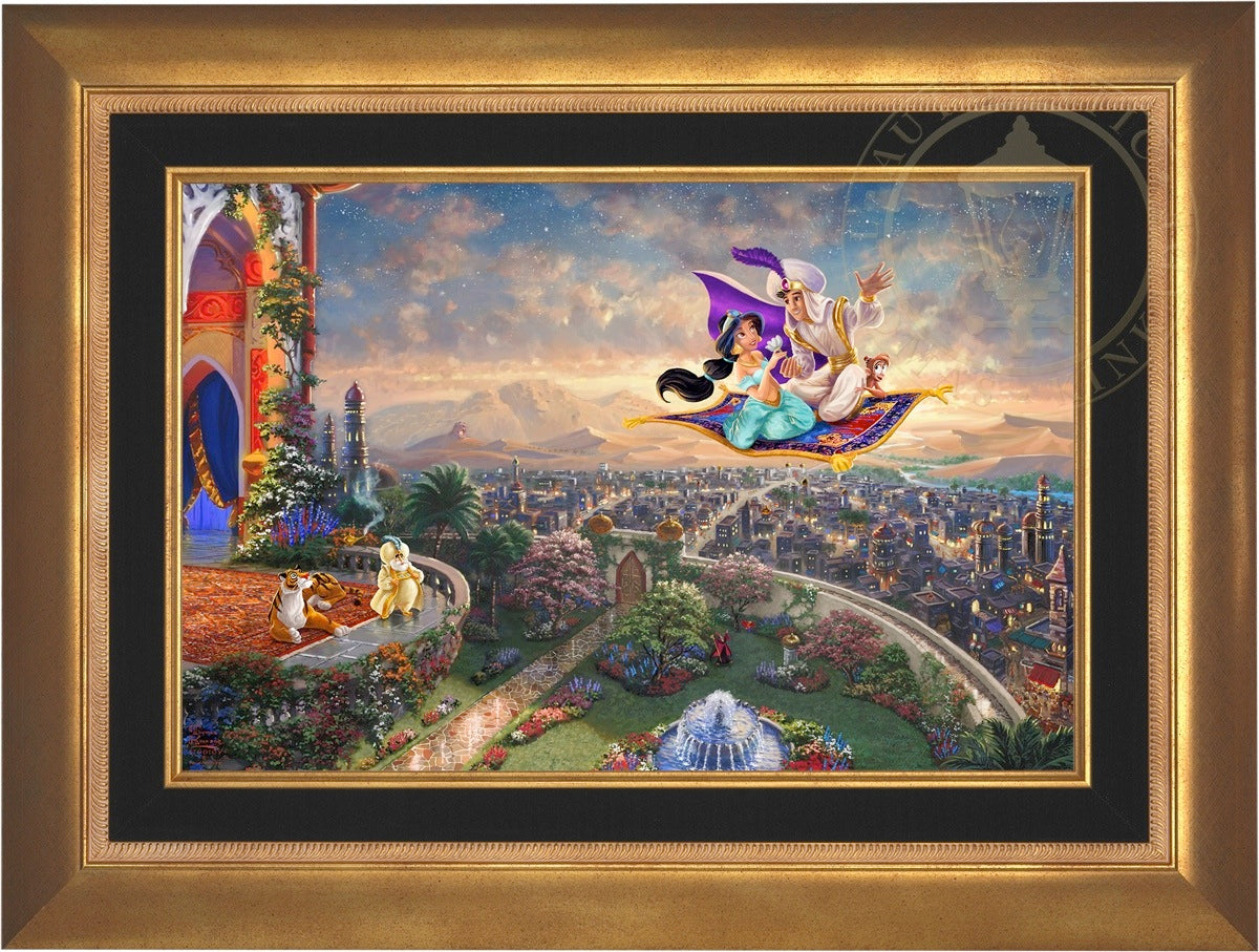 Who am I? And with whom will I share a lifetime of love? These are two of the great themes of each of our lives; questions we seek to answer in our own life's journey. In Disney's magical animated classic, Aladdin , based on the folktale "Aladdin, or the Wonderful Lamp" from the collection "One Thousand and One Nights", both Aladdin and Jasmine seek answers to these two great questions. The peasant boy Aladdin pretends to be a prince to win the hand of his beloved Jasmine, and Princess Jasmine pretends to be a peasant to break the confines of her palace home. As they soar above Agrabah and the surrounding kingdom on a magic carpet ride, they discover a "whole new world" of adventure and love, and the realization that we only need "to be ourselves", not someone else, to find "true love" and that wondrous place for you and me. Thomas Kinkade Studios is proud to present Disney Aladdin with the hope that you too will discover that wondrous place and love for your life.