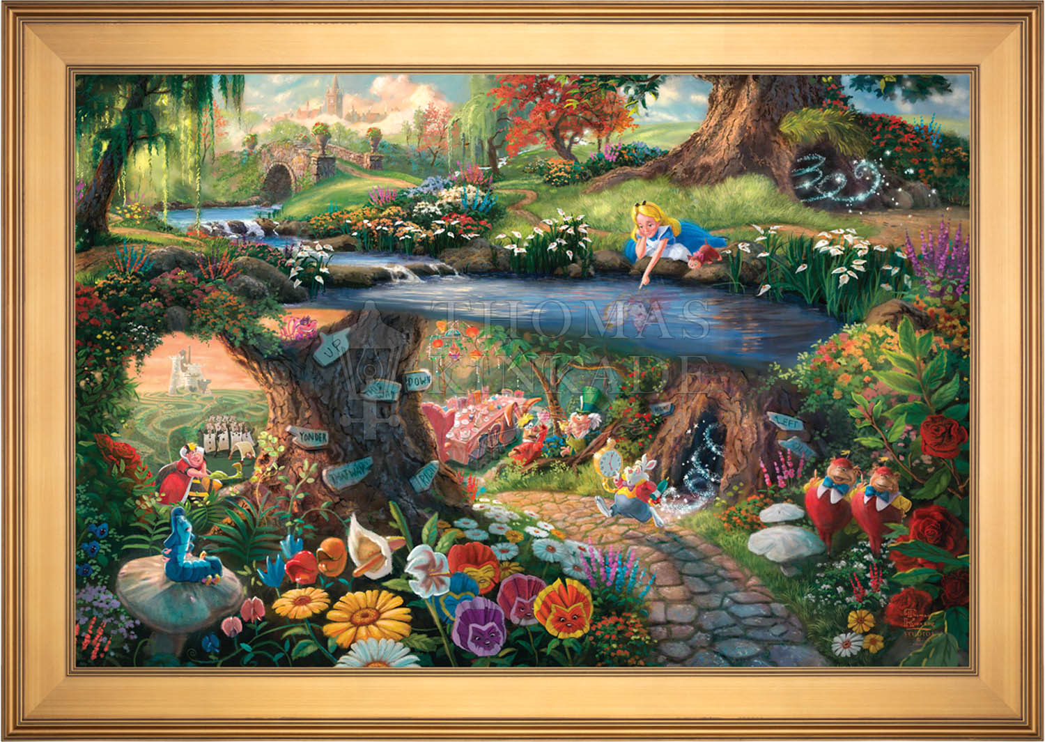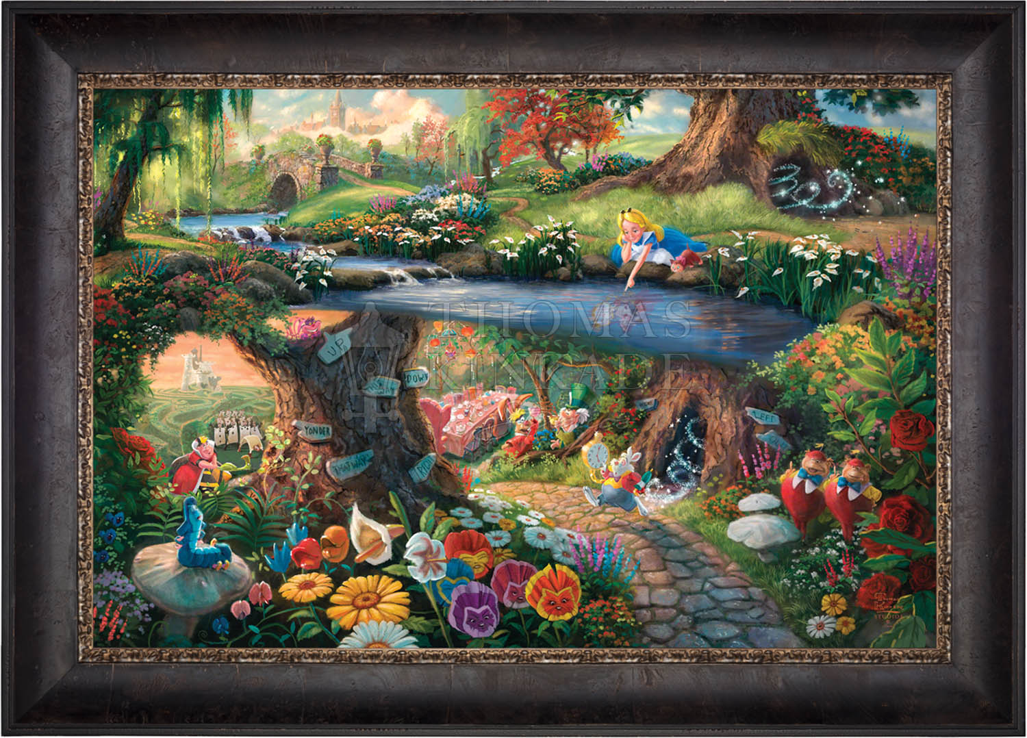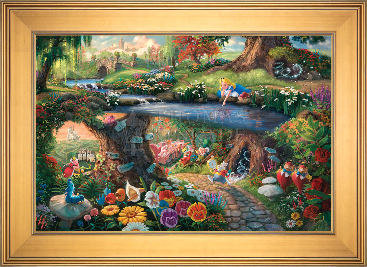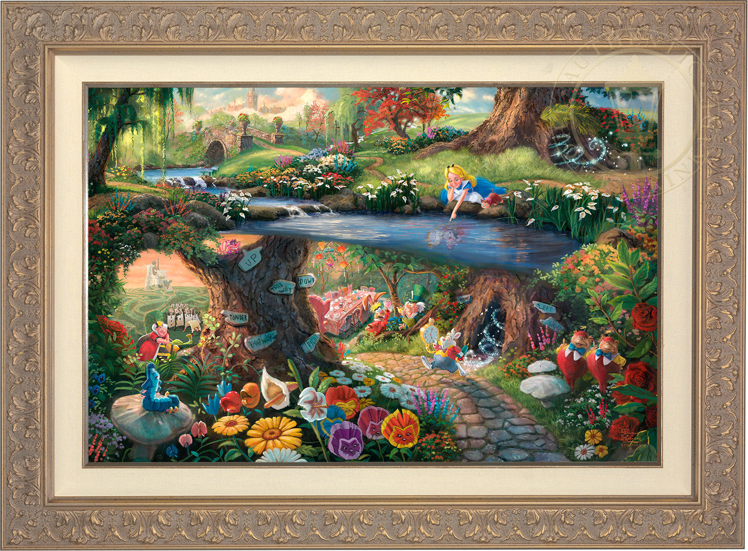The story tells of a young girl named Alice who accidentally falls down a rabbit hole and finds herself on a curious adventure and in the presence of a number of odd and interesting characters. In 1951, Walt Disney realized a long-held ambition and brought this enchanting tale to the big screen, infusing it with his own brand of animated magic and family fun. Disney Alice in Wonderland as illustrated by John Tenniel was exquisitely detailed in the book, while the Disney film was a modernist style with a highly saturated color palette. The Thomas Kinkade Studios painting of Disney Alice in Wonderland captures all the great Disney characters. The hurried White Rabbit, the enigmatic Caterpillar, the lunatic Mad Hatter, the nonsensical Tweedledee and Tweedledum all play a part in the world down the hole. There is also Alice, viewing it all with a child's innocence and relating to it in a way that brings out the wonderment in all of us. It is with a great deal of pride that we present the Thomas Kinkade Studios painting Disney Alice in Wonderland inspired by the literary genius of Lewis Carroll and animated mastery of Walt Disney.
