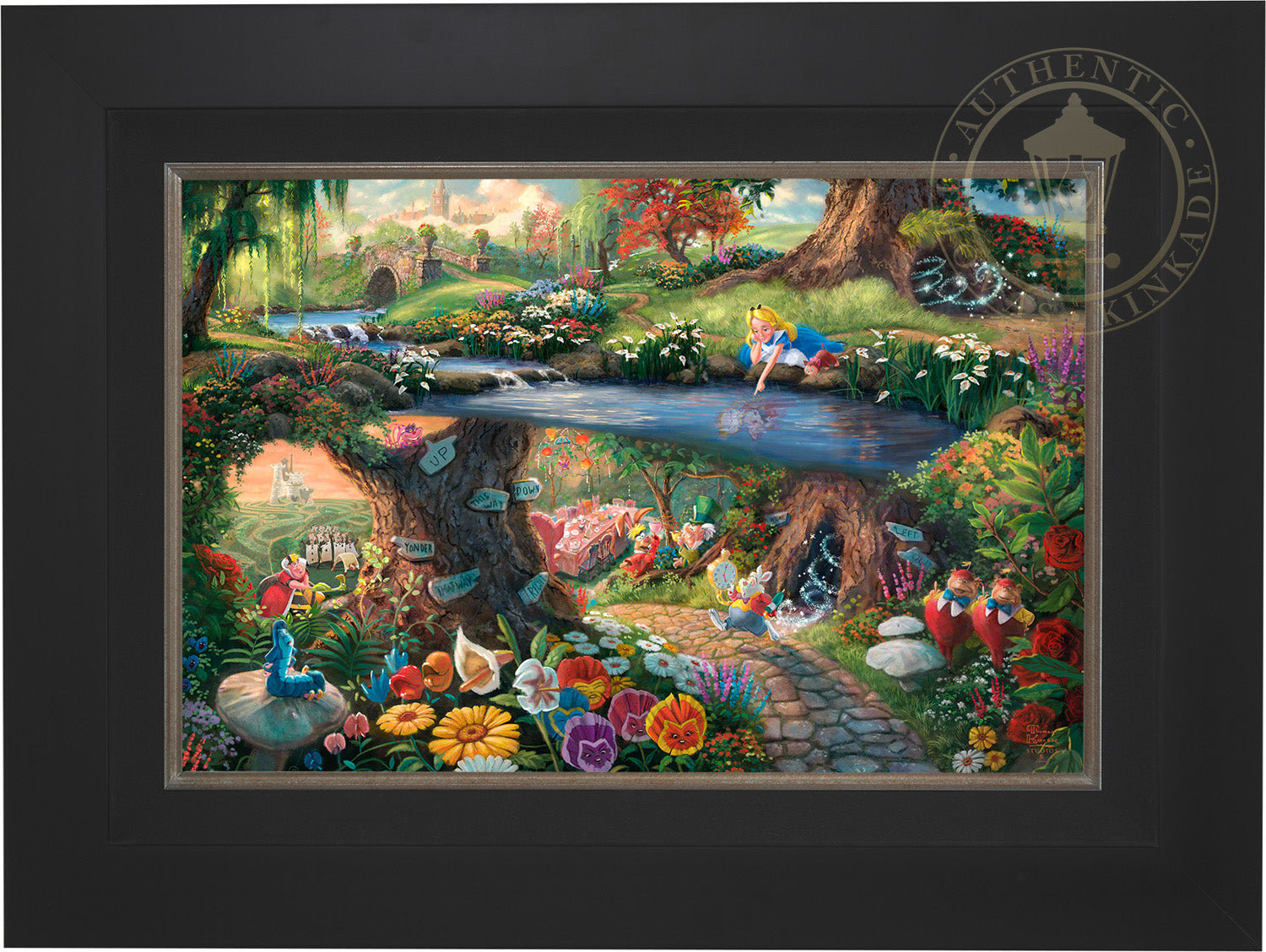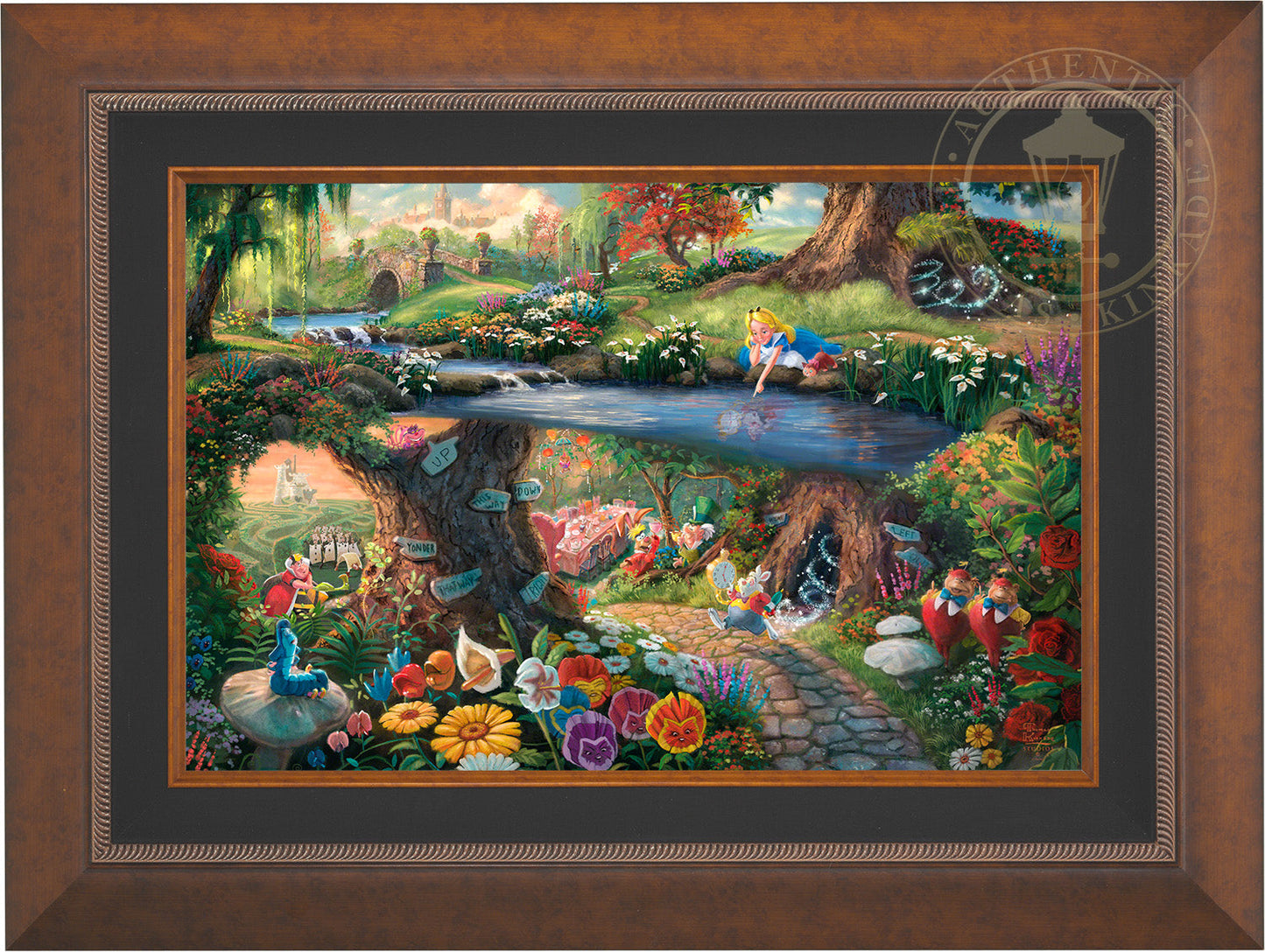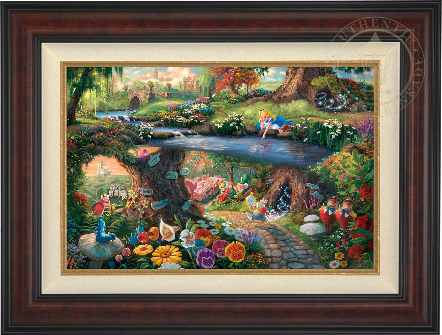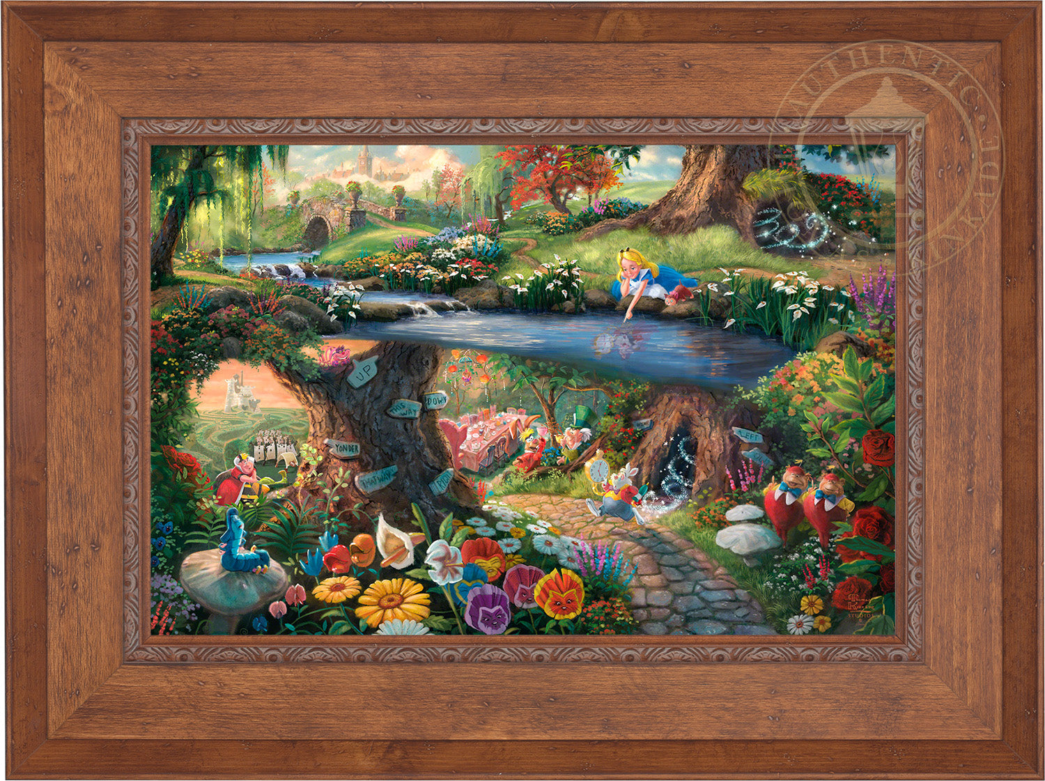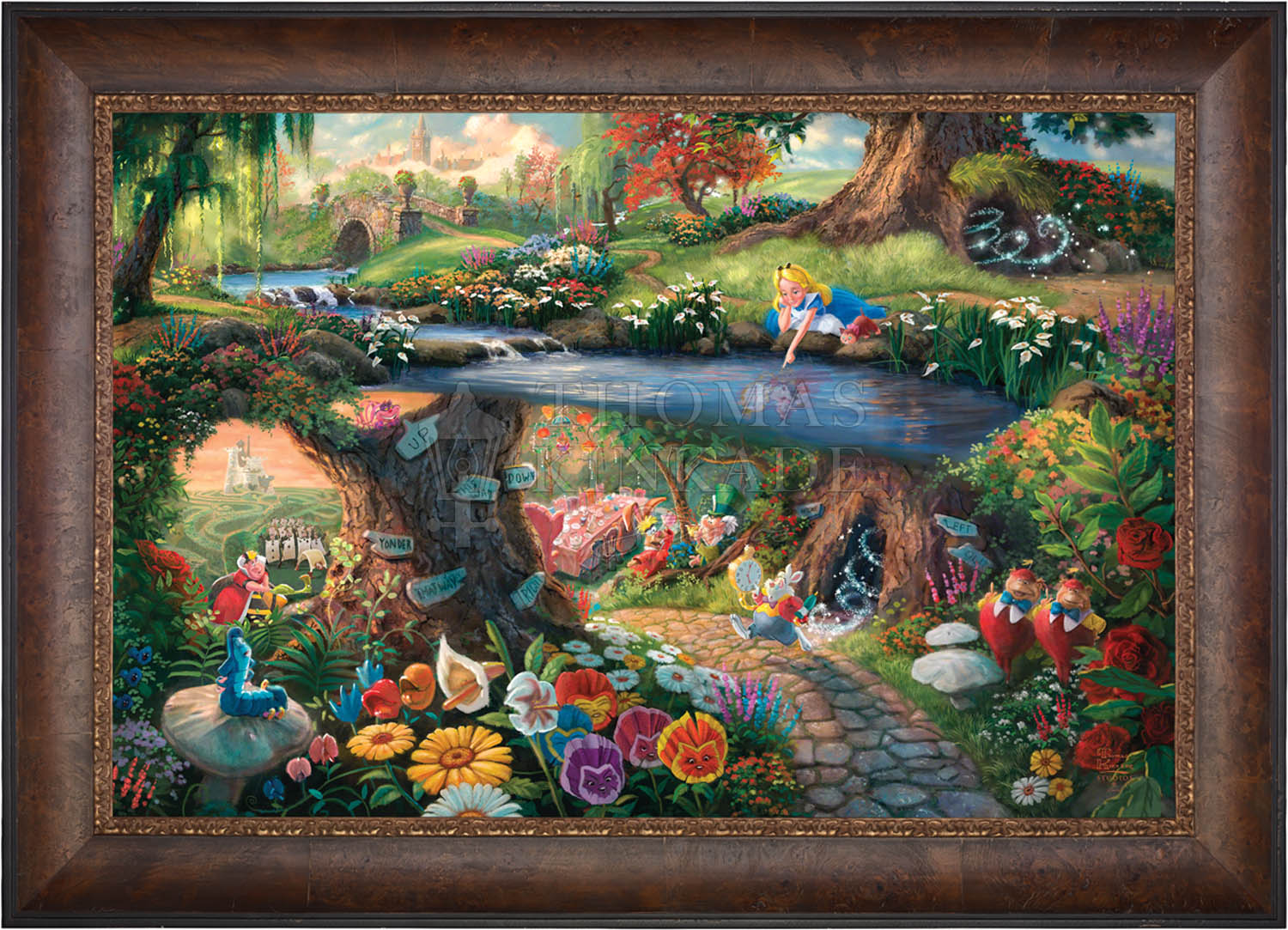 The story tells of a young girl named Alice who accidentally falls down a rabbit hole and finds herself on a curious adventure and in the presence of a number of odd and interesting characters. In 1951, Walt Disney realized a long-held ambition and brought this enchanting tale to the big screen, infusing it with his own brand of animated magic and family fun. Disney Alice in Wonderland as illustrated by John Tenniel was exquisitely detailed in the book, while the Disney film was a modernist style with a highly saturated color palette. The Thomas Kinkade Studios painting of Disney Alice in Wonderland captures all the great Disney characters. The hurried White Rabbit, the enigmatic Caterpillar, the lunatic Mad Hatter, the nonsensical Tweedledee and Tweedledum all play a part in the world down the hole. There is also Alice, viewing it all with a child's innocence and relating to it in a way that brings out the wonderment in all of us. It is with a great deal of pride that we present the Thomas Kinkade Studios painting Disney Alice in Wonderland inspired by the literary genius of Lewis Carroll and animated mastery of Walt Disney.