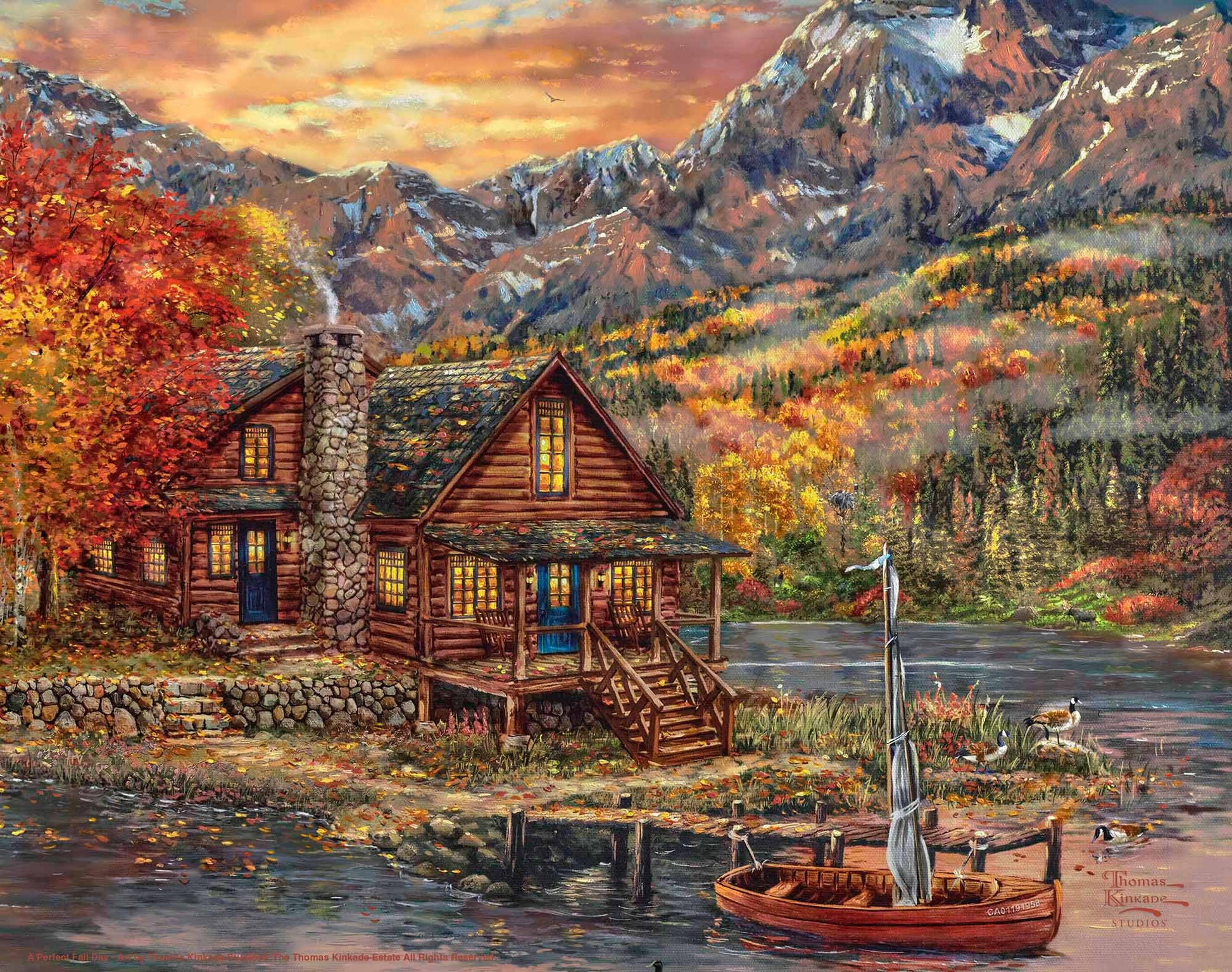 While summer evokes memories of green fields of grass, a hot blistering sun and splashing in a cool lake, fall immediately calls to mind the vivid changing of colors and the advance of cooler temperatures. In A Perfect Fall Day, a rustic cabin sits on a peaceful lake surrounded by mature trees displaying vibrant fall colors and the mountains are starting to have an accumulation of snow on their peaks. Join Thomas Kinkade Studios by the campfire and watch the colors change, the ducks bob in the lake and enjoy A Perfect Fall Day.