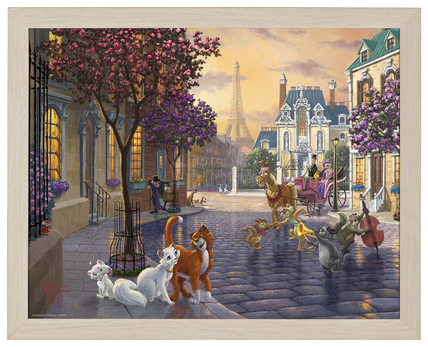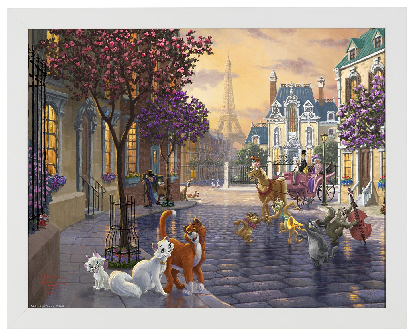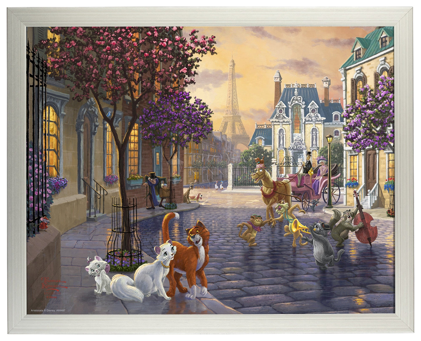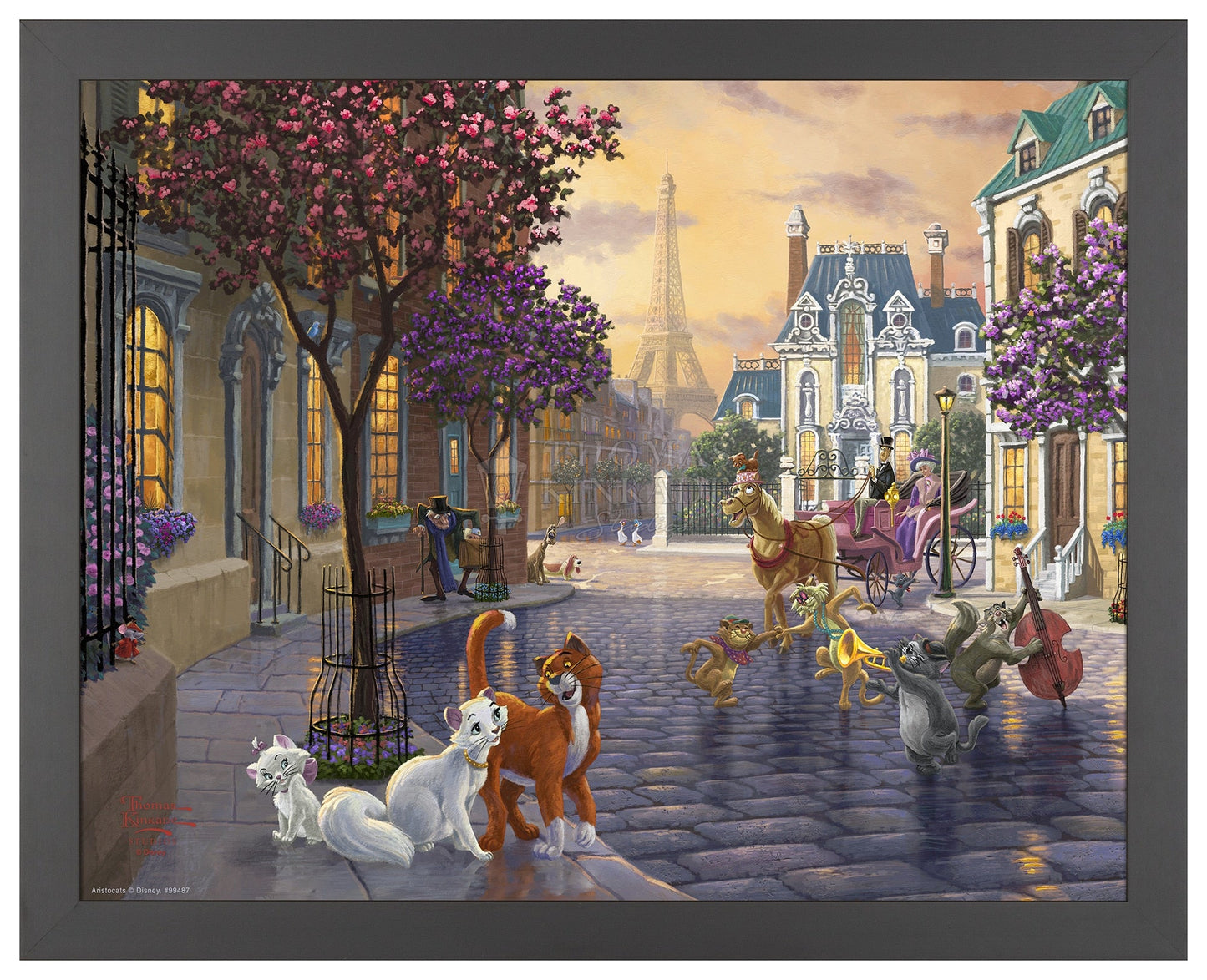 Thomas Kinkade Studios is proud to revisit the 1970 classic film The Artistocats, a story of love, family, companionship, greed, betrayal, heroes and true friendships. Those sentiments are portrayed throughout the painting, from the quiet Paris neighborhood to the romance of the Eiffel Tower. The old man on the left is Georges, Madame Bonfamille’s attorney. As Madame reveals her will to Georges, her butler Edgar overhears that she is leaving her fortune to her cats and then upon their death her estate will pass on to him. The impatient scowl on the face of Edgar is a preview of his plot to do away with all four of Madame’s cats and their claim to Madame Bonfamille’s estate. Join us as we peer into the lives of a misfit cast of militaristic dogs, gossipy geese, and tough alley cats as they help a family of felines make their way back home.