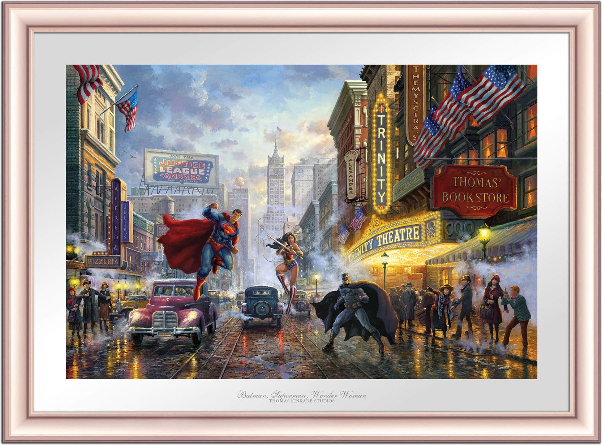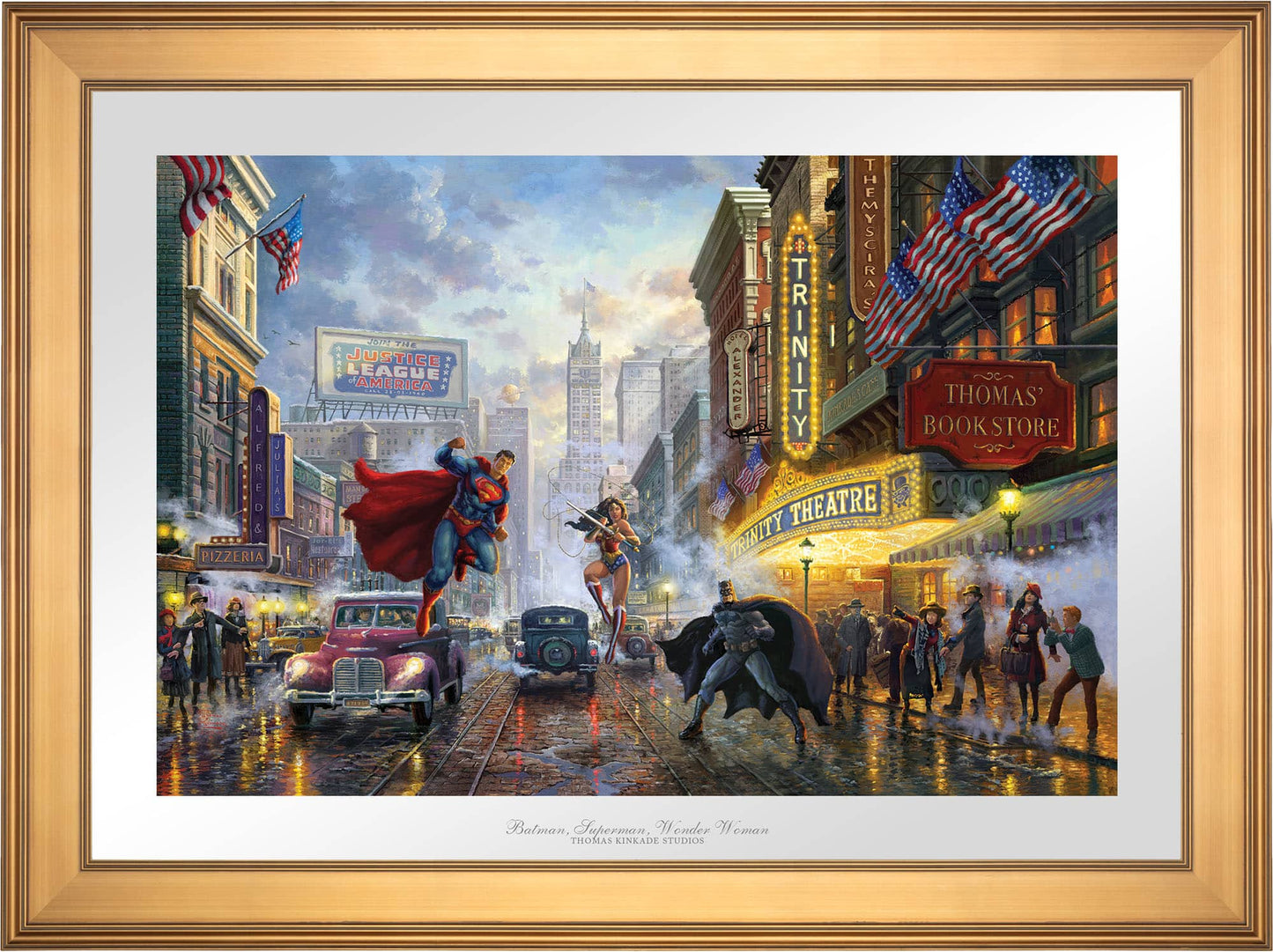 Call UsTogether, Batman, Superman and Wonder Woman™ form an epic alliance of DC Super Heroes, often referred to as "The World's Finest Trinity". Individually, they are some of the most powerful characters in the comic book universe, and united, they are virtually unstoppable. Fans around the globe have long celebrated their bond and their legendary stories. The Thomas Kinkade Studios is proud to present Batman, Superman, and Wonder Woman: The Trinity I, our first Limited Edition Art release paying homage to classic DC characters. In this scene, the trio is preparing to fight an enemy in a place that evokes iconic memories from each hero's personal history. From arch enemies and beloved friends to important dates, we invite you to explore the hidden salutes we have included in this painting.