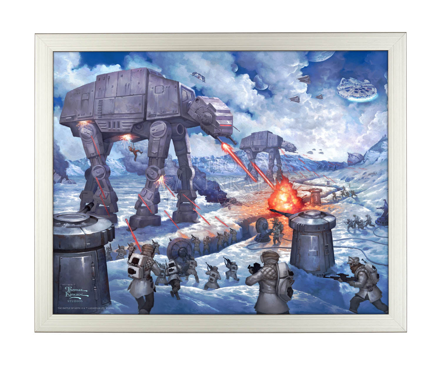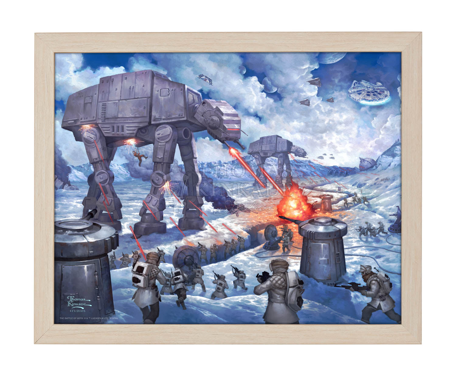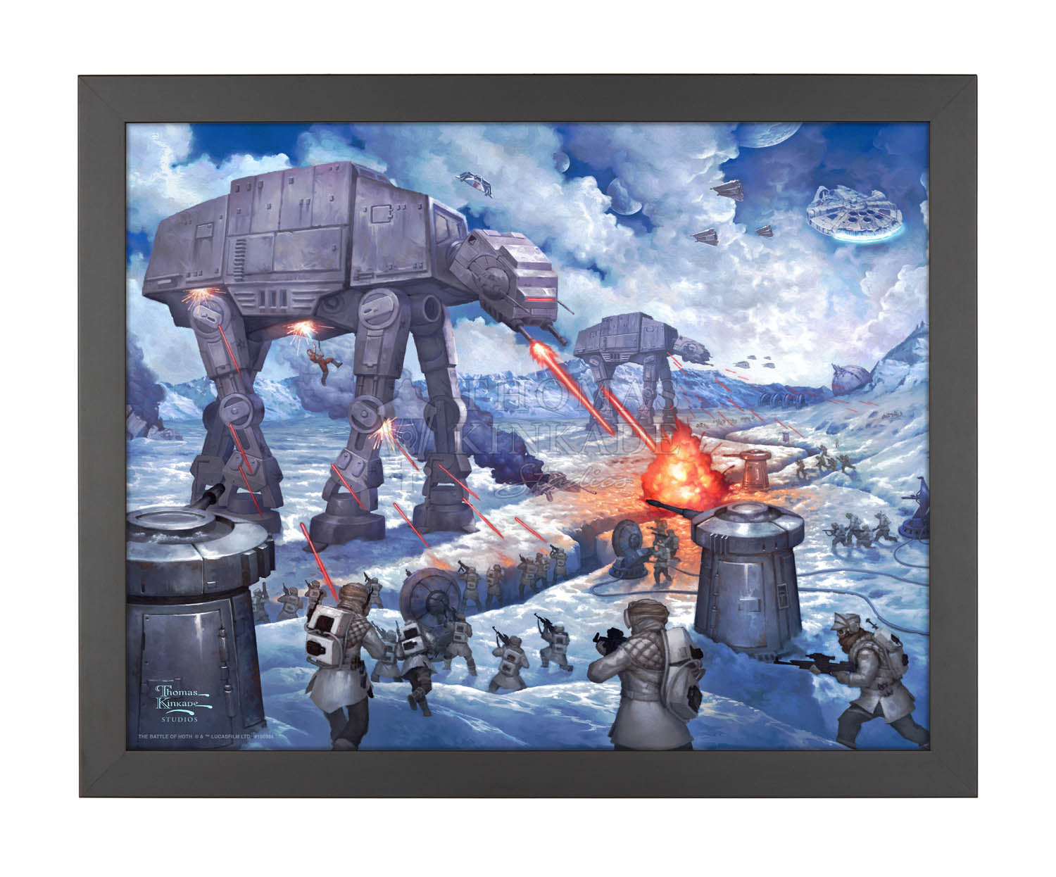 With the energy shield in peril, Princess Leia™, Han Solo™, Chewbacca™, and C-3PO™ are one step ahead of Darth Vader™ and the Imperial Stormtroopers™ who have entered the ice base. They are able to escape aboard the Millennium Falcon™ bound for the Rebel forces rendezvous point beyond the Outer Rim. “The Battle of Hoth” by Thomas Kinkade Studios defines a critical moment between the Empire and the Rebels.