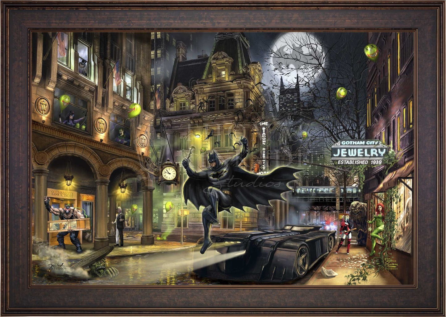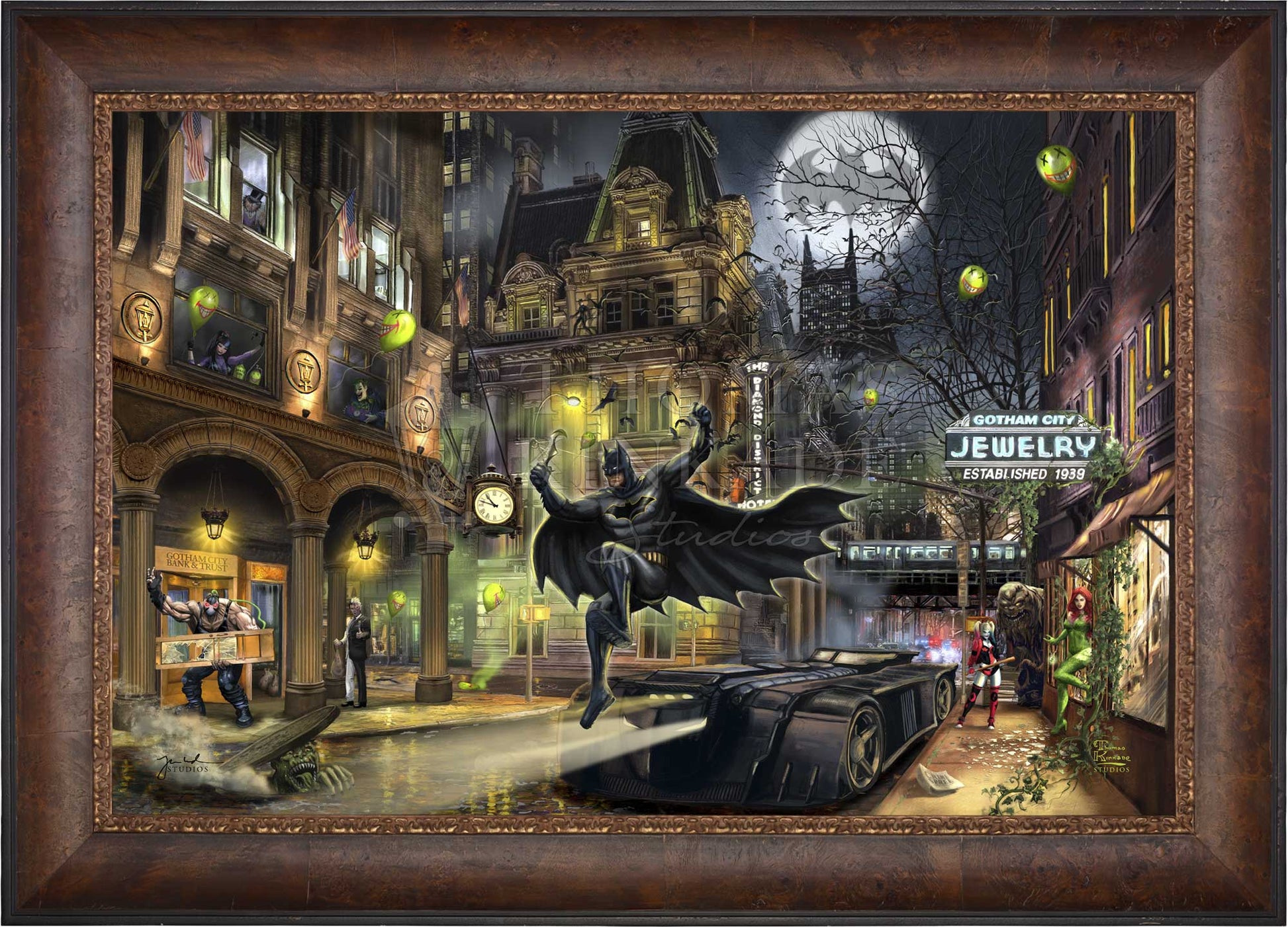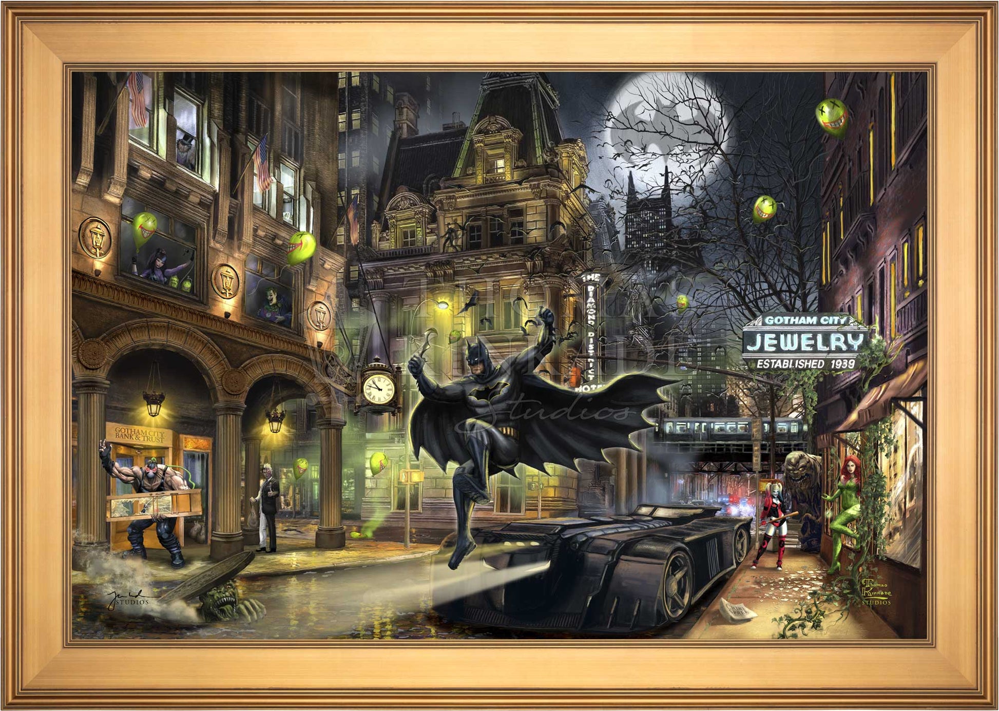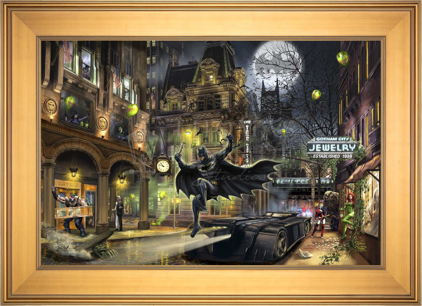 Since its inception, Gotham City has been overrun with crime and corruption, and immortalized as a dark, foreboding city. As the years went by, Gotham City seemed to dive deeper and deeper into darkness, but from that darkness arose one of DC’s greatest Super Heroes: Batman. In Batman™ Gotham City™ by Thomas Kinkade Studios, Batman jumps off the Batmobile parked on a Gotham City Street, as he is responding to the Bat-Signal. Every night in this metropolis provides an electrifying new battle against evil, and this painting captures the excitement and danger that accompanies Batman in his quest to rid the notorious city of crime.