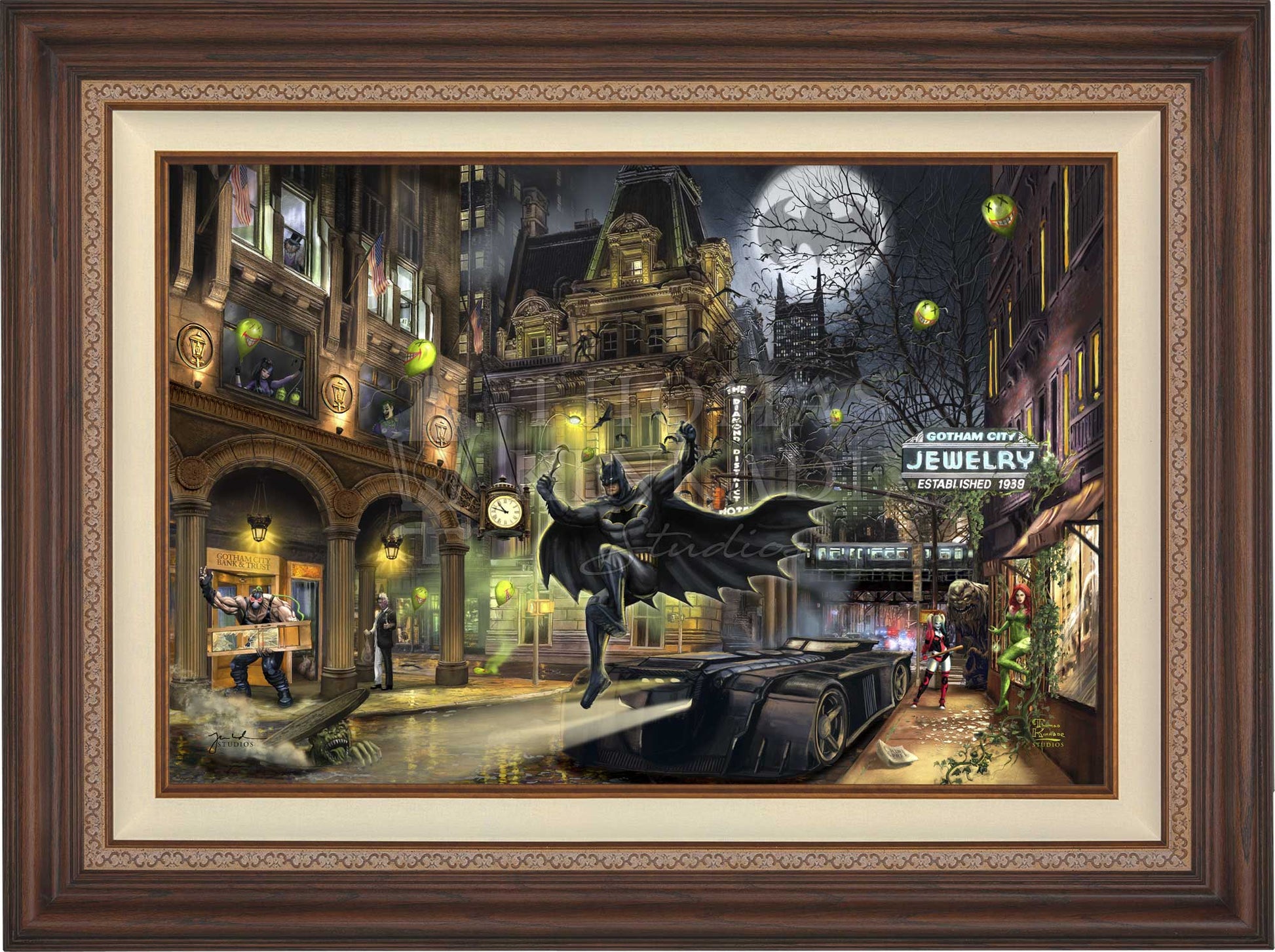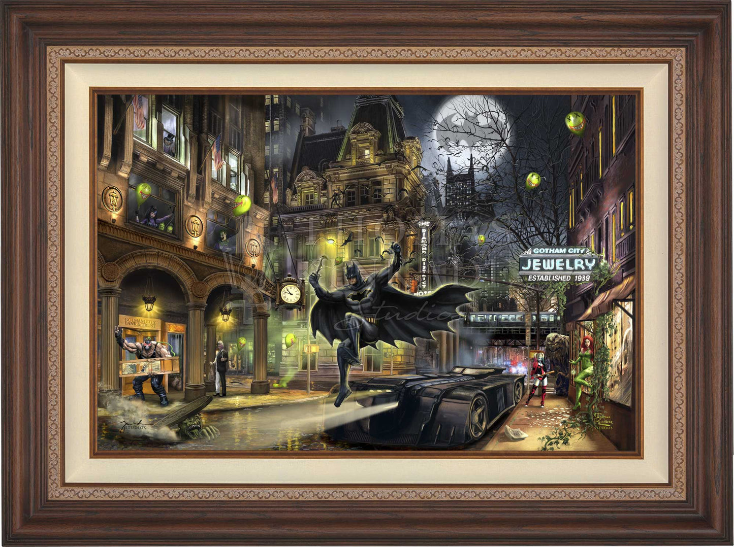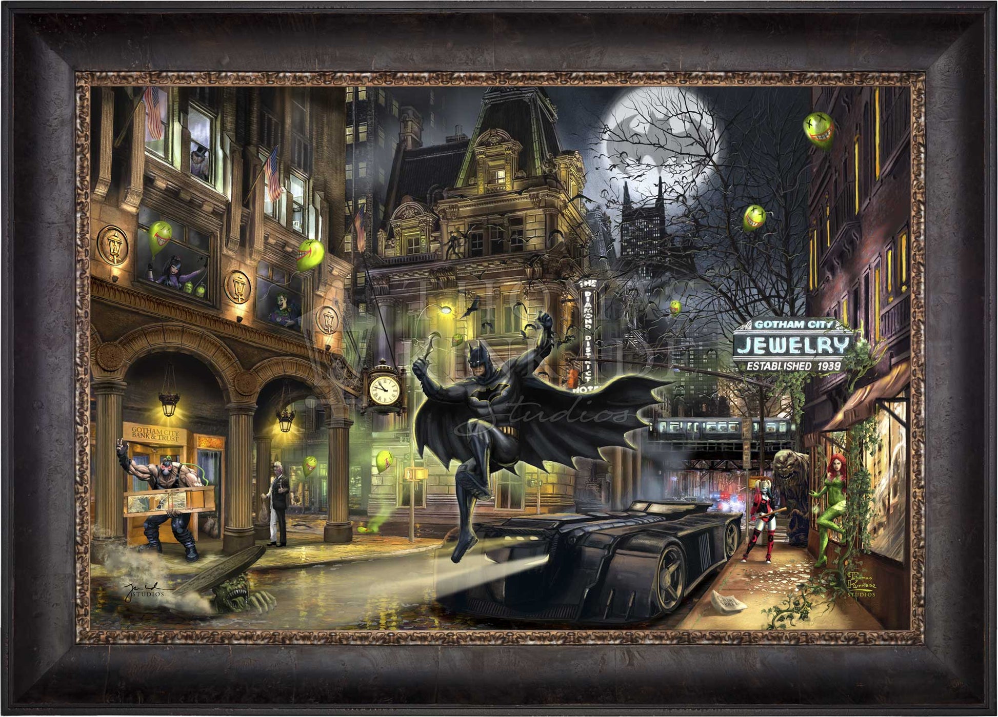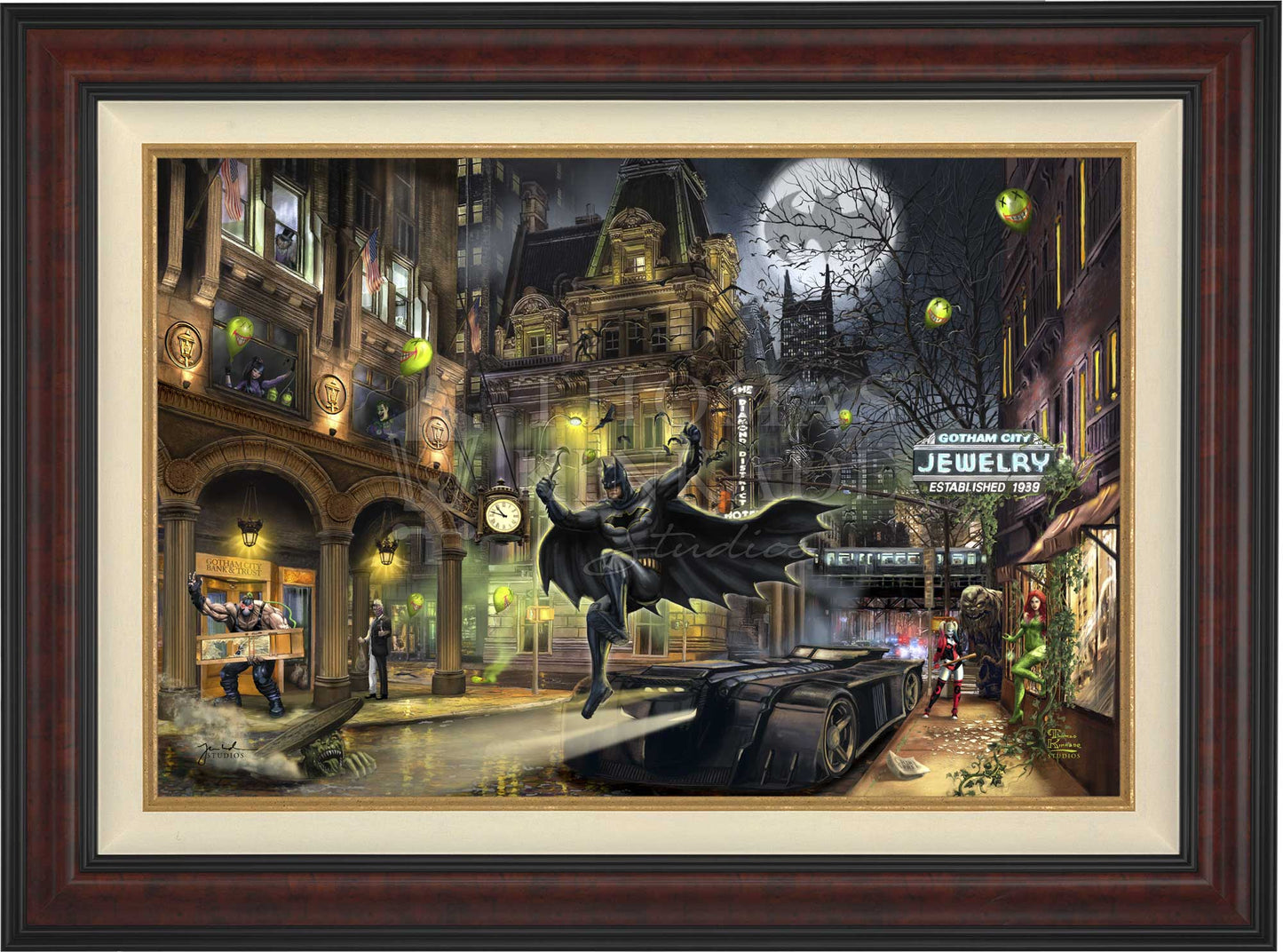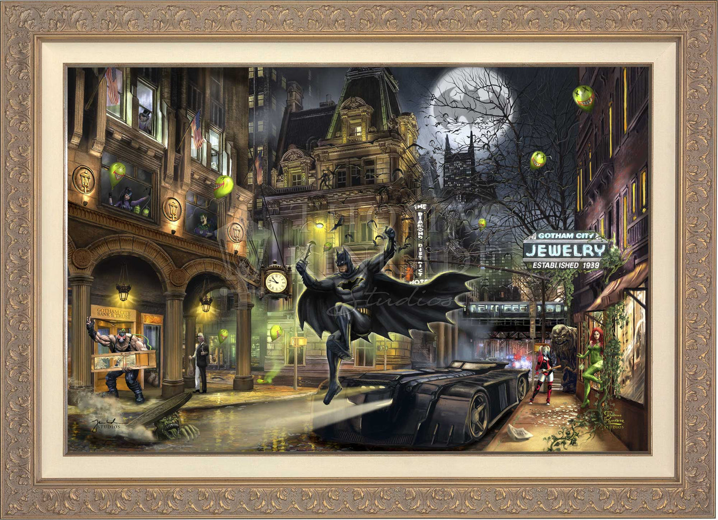 Since its inception, Gotham City has been overrun with crime and corruption, and immortalized as a dark, foreboding city. As the years went by, Gotham City seemed to dive deeper and deeper into darkness, but from that darkness arose one of DC’s greatest Super Heroes: Batman. In Batman™ Gotham City™ by Thomas Kinkade Studios, Batman jumps off the Batmobile parked on a Gotham City Street, as he is responding to the Bat-Signal. Every night in this metropolis provides an electrifying new battle against evil, and this painting captures the excitement and danger that accompanies Batman in his quest to rid the notorious city of crime.
