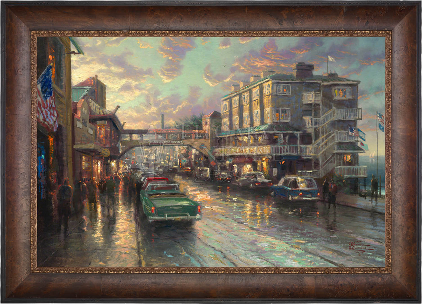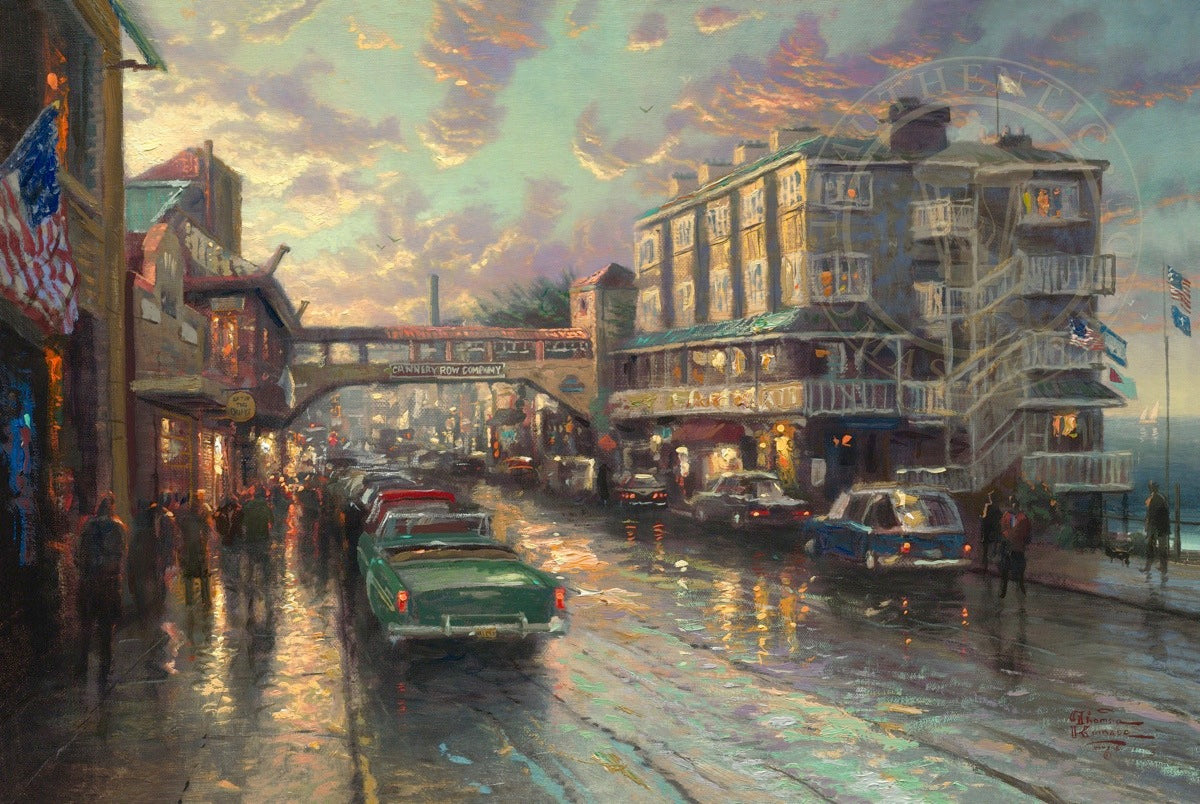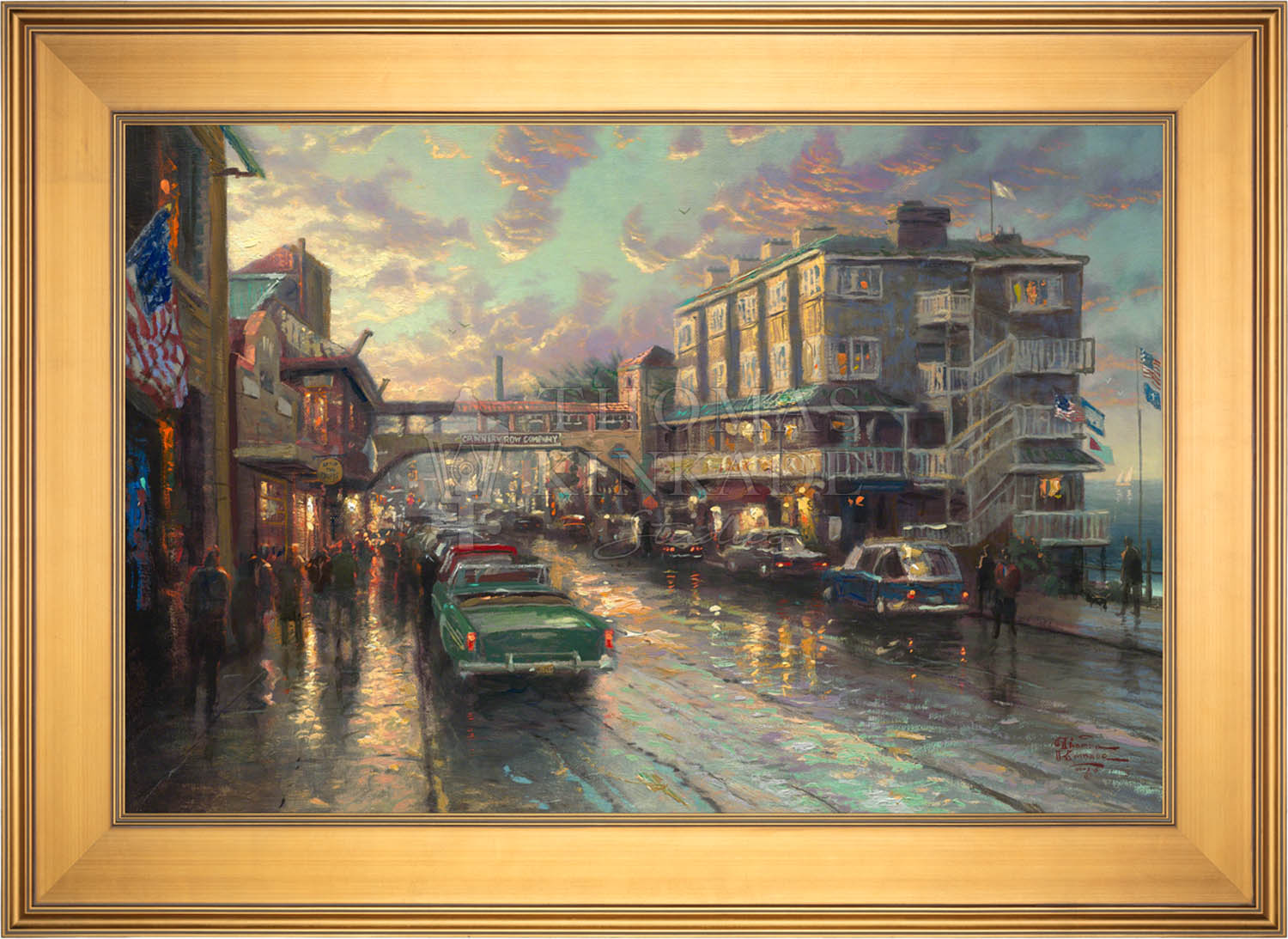 As I continue my odyssey as an artist, I find myself drawn to the historic seaside villages of California. One of the reasons, I believe, is that the coastal air, saturated with mist, lays down a mirror-like film of moisture on streets and walks. Cannery Row Sunset created to celebrate Cannery Row's 50th Anniversary makes full use of the reflective play of light and color on the streets and upon the luminous surface of Monterey Bay.