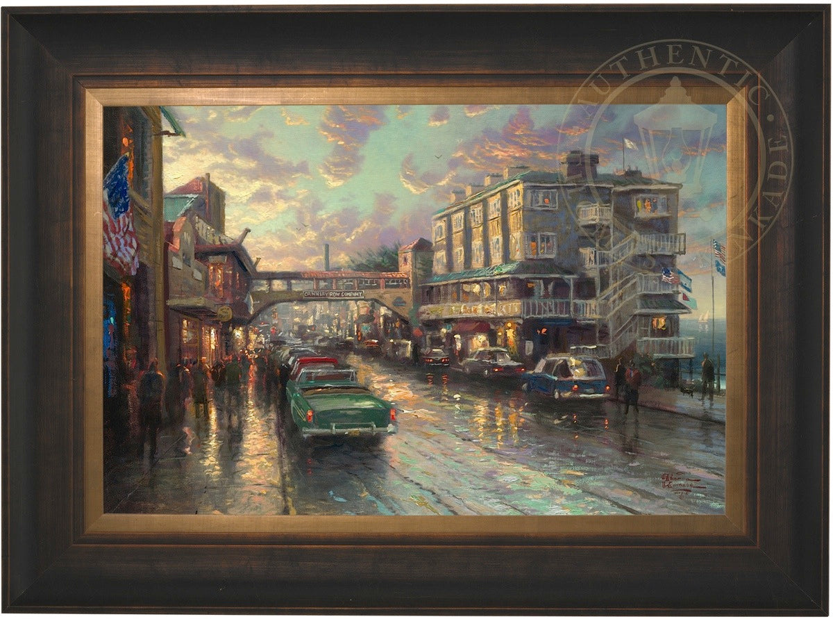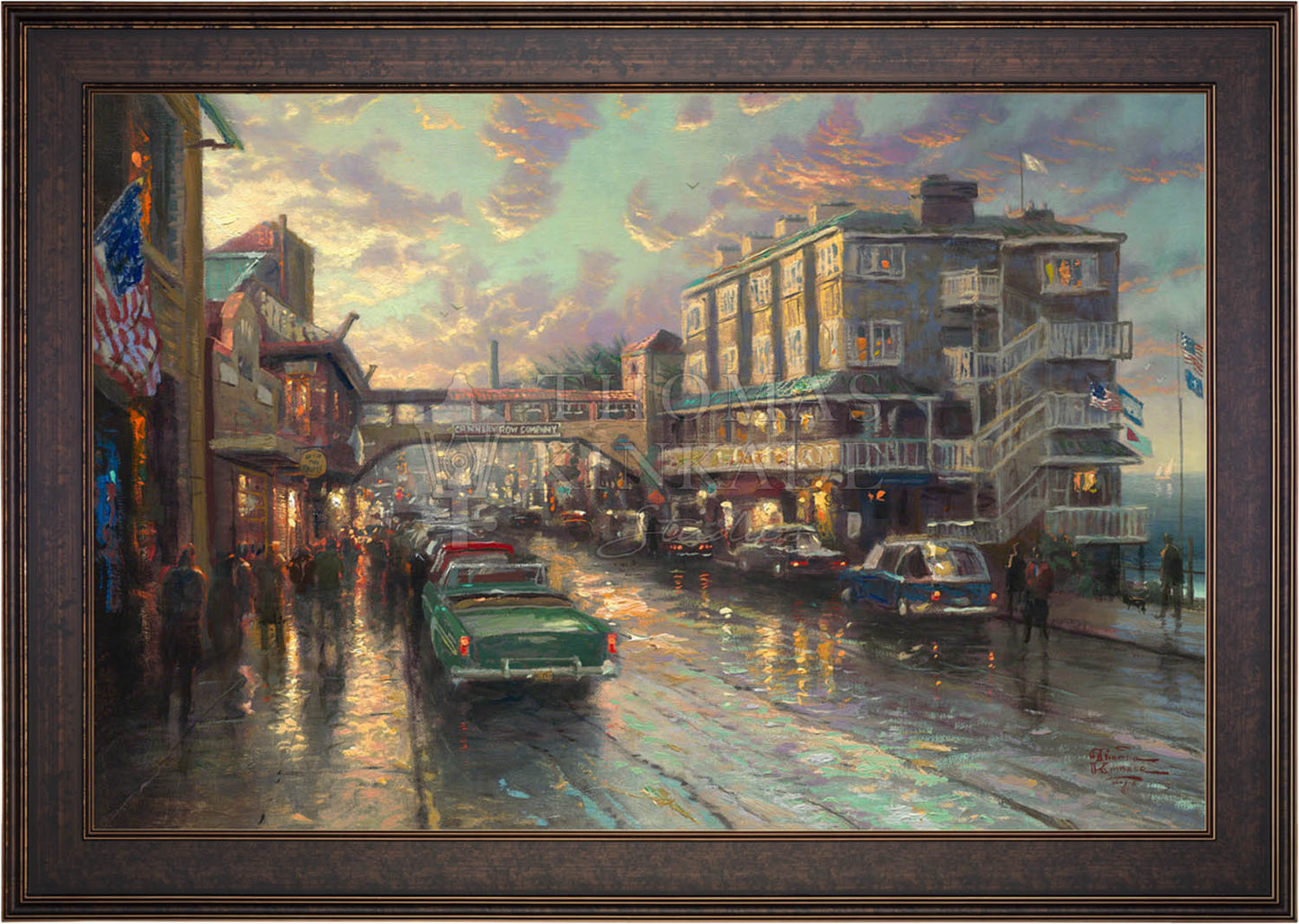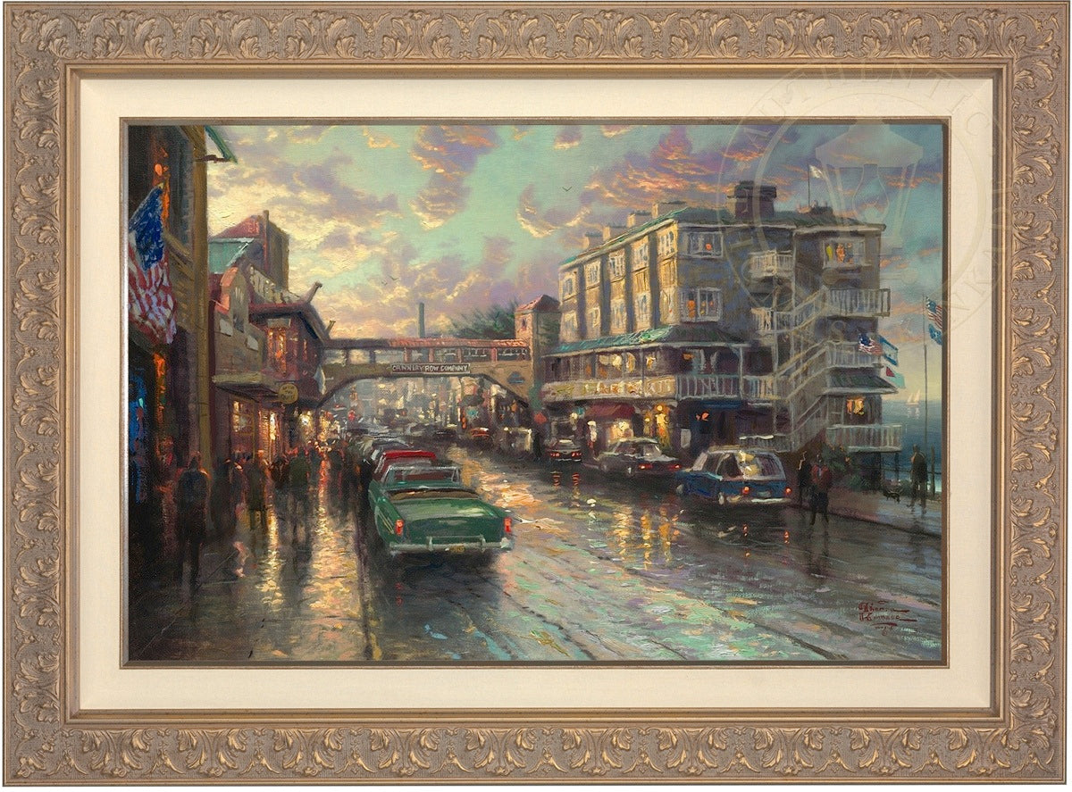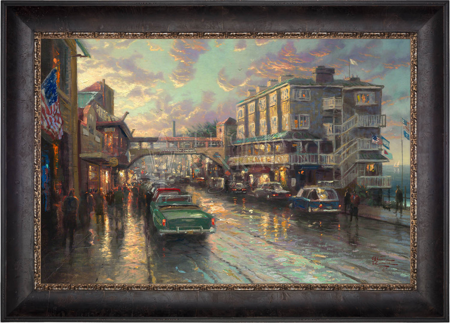 As I continue my odyssey as an artist, I find myself drawn to the historic seaside villages of California. One of the reasons, I believe, is that the coastal air, saturated with mist, lays down a mirror-like film of moisture on streets and walks. Cannery Row Sunset created to celebrate Cannery Row's 50th Anniversary makes full use of the reflective play of light and color on the streets and upon the luminous surface of Monterey Bay.