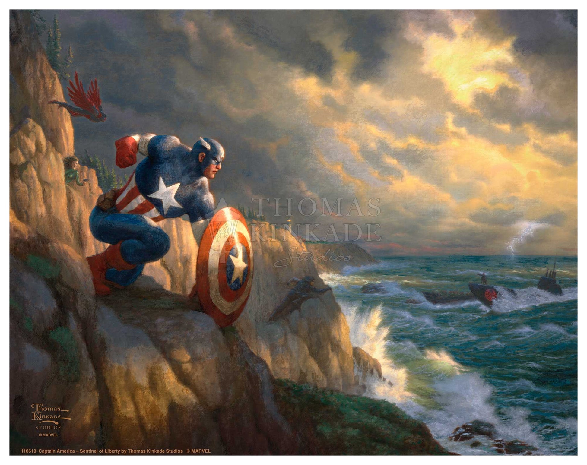 On the shore’s rocky outcrop, Captain America has positioned himself ready to battle Red Skull and his Hydra henchmen, who are approaching the coast in submarines. Viper has emerged from her rocky hiding place to surprise our hero and aid Red Skull in making landfall. Unbeknownst to Viper, Falcon has taken wing to assist Captain America in thwarting Red Skull’s attack. The mysterious Winter Soldier stealthily clings to the cliff, ready to strike their shared enemy. Thomas Kinkade Studios proudly presents its new Marvel Comics collaboration Captain America - Sentinel of Liberty.