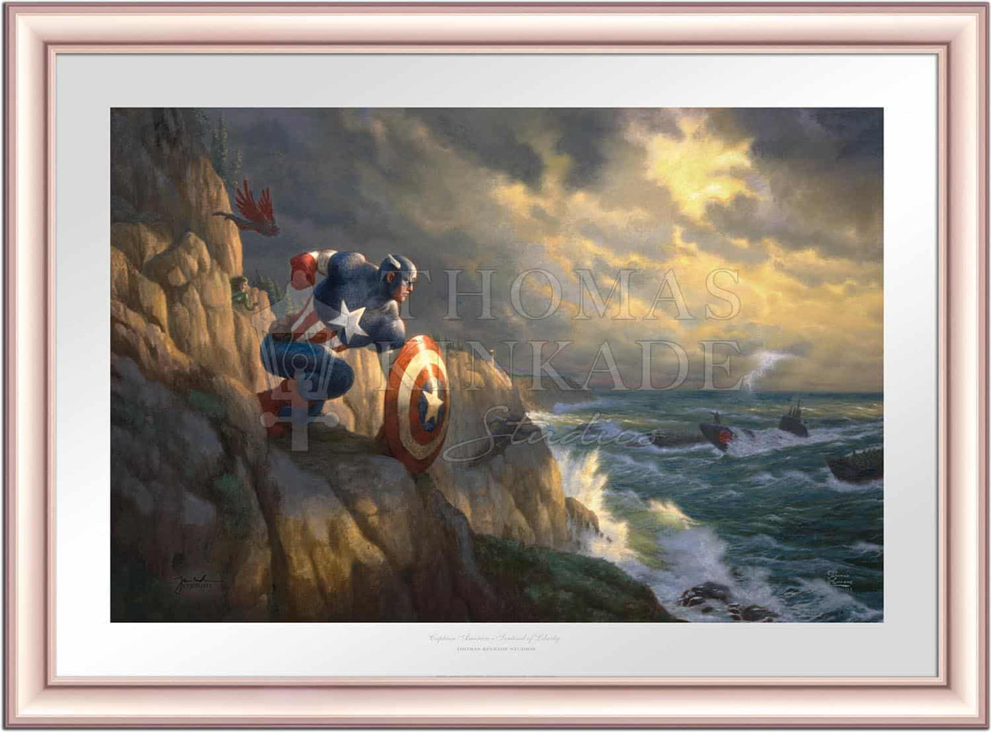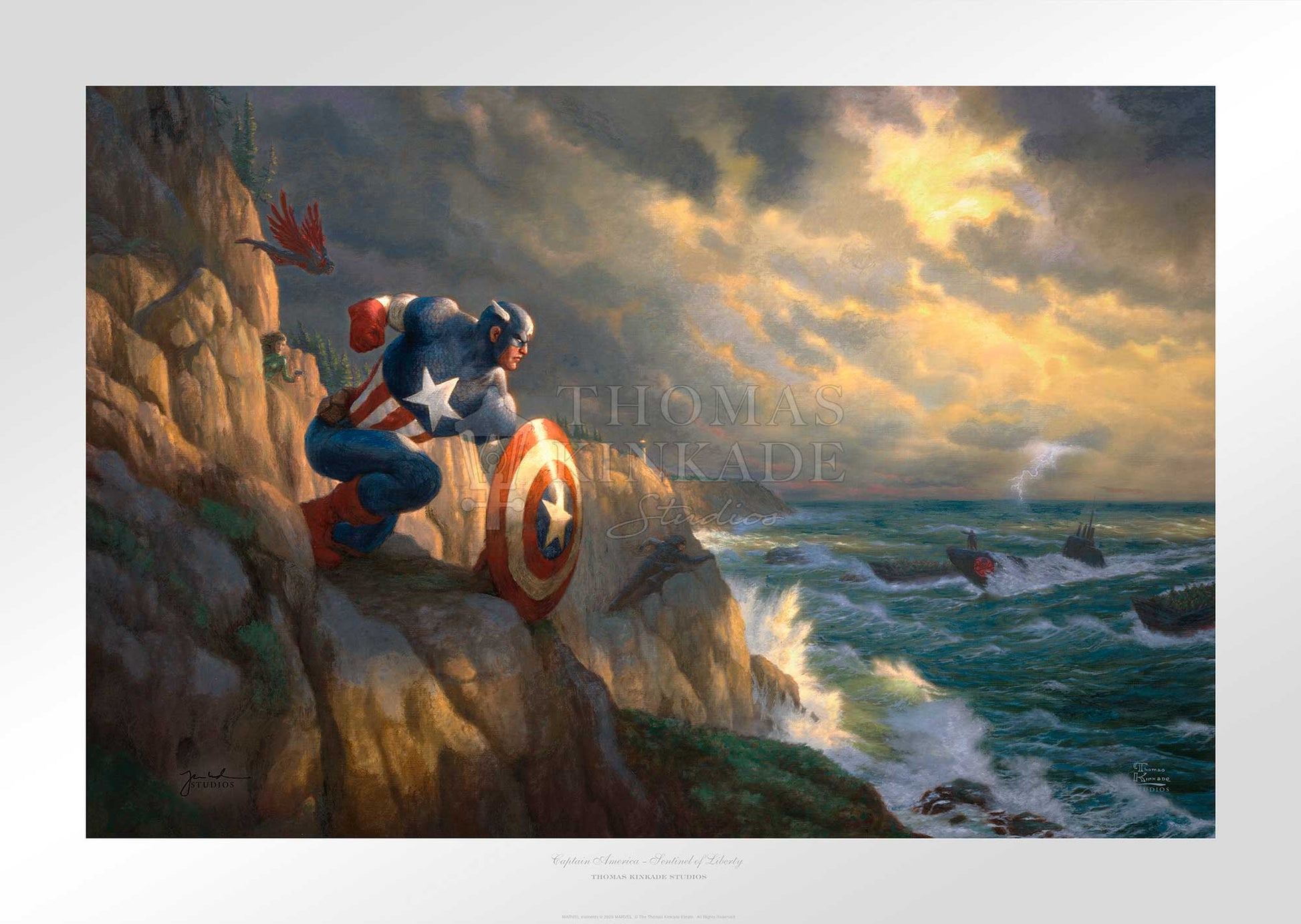 On the shore’s rocky outcrop, Captain America has positioned himself ready to battle Red Skull and his Hydra henchmen, who are approaching the coast in submarines. Viper has emerged from her rocky hiding place to surprise our hero and aid Red Skull in making landfall. Unbeknownst to Viper, Falcon has taken wing to assist Captain America in thwarting Red Skull’s attack. The mysterious Winter Soldier stealthily clings to the cliff, ready to strike their shared enemy. Thomas Kinkade Studios proudly presents its new Marvel Comics collaboration Captain America - Sentinel of Liberty.