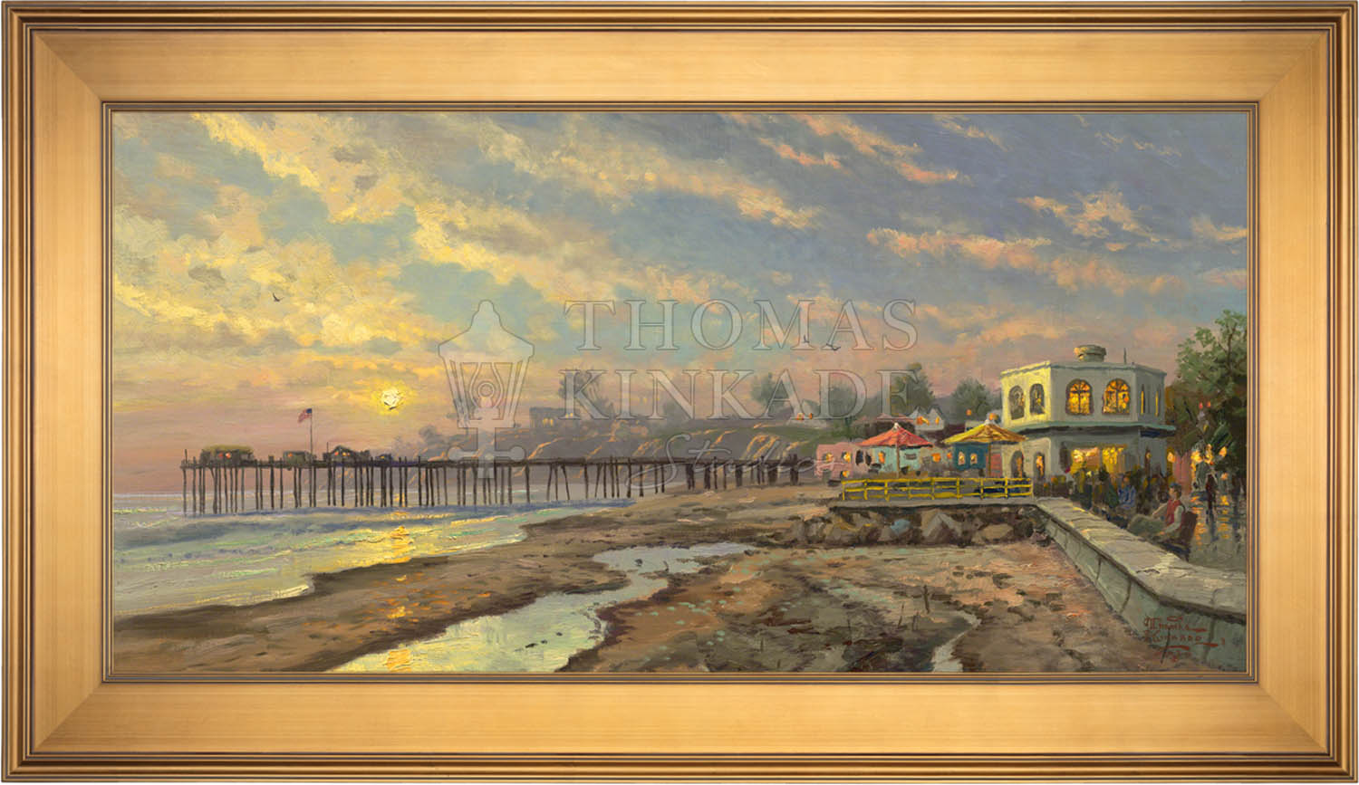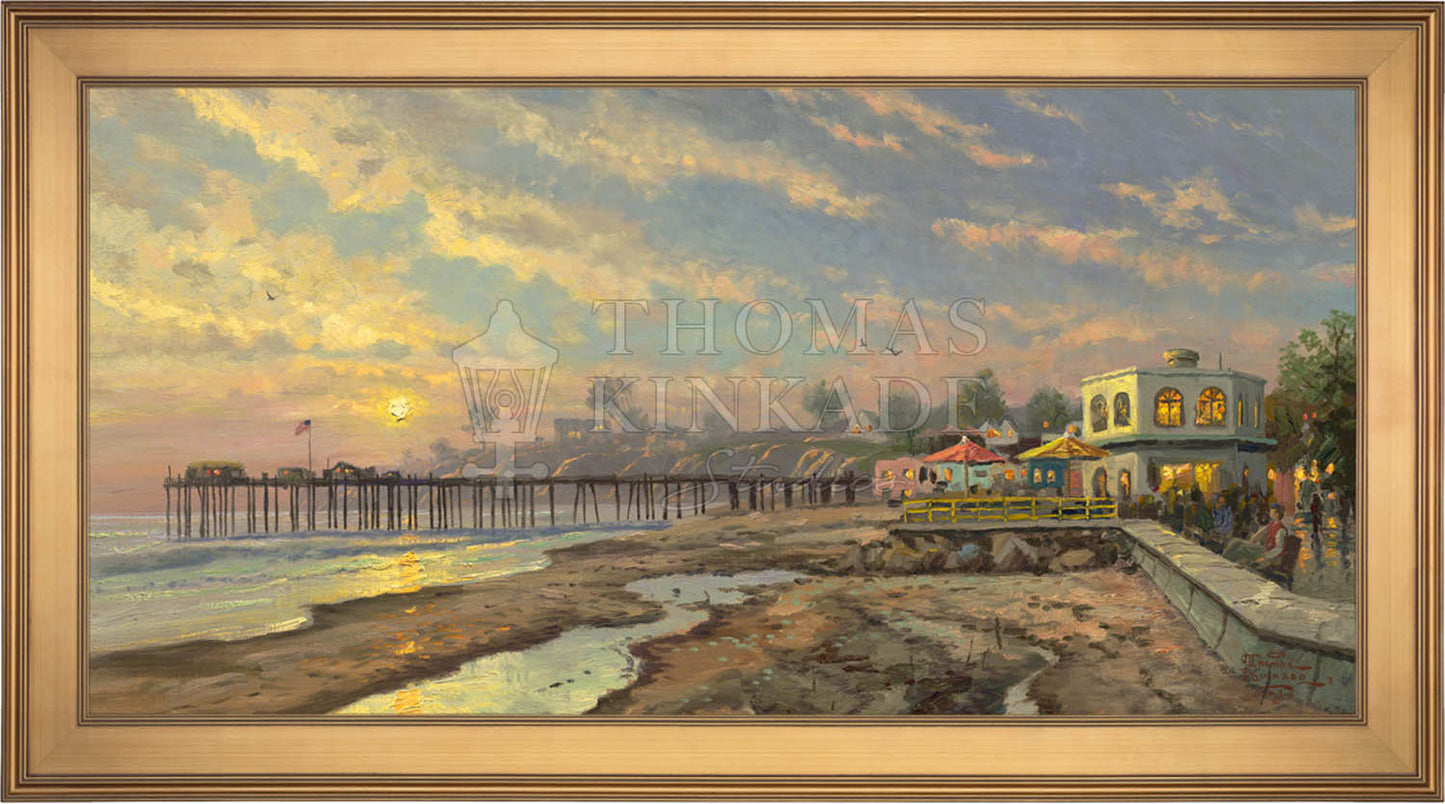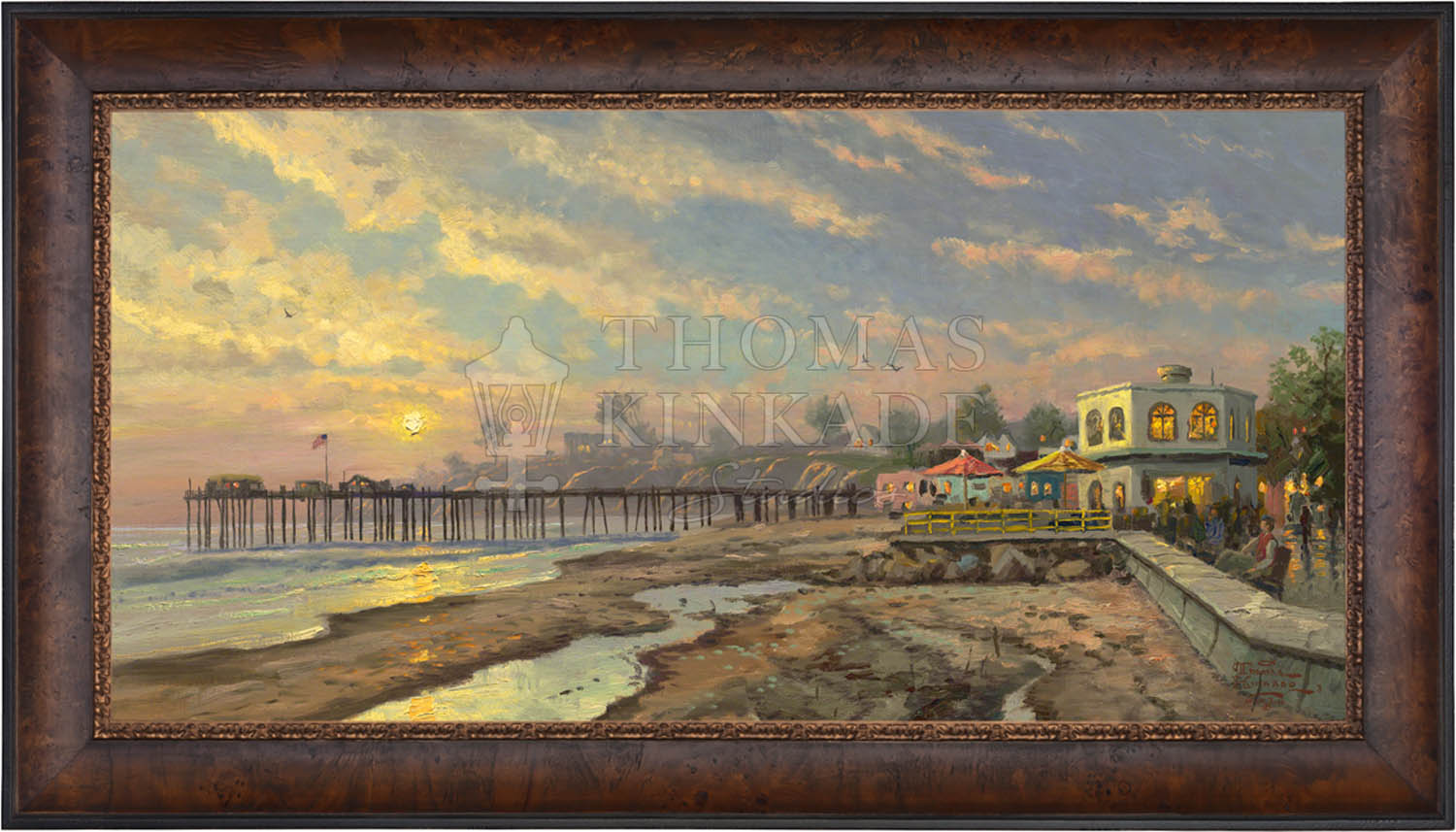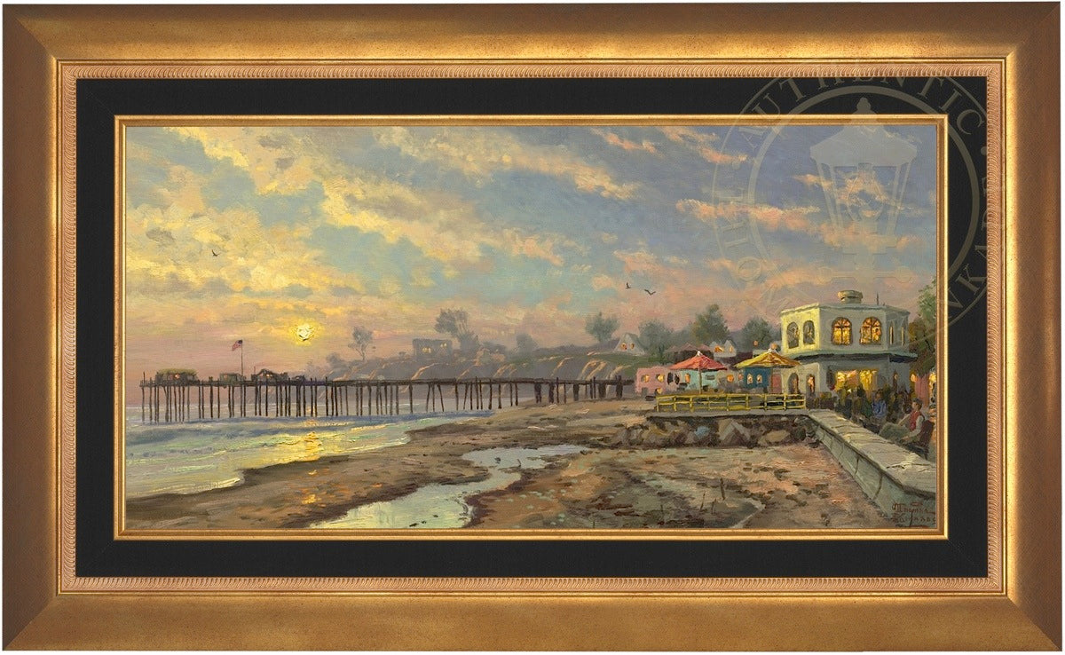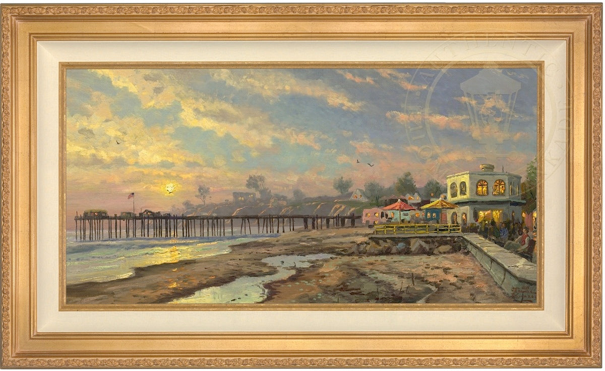 Call UsThe serene seaside village of Capitola, just north of Monterey has become a favorite weekend retreat for the Kinkade family. Recently, I set up my easel under a beach umbrella and began to paint. The ancient wooden pier becomes the centerpiece of luminous ocean waters painted gold by the setting sun; tidal pools become silvery mirrors reflecting the glory of this Capitola Sunset. My family dined in comfort that evening at the intriguing octagonal restaurant as I put the finishing touches on my plein-air celebration of our romantic Capitola Sunset hideaway.