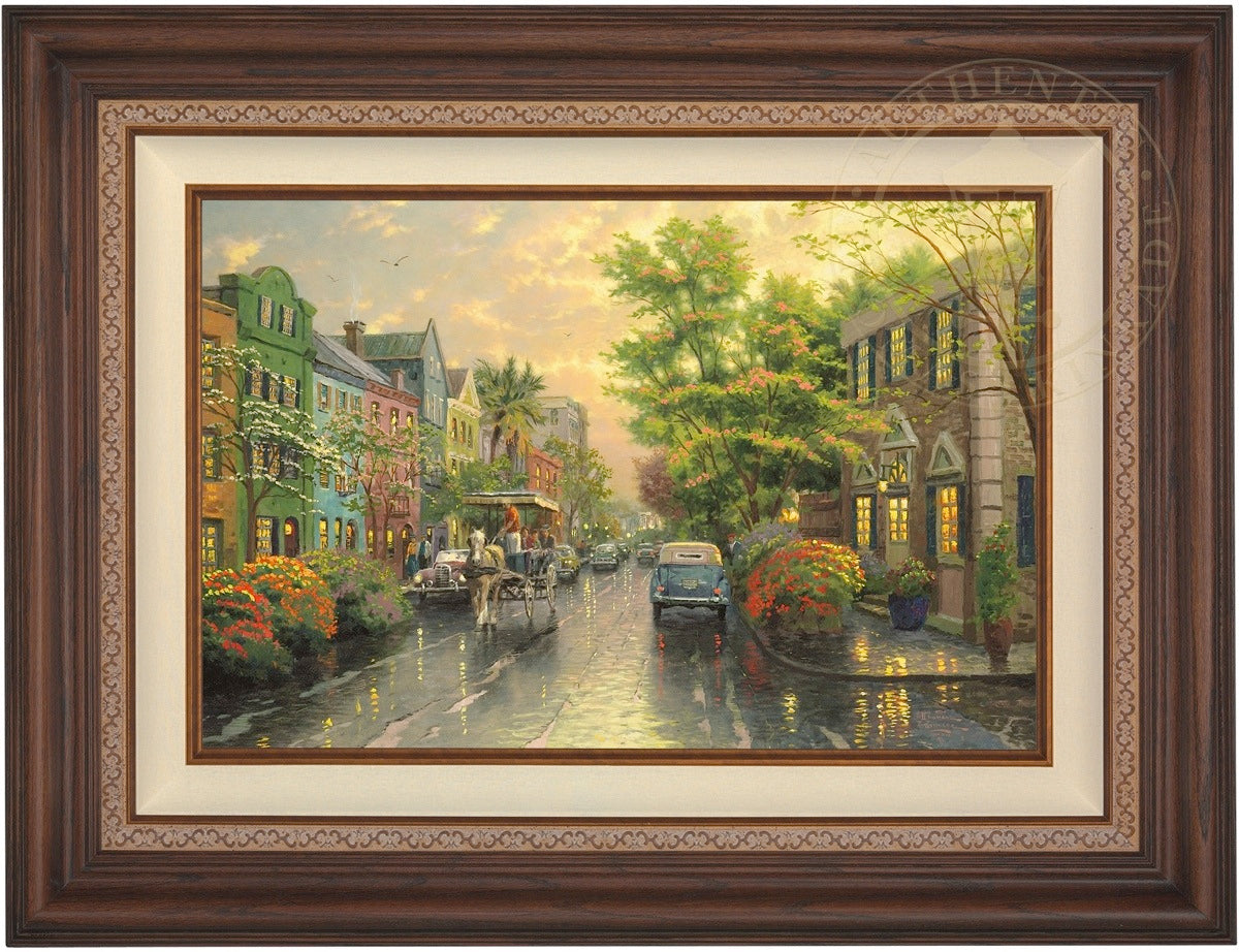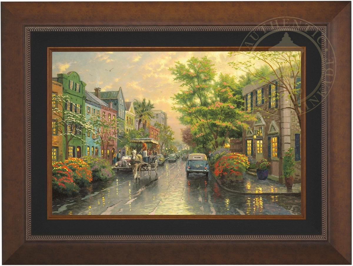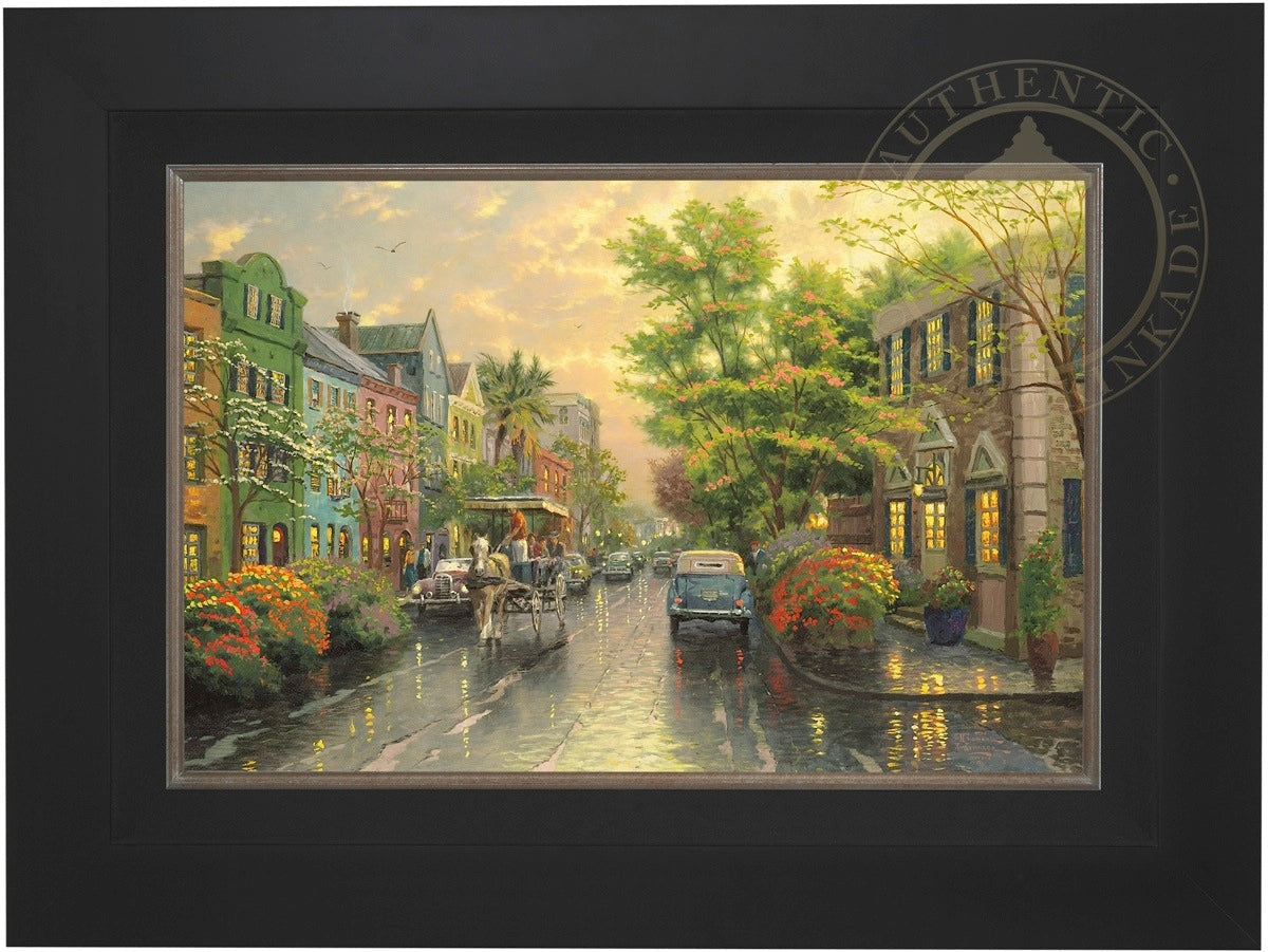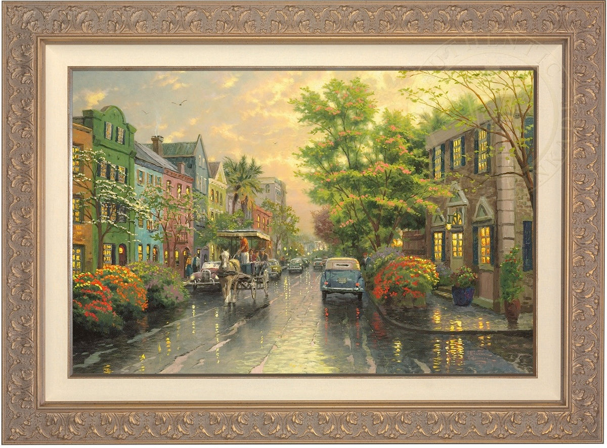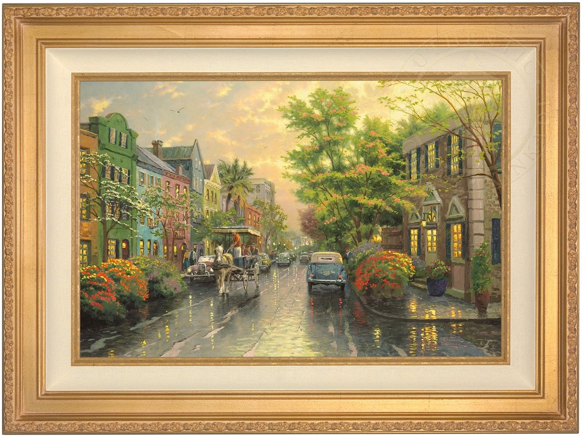 Call UsThe Kinkade family delights in travel. One of our recurring discoveries is Charleston, South Carolina, where the heart of the Old South lives on. The feeling that I get when I visit Charleston is nostalgic, romantic, as if I had somehow stepped back in time. So, as I worked on my studio treatment of Charleston, Sunset on Rainbow Row, I've filled my streets with vintage cars and passersby wearing simple yet timeless garb. Step aboard the horse-drawn carriage for a leisurely visit to Rainbow Row!