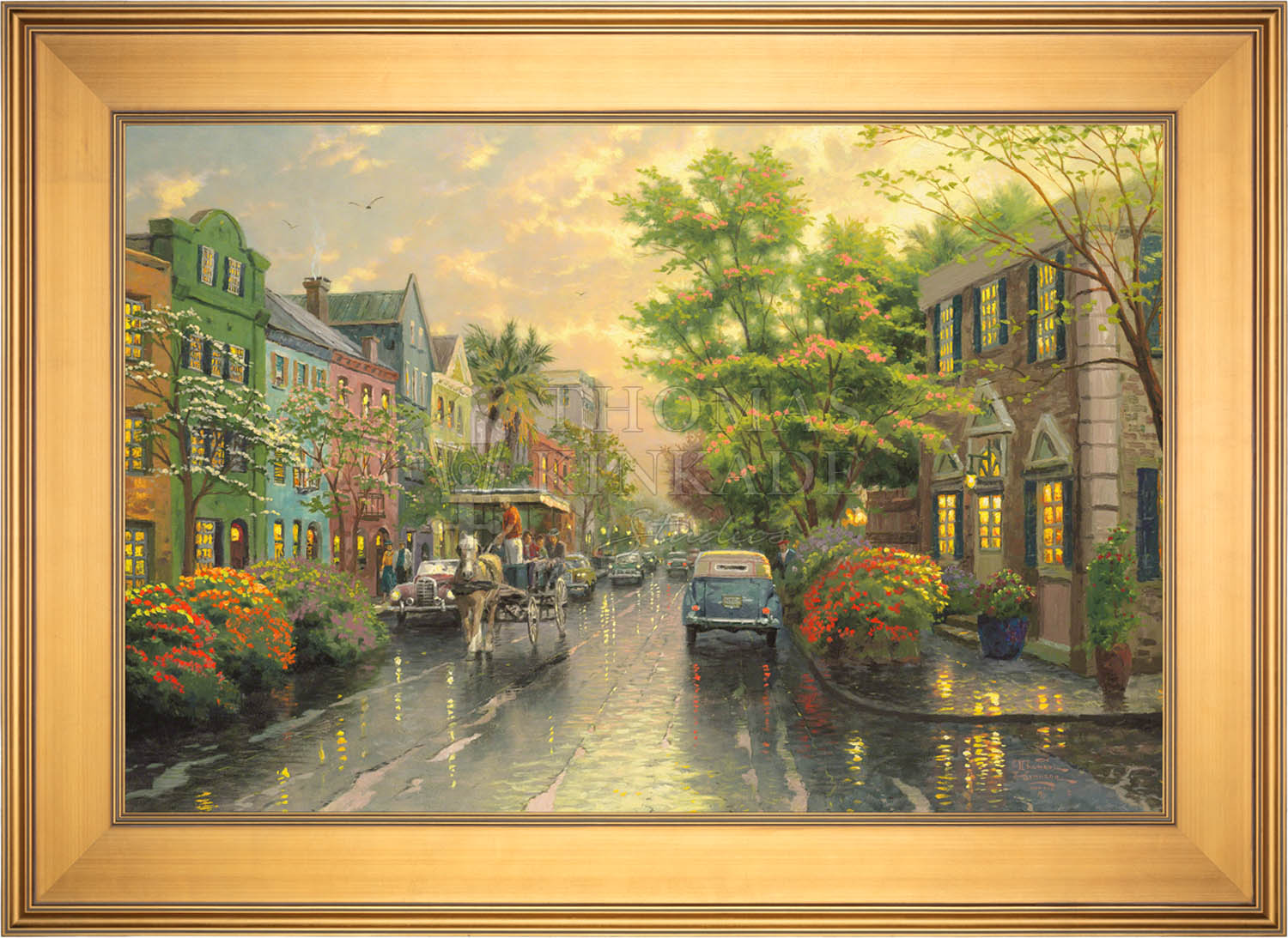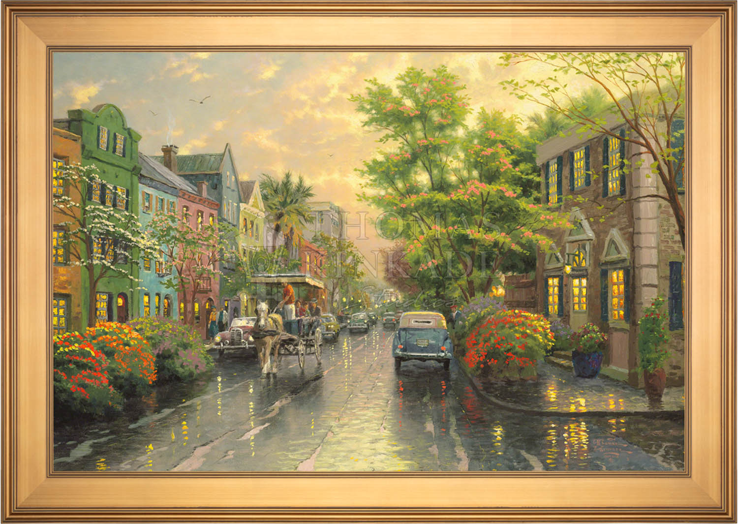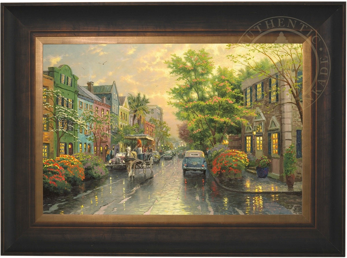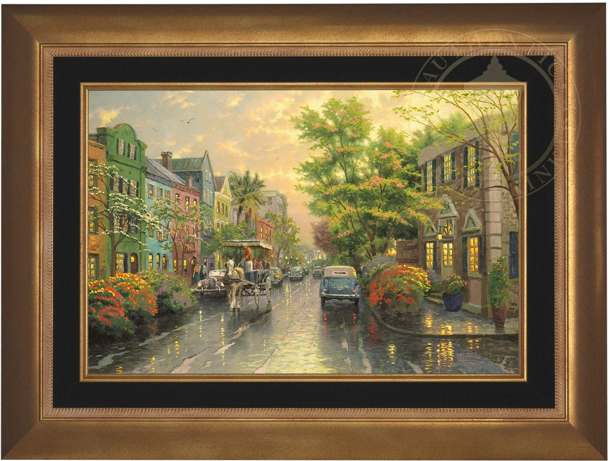 Call UsThe Kinkade family delights in travel. One of our recurring discoveries is Charleston, South Carolina, where the heart of the Old South lives on. The feeling that I get when I visit Charleston is nostalgic, romantic, as if I had somehow stepped back in time. So, as I worked on my studio treatment of Charleston, Sunset on Rainbow Row, I've filled my streets with vintage cars and passersby wearing simple yet timeless garb. Step aboard the horse-drawn carriage for a leisurely visit to Rainbow Row!