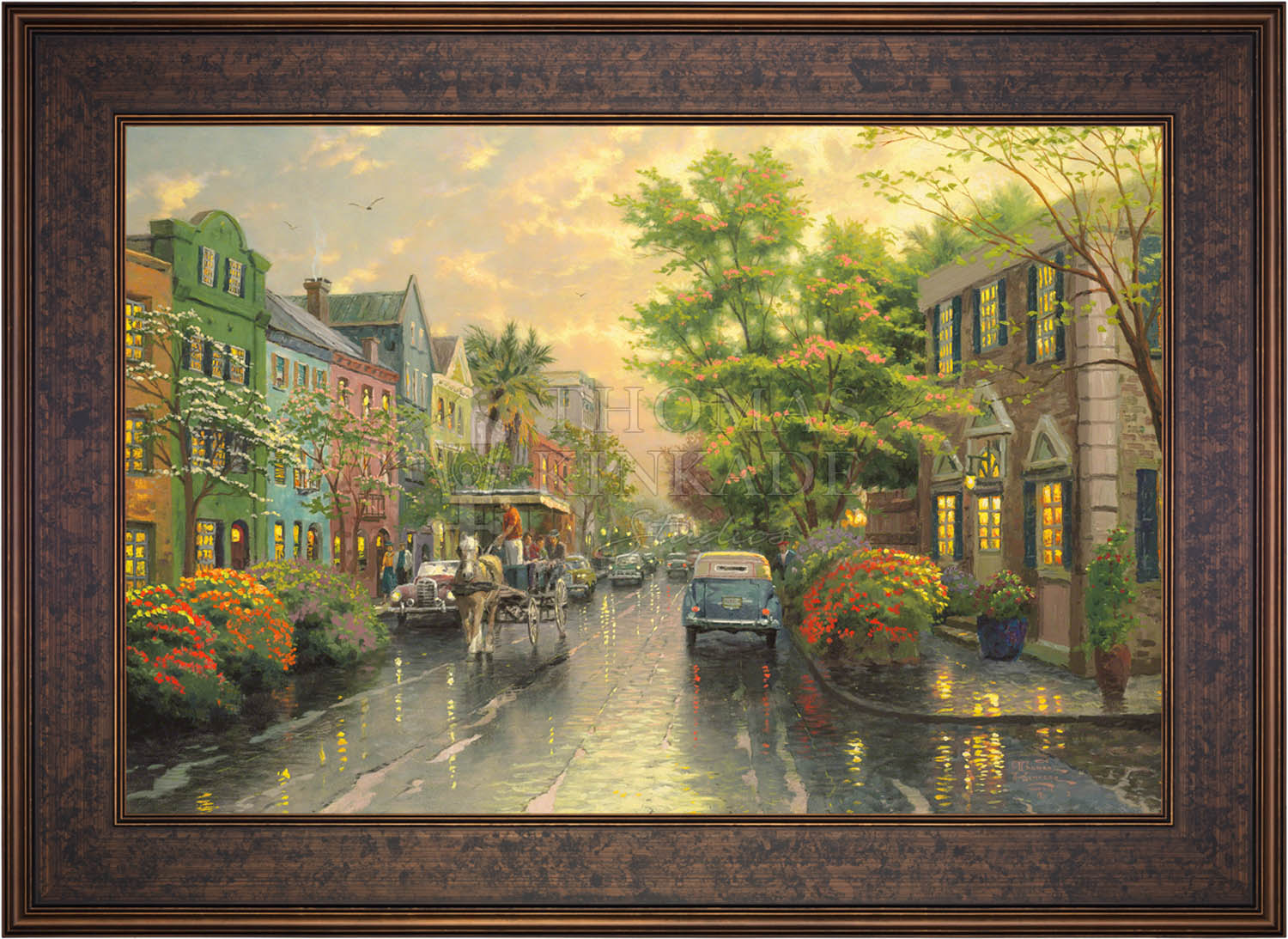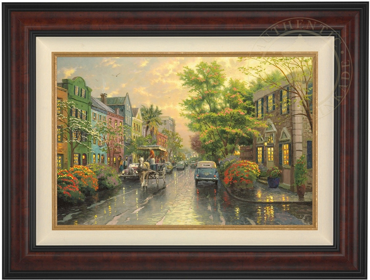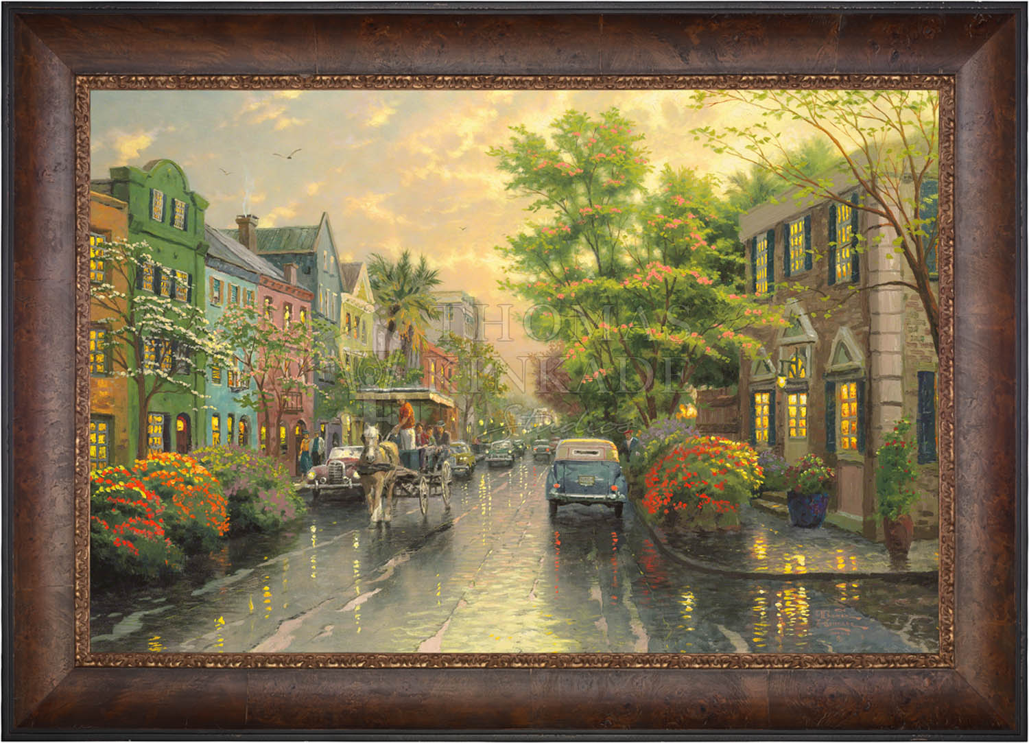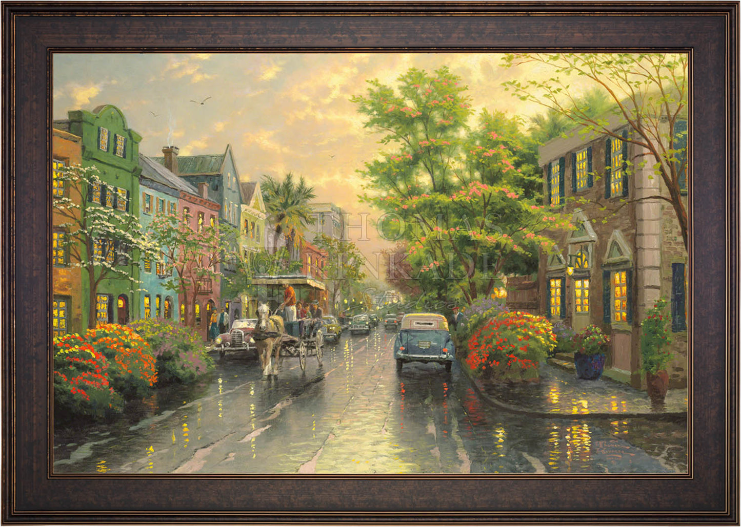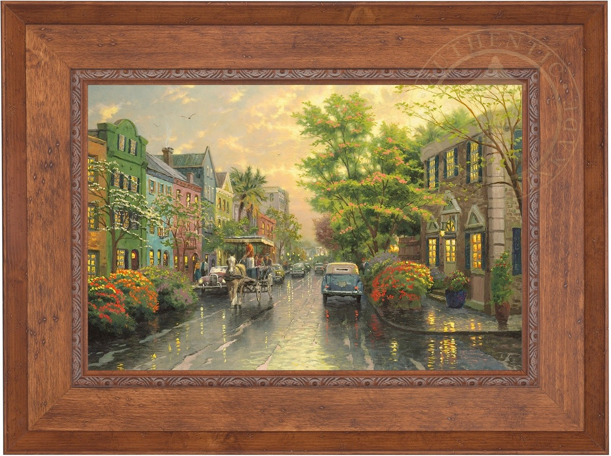 Call UsThe Kinkade family delights in travel. One of our recurring discoveries is Charleston, South Carolina, where the heart of the Old South lives on. The feeling that I get when I visit Charleston is nostalgic, romantic, as if I had somehow stepped back in time. So, as I worked on my studio treatment of Charleston, Sunset on Rainbow Row, I've filled my streets with vintage cars and passersby wearing simple yet timeless garb. Step aboard the horse-drawn carriage for a leisurely visit to Rainbow Row!