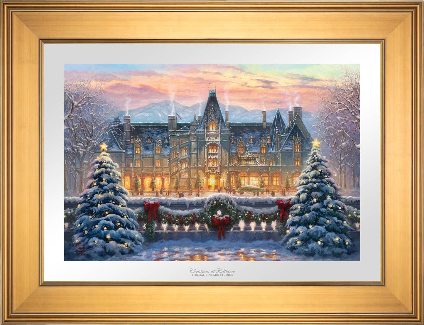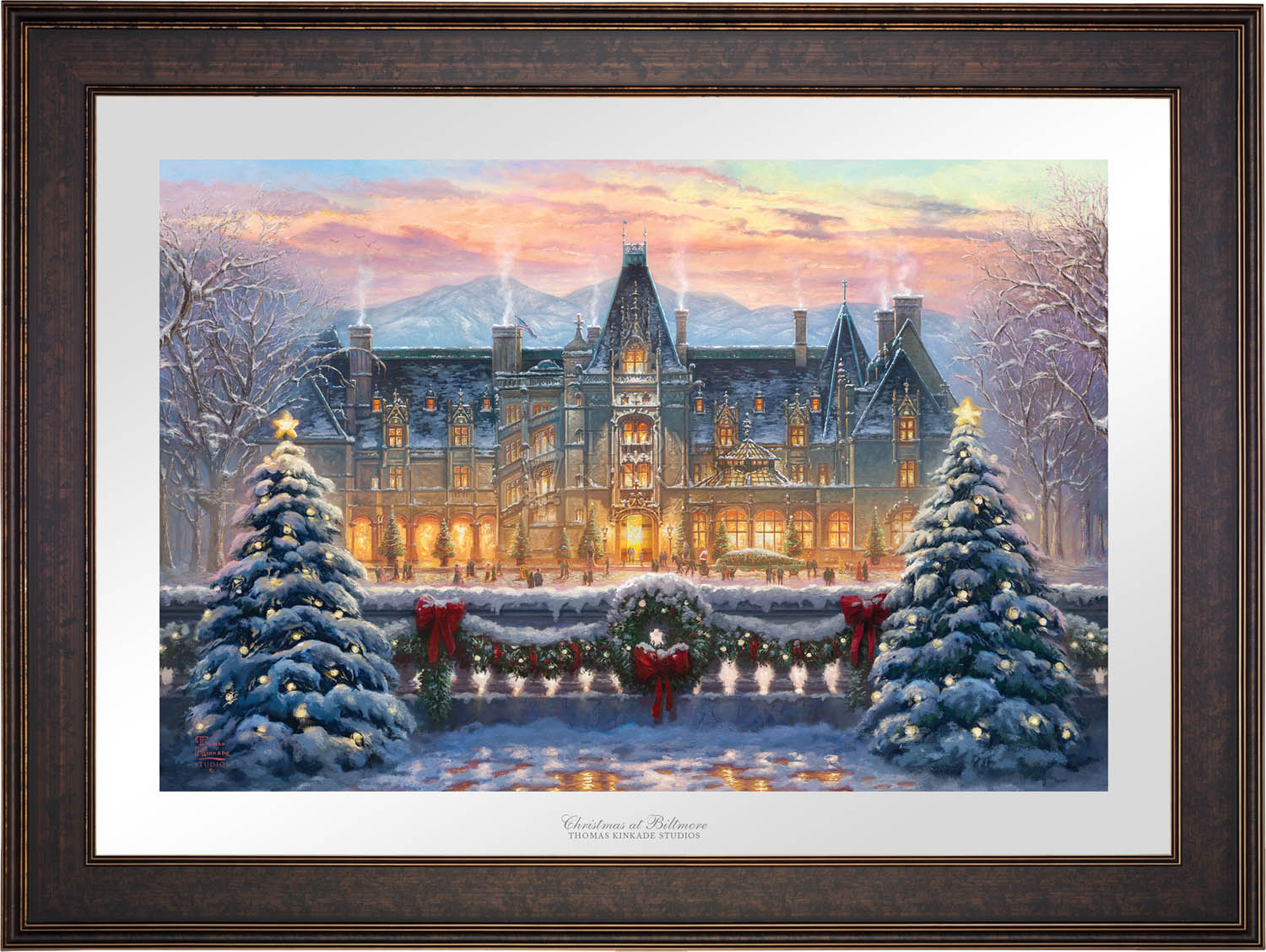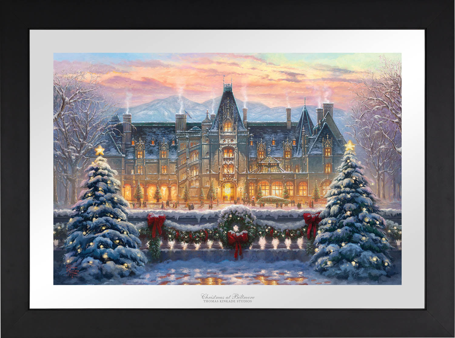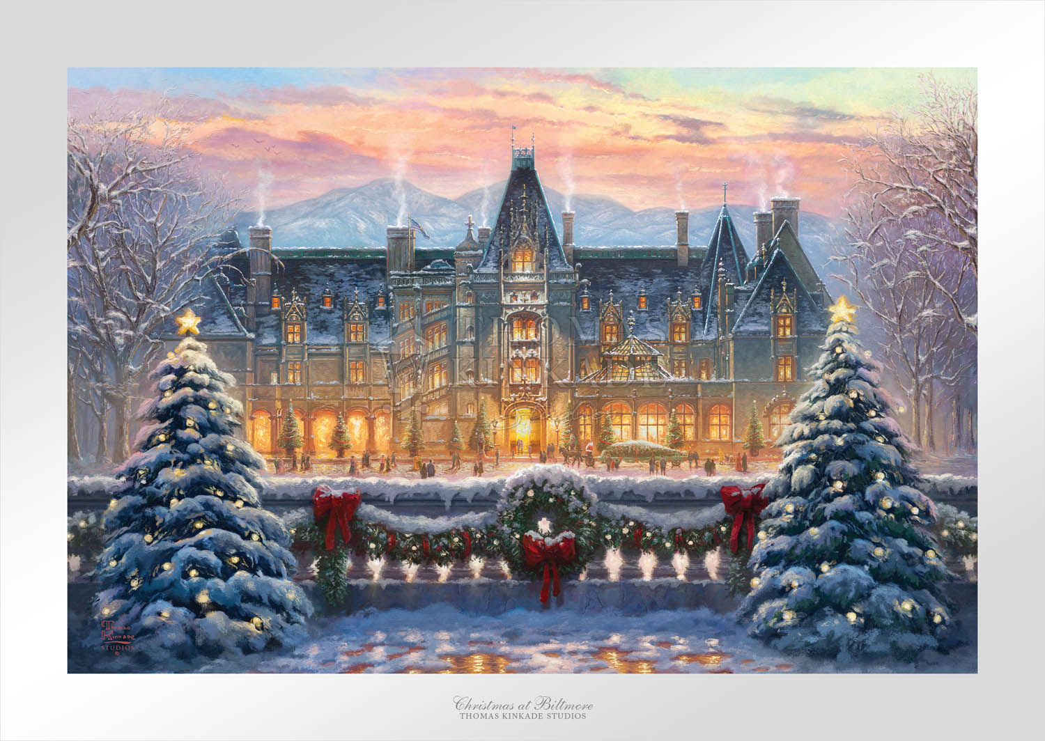 The Christmas season is the most magical time of the year. Of all the places to enjoy the Yule-tide spirit, there is none quite as wonderful as Biltmore. To visit the majestic chateau built by George Vanderbilt in 1895 is a profoundly inspiring experience. From the renowned architecture to the awe-inspiring gardens and vistas of the Blue Ridge Mountains, there is no part of this national treasure that does not touch the guest's heart.Inside and out, from every angle and in every room, the house is made festive in a style and manner that dates back over a hundred years. Santa leads the procession as a horse drawn carriage approaches the house, bringing along a tall Frasier Fir destined to be festooned and decorated in the mansion's Banquet Hall. Estate pastry chefs keep the annual tradition of creating a grand scale gingerbread house of Biltmore covered in sweet treats down to the smallest detail. Smells of freshly cut garland and pine wreaths mingle in the air with the scents of warmly burning hearths and the hundreds of poinsettias highlighting the lavish decor. In each room, the light of the season drawn from candles and the sparkle of ornaments dance in the shadows and in the eyes of welcomed guests.Let this masterwork, Christmas at Biltmore®, excite your own memories of the holiday season both at the estate and from your own home and family holiday traditions. From everyone at the Thomas Kinkade Studios, we thank you for sharing the light and wish you a very merry Christmas.
