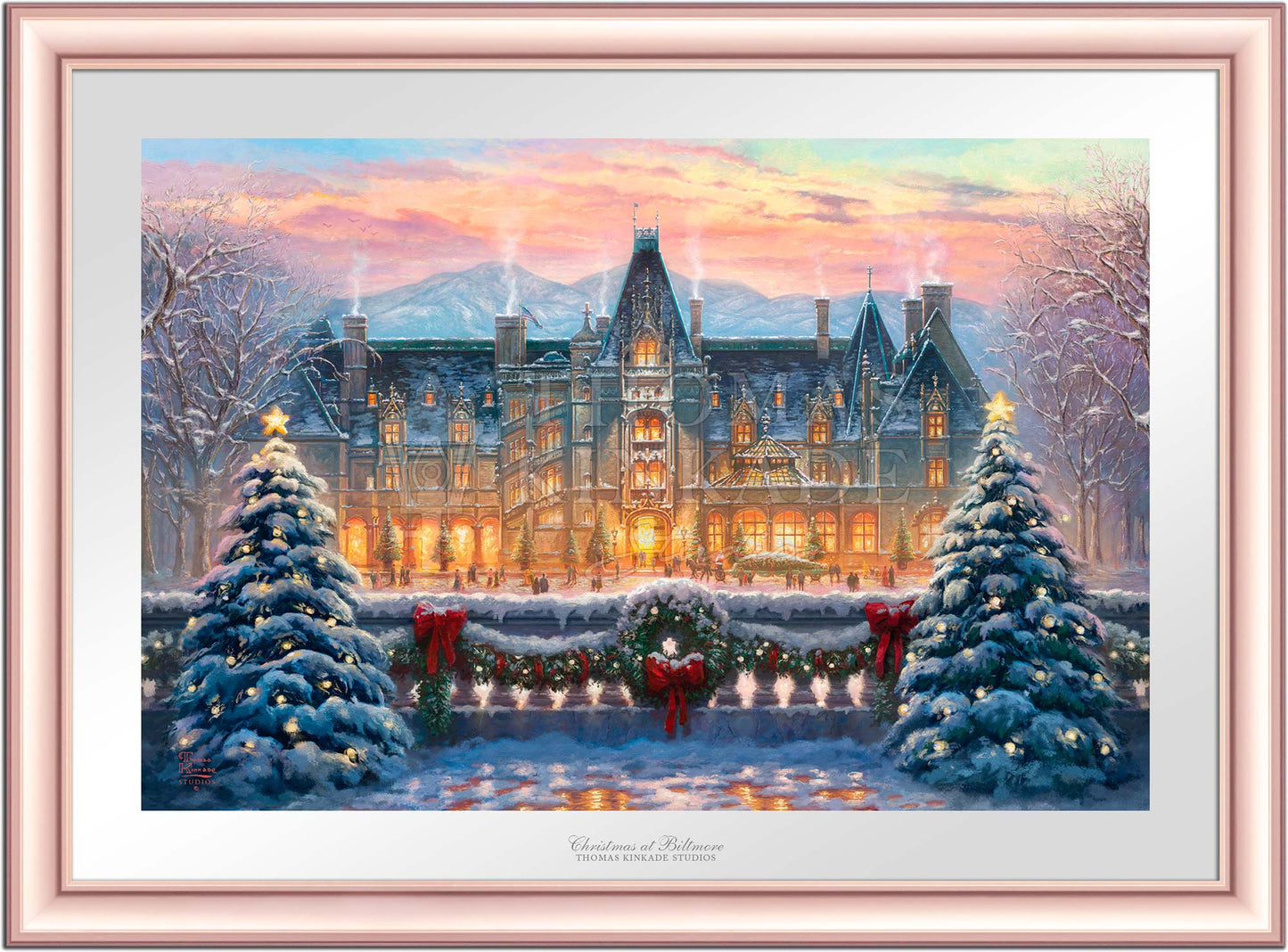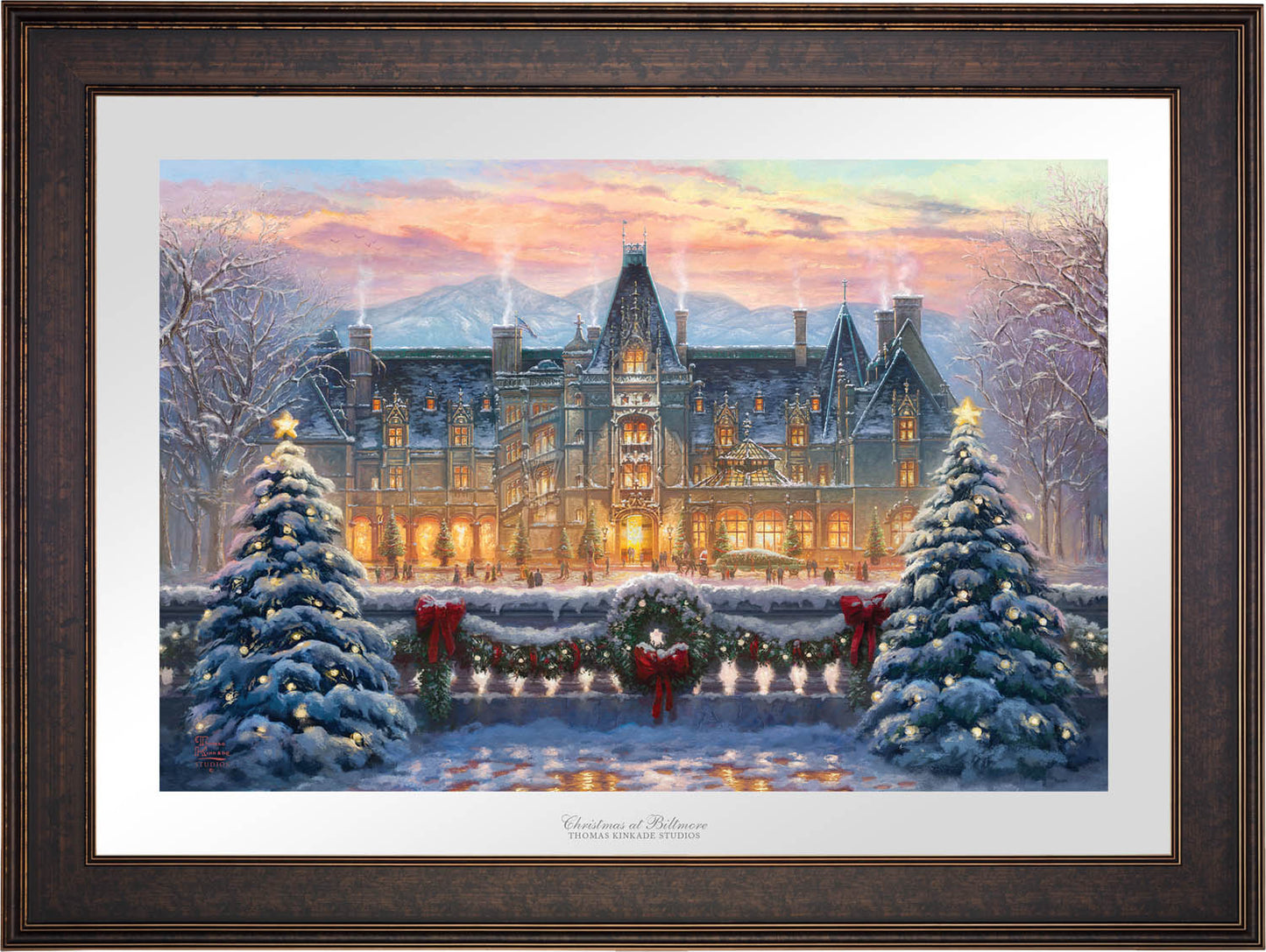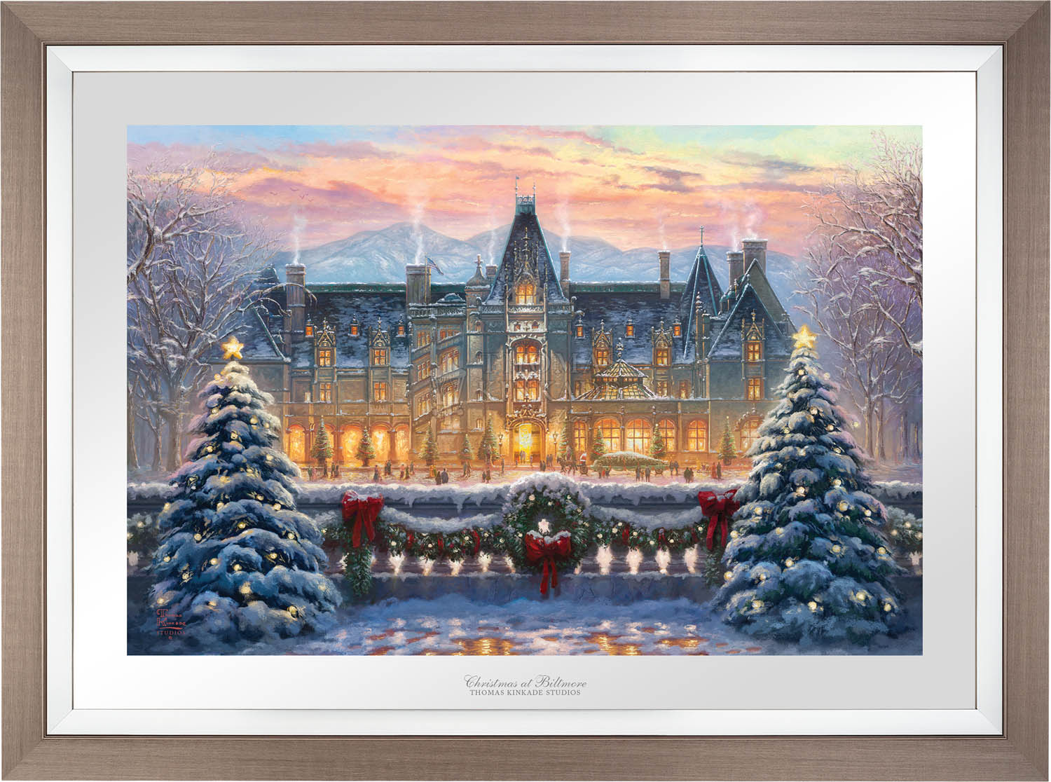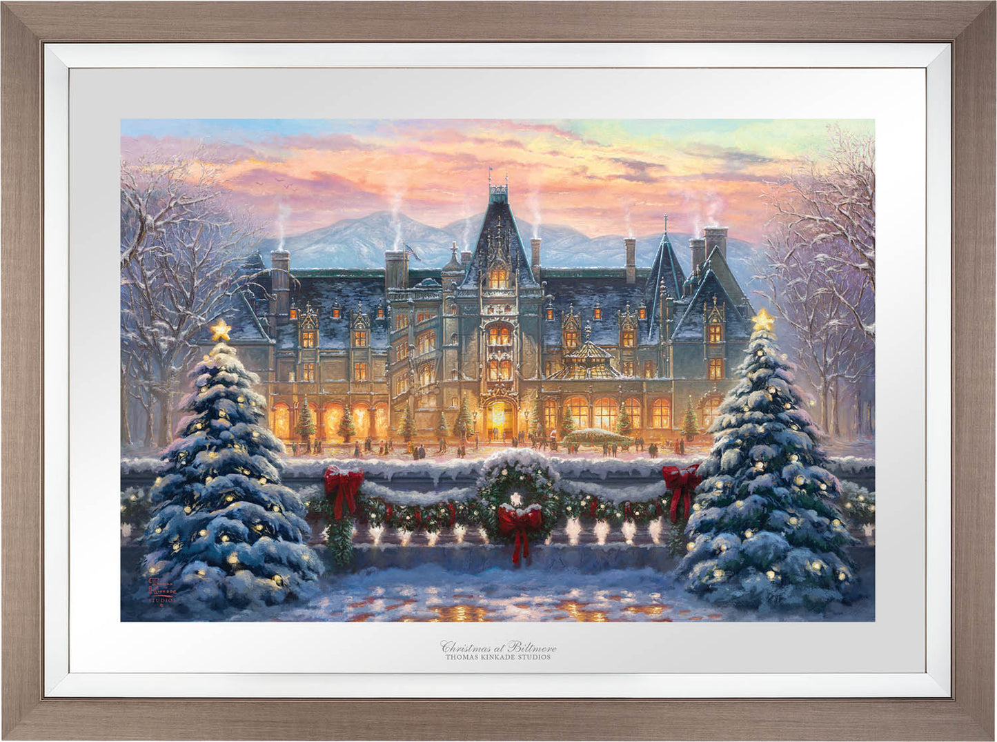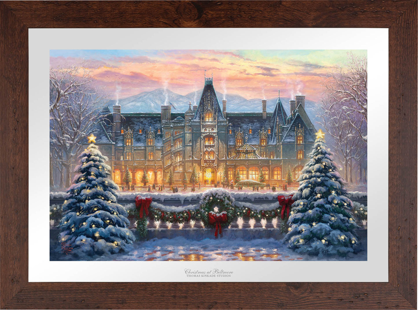 The Christmas season is the most magical time of the year. Of all the places to enjoy the Yule-tide spirit, there is none quite as wonderful as Biltmore. To visit the majestic chateau built by George Vanderbilt in 1895 is a profoundly inspiring experience. From the renowned architecture to the awe-inspiring gardens and vistas of the Blue Ridge Mountains, there is no part of this national treasure that does not touch the guest's heart.Inside and out, from every angle and in every room, the house is made festive in a style and manner that dates back over a hundred years. Santa leads the procession as a horse drawn carriage approaches the house, bringing along a tall Frasier Fir destined to be festooned and decorated in the mansion's Banquet Hall. Estate pastry chefs keep the annual tradition of creating a grand scale gingerbread house of Biltmore covered in sweet treats down to the smallest detail. Smells of freshly cut garland and pine wreaths mingle in the air with the scents of warmly burning hearths and the hundreds of poinsettias highlighting the lavish decor. In each room, the light of the season drawn from candles and the sparkle of ornaments dance in the shadows and in the eyes of welcomed guests.Let this masterwork, Christmas at Biltmore®, excite your own memories of the holiday season both at the estate and from your own home and family holiday traditions. From everyone at the Thomas Kinkade Studios, we thank you for sharing the light and wish you a very merry Christmas.