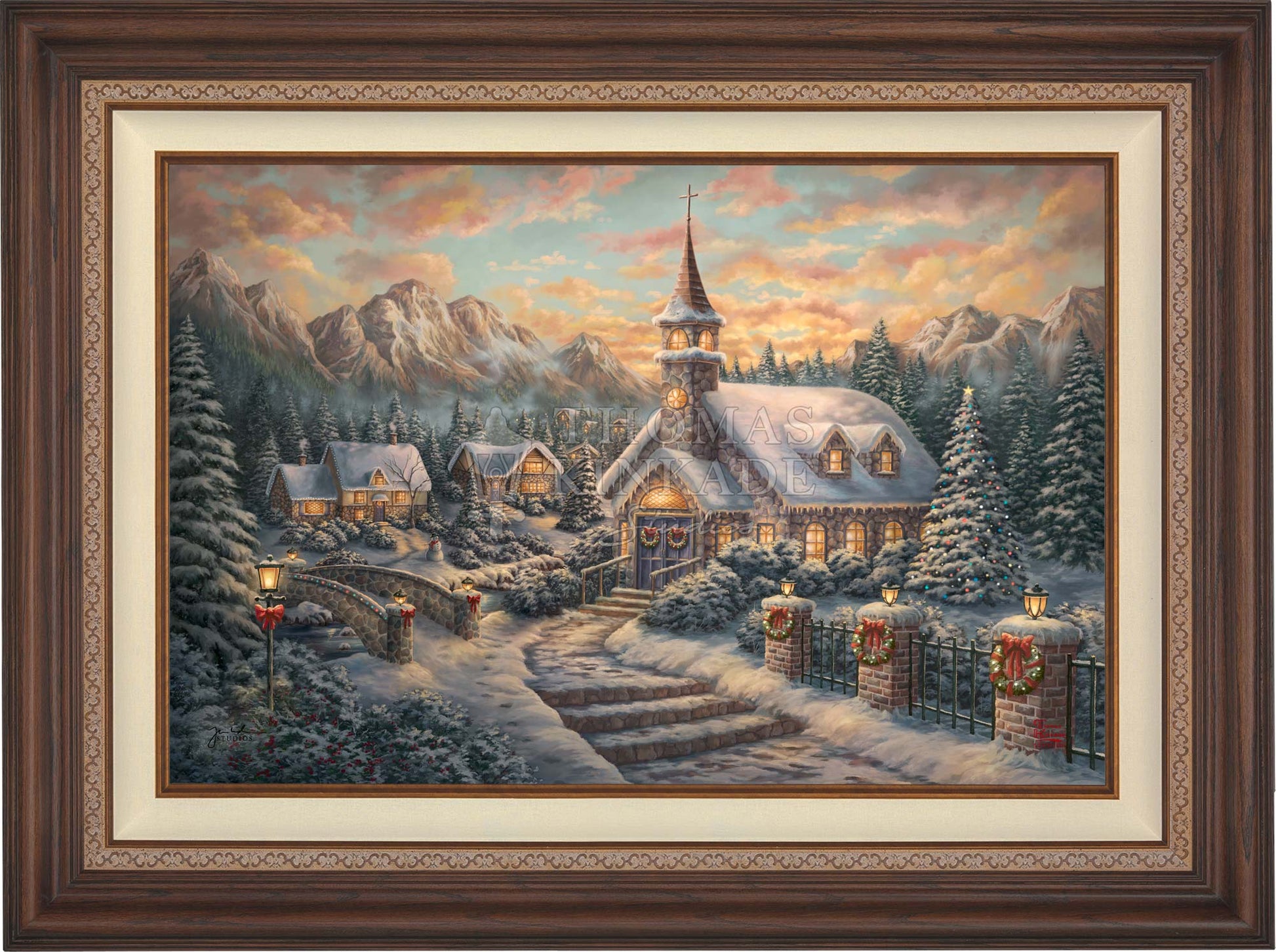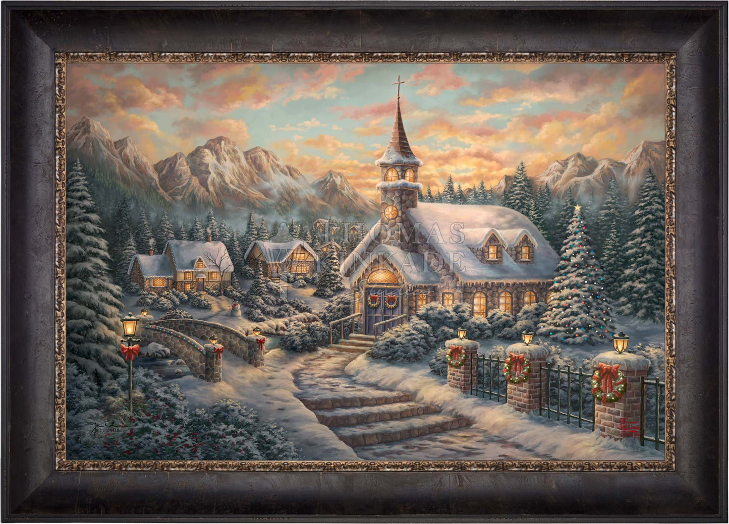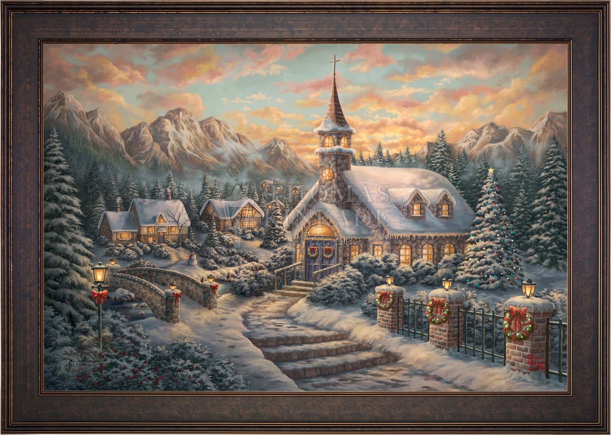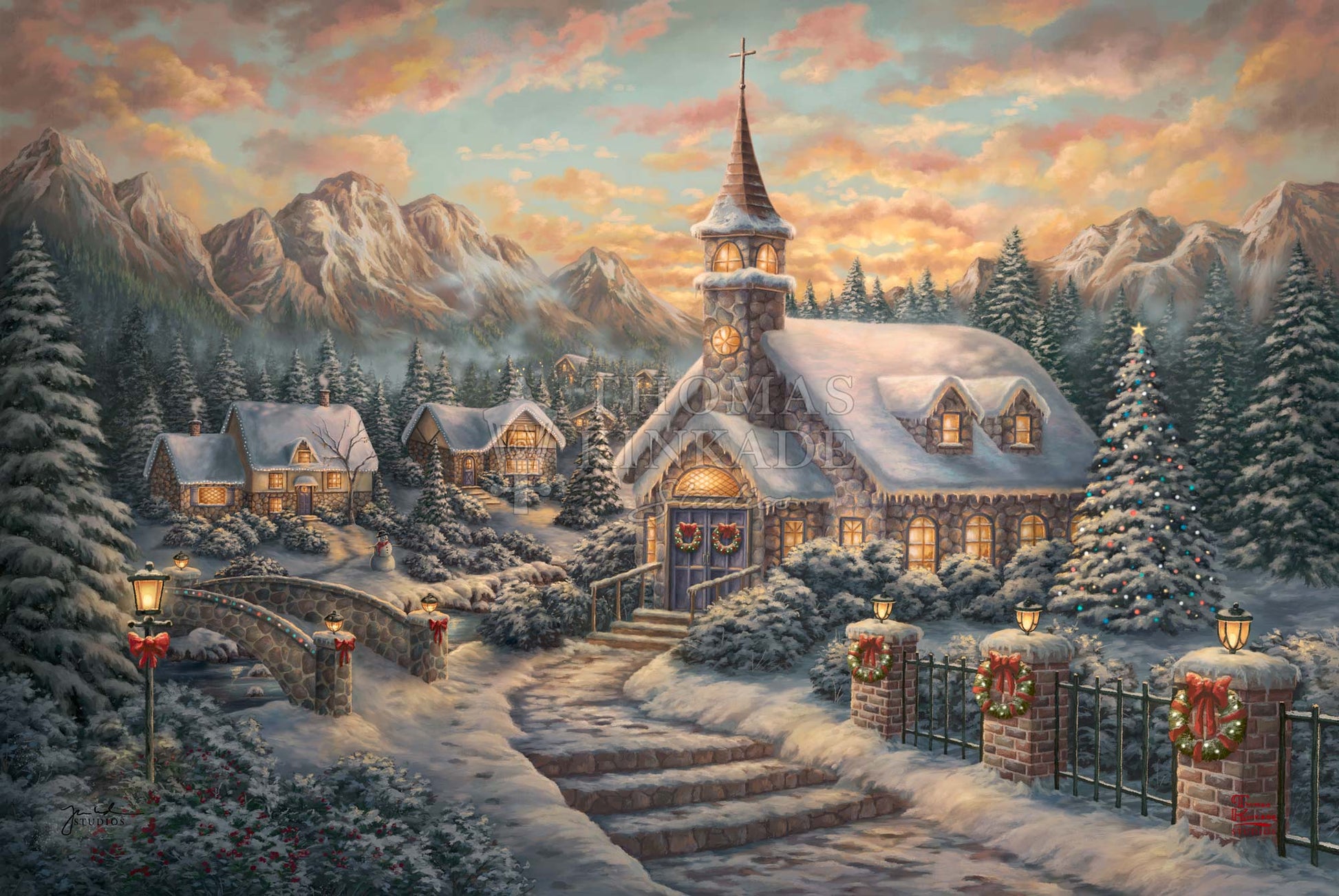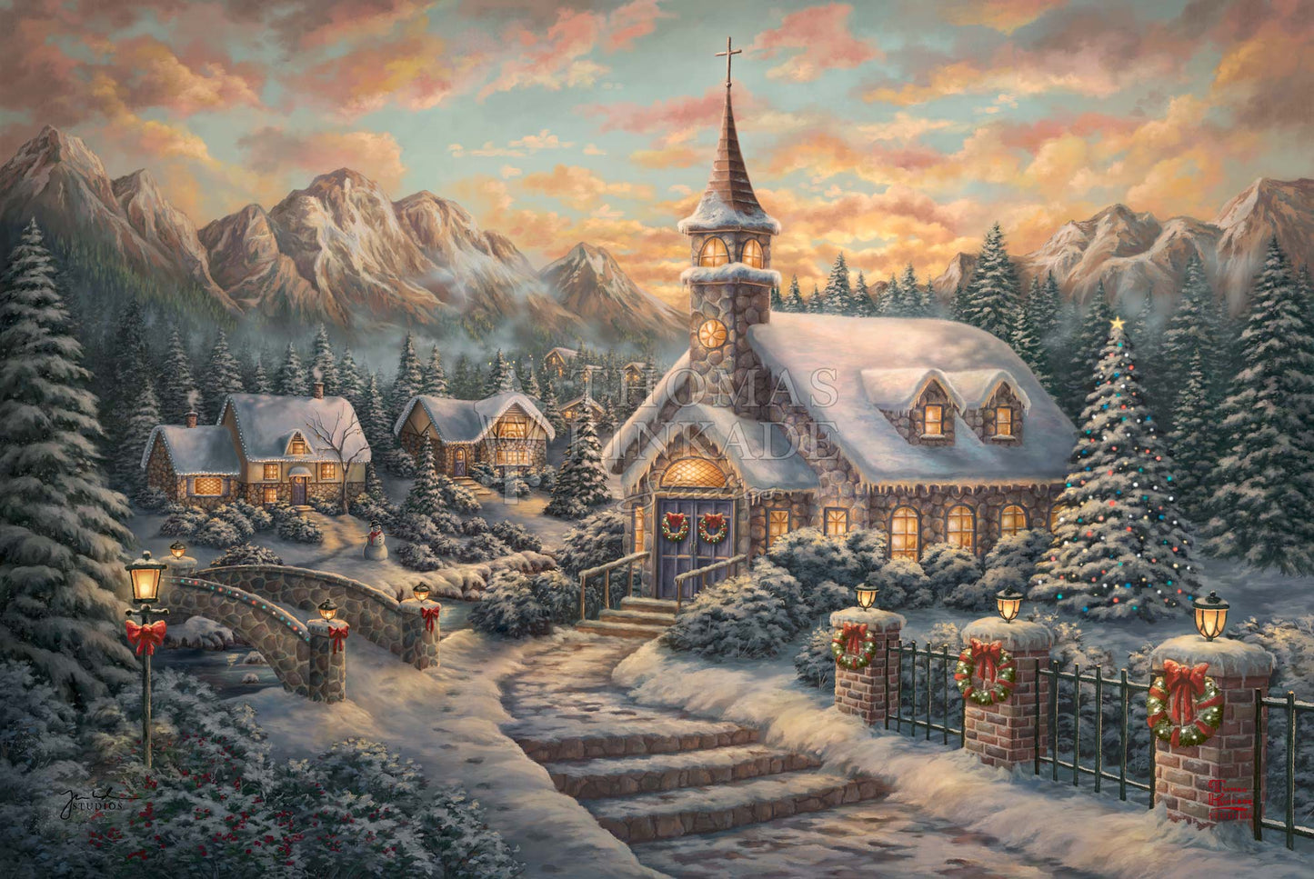 Beneath the mountains, and nestled in a valley, is a quiet village where families have come together over time in friendship and love, and to worship in the quaint church. A warm glow from the sun casts a soft sheen on the shroud of snow that sits gracefully on the ground and highlights the snowman who stands vigil and embodies the very spirit of the season. Join Thomas Kinkade Studios and take a walk through this charming village, and possibly attend a Christmas Service.