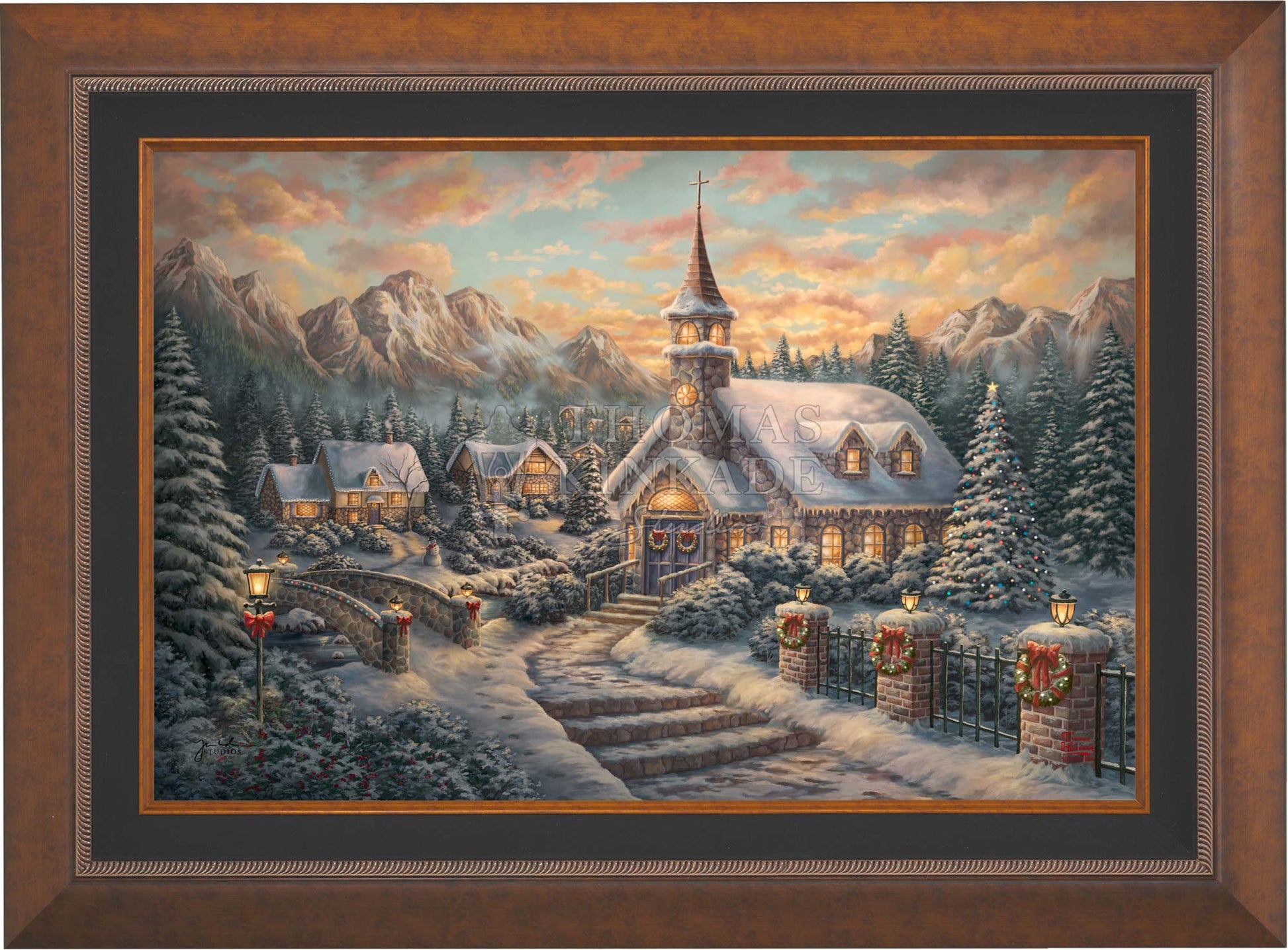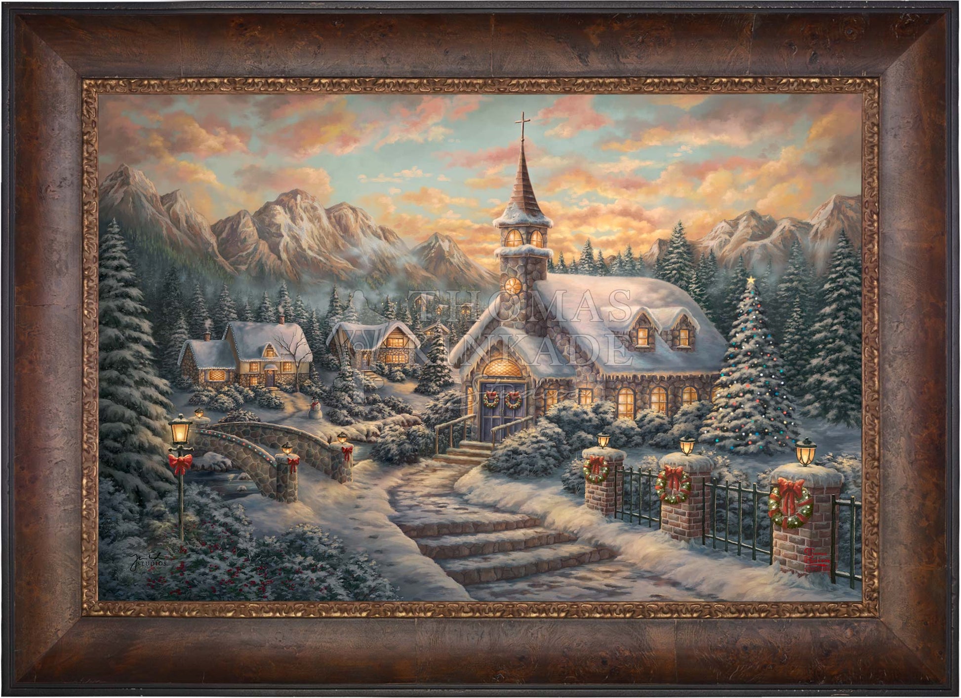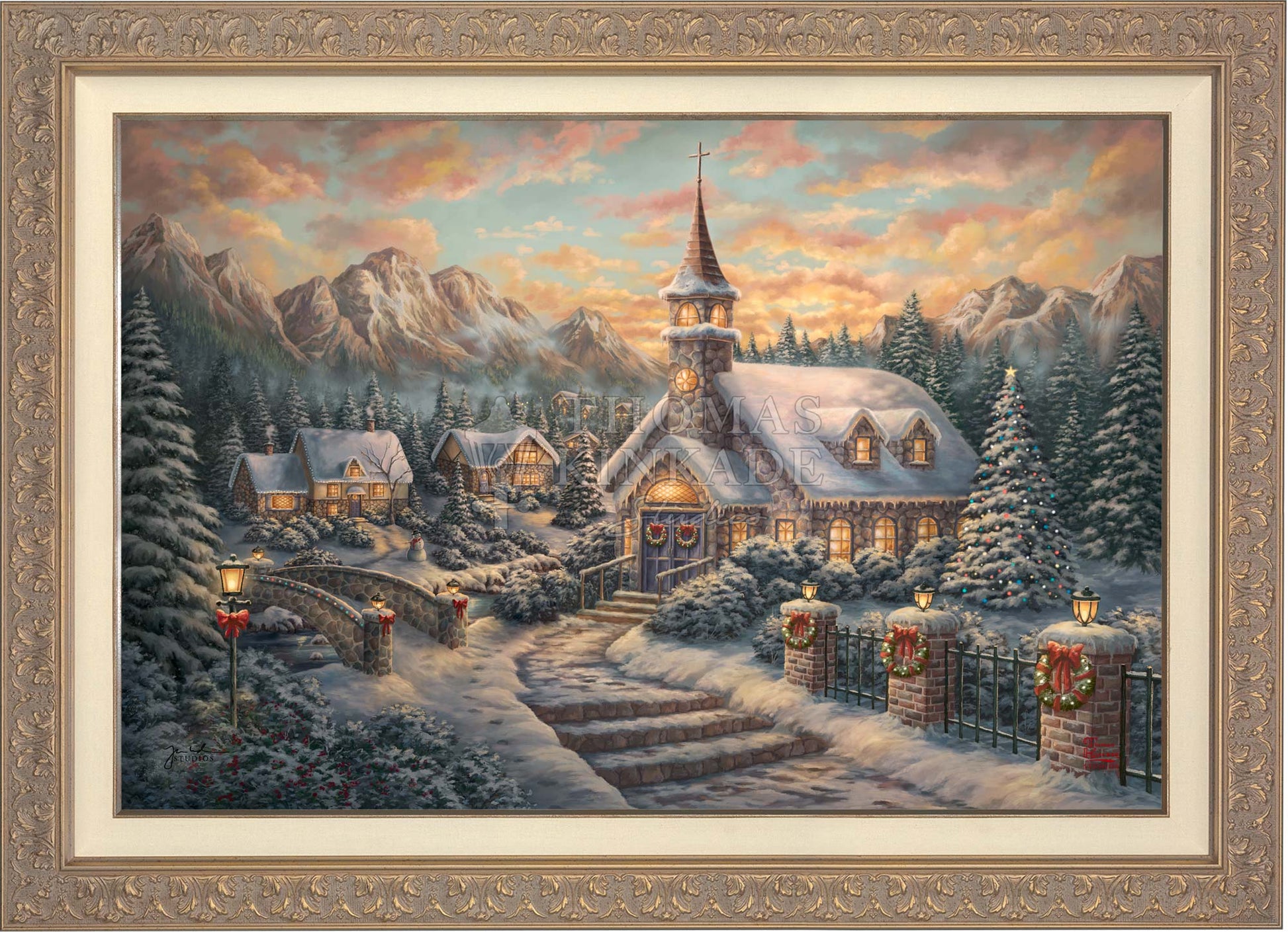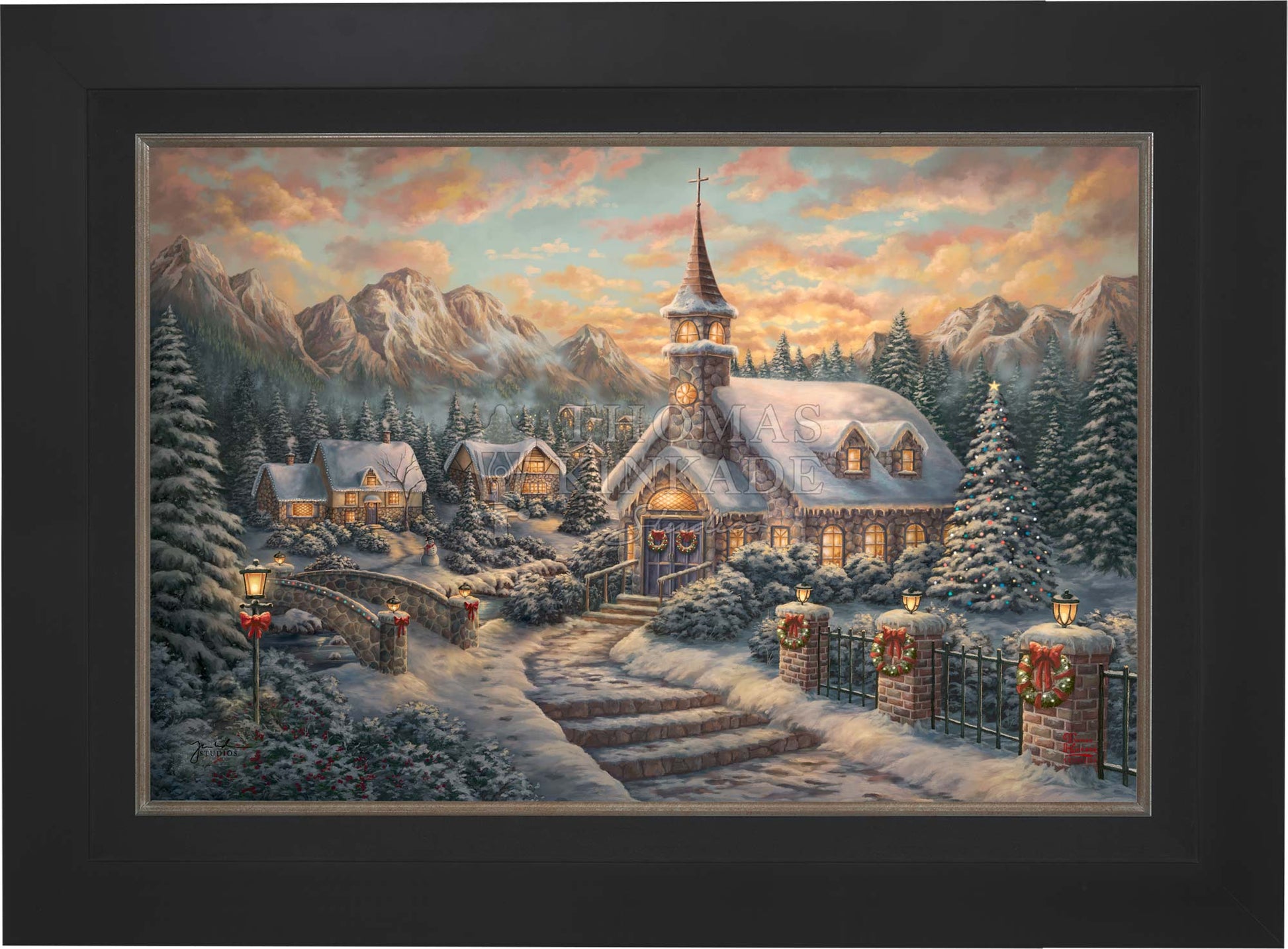 Beneath the mountains, and nestled in a valley, is a quiet village where families have come together over time in friendship and love, and to worship in the quaint church. A warm glow from the sun casts a soft sheen on the shroud of snow that sits gracefully on the ground and highlights the snowman who stands vigil and embodies the very spirit of the season. Join Thomas Kinkade Studios and take a walk through this charming village, and possibly attend a Christmas Service.