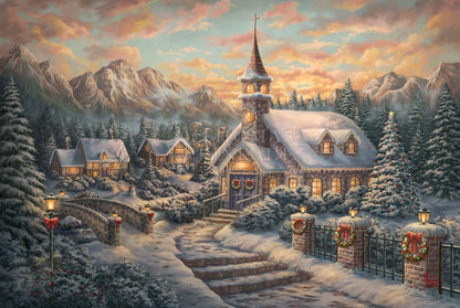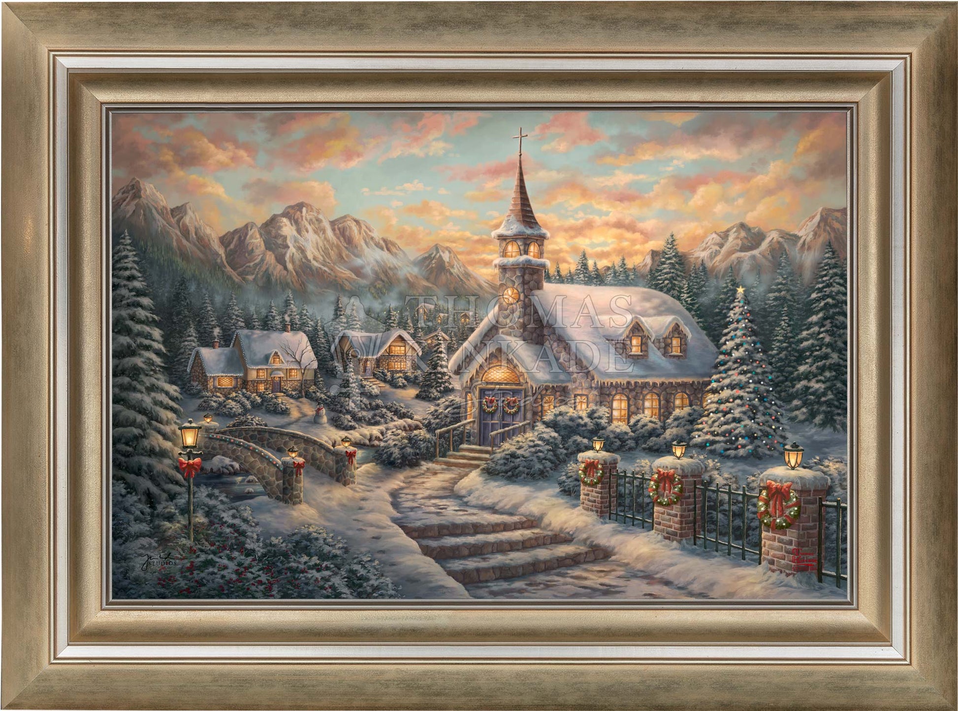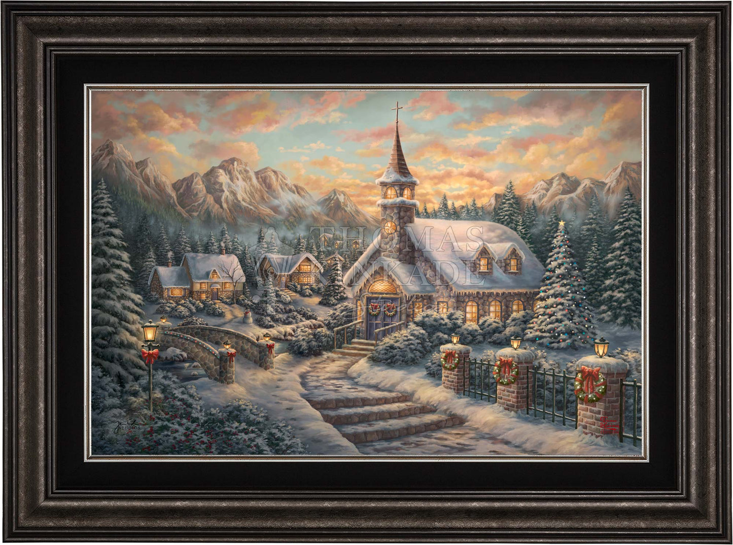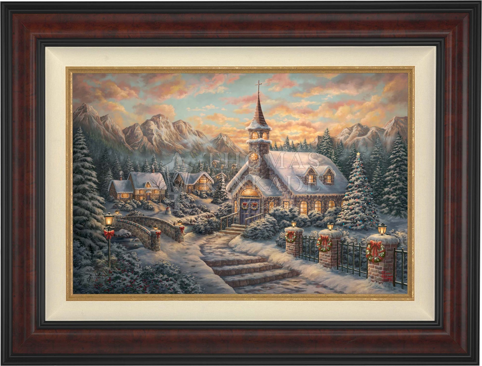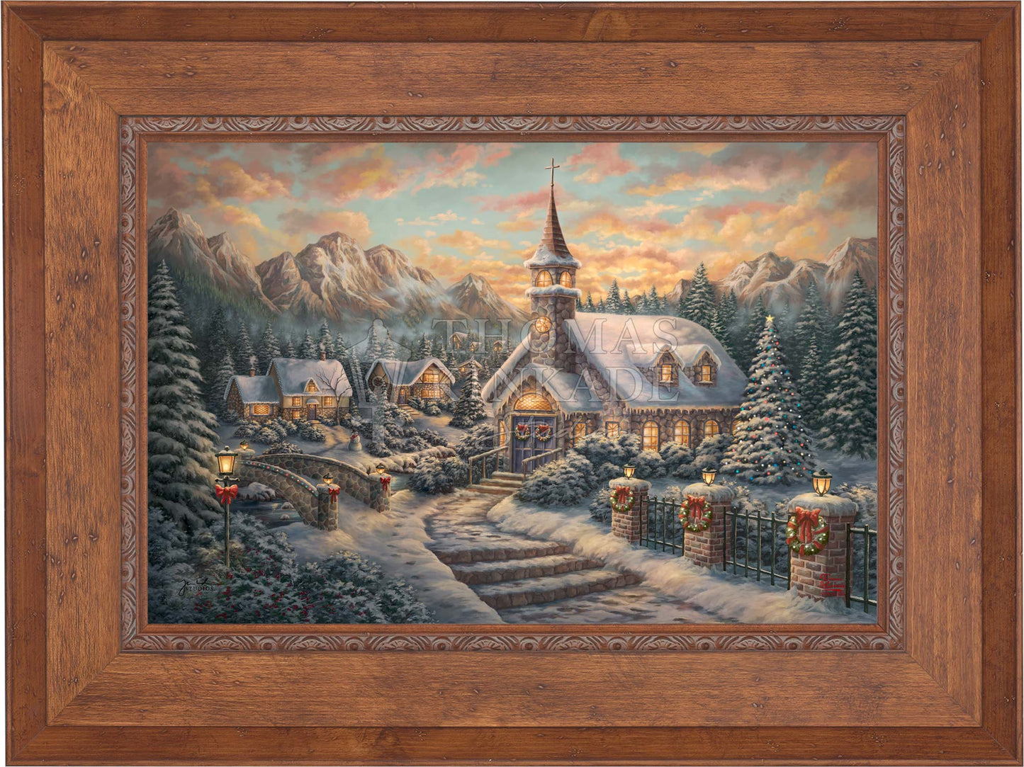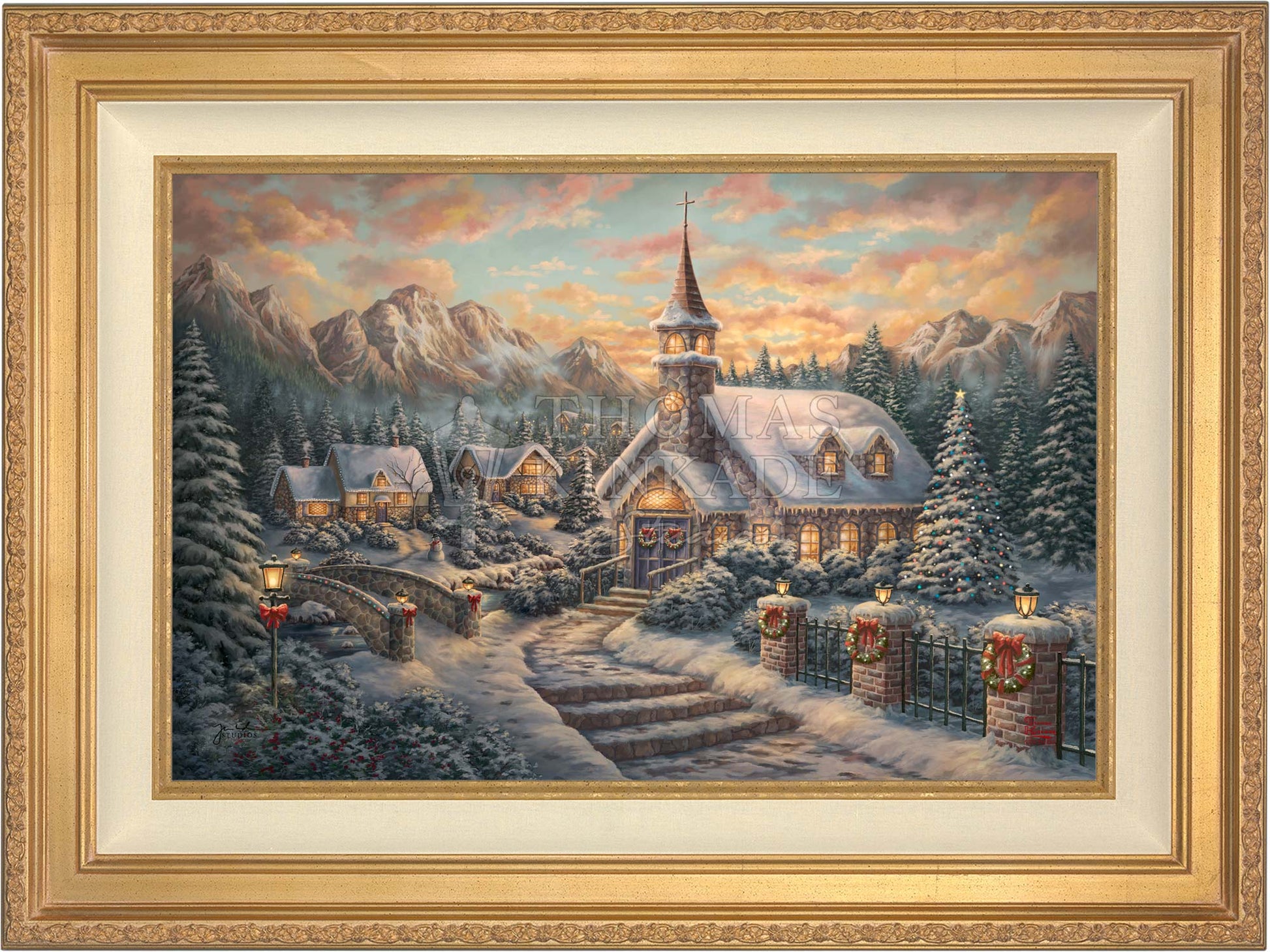 Beneath the mountains, and nestled in a valley, is a quiet village where families have come together over time in friendship and love, and to worship in the quaint church. A warm glow from the sun casts a soft sheen on the shroud of snow that sits gracefully on the ground and highlights the snowman who stands vigil and embodies the very spirit of the season. Join Thomas Kinkade Studios and take a walk through this charming village, and possibly attend a Christmas Service.